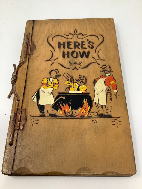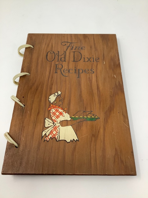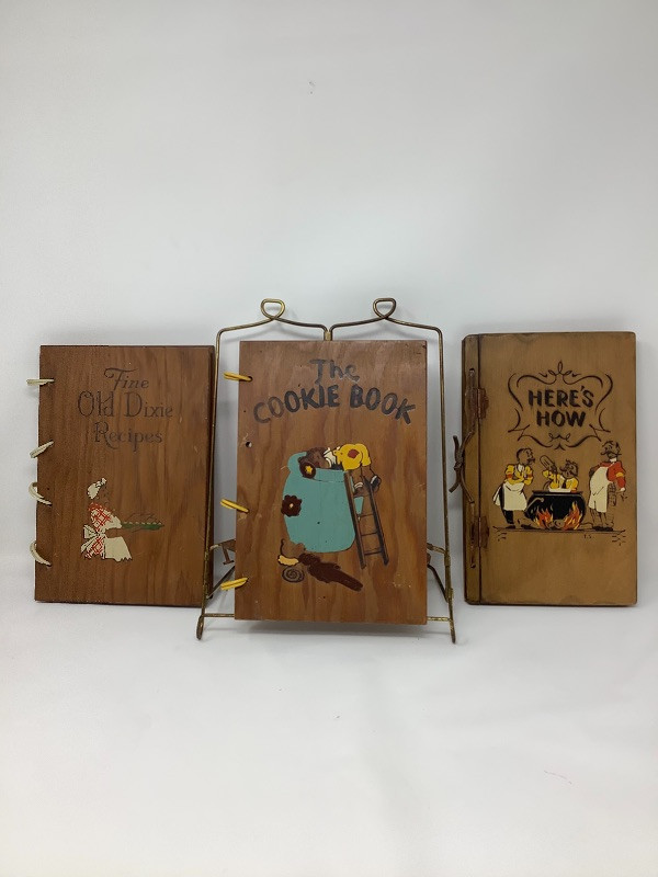 Three Antique Cook Books and One Book Stand. Made with wooden covers Published in 1930’s and 40’s. Note rings missing on one book