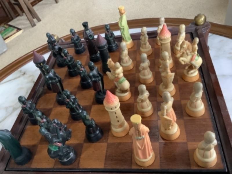 Chess pieces are wooden,and store inside of box. Box measures 16”x16”