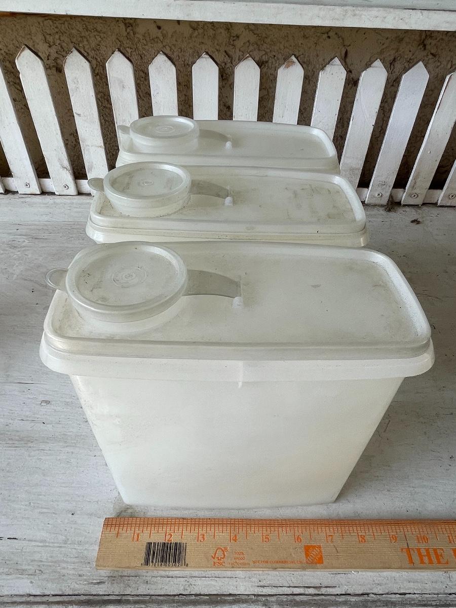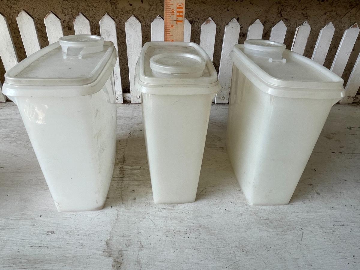 Set of three vintage Tupperware white plastic containers. Fair condition, all have lids with pour spout opening.