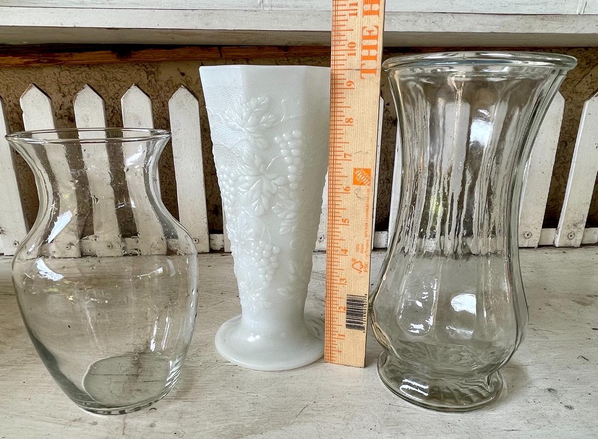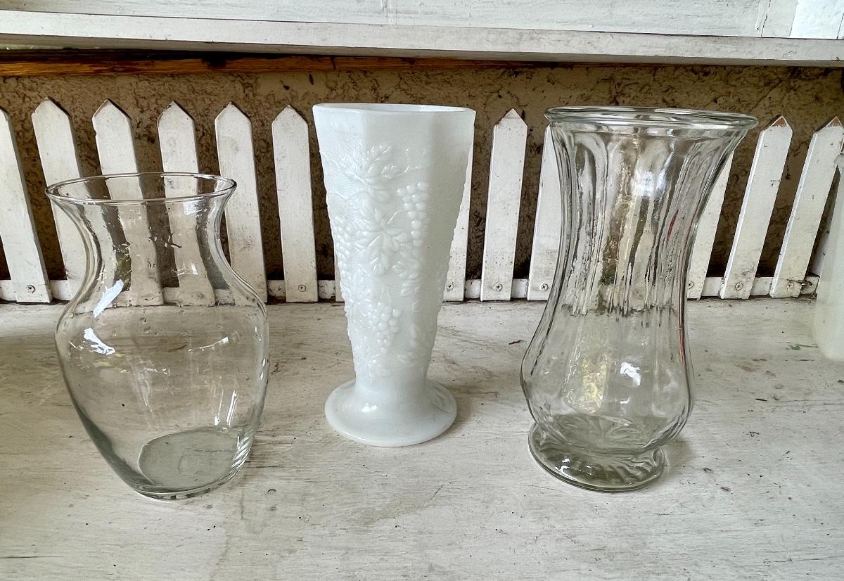 Lot of three glass vase, two clear, one milk glass. Good condition.