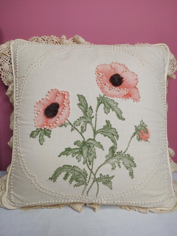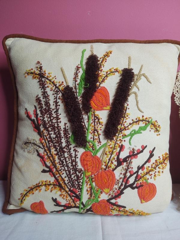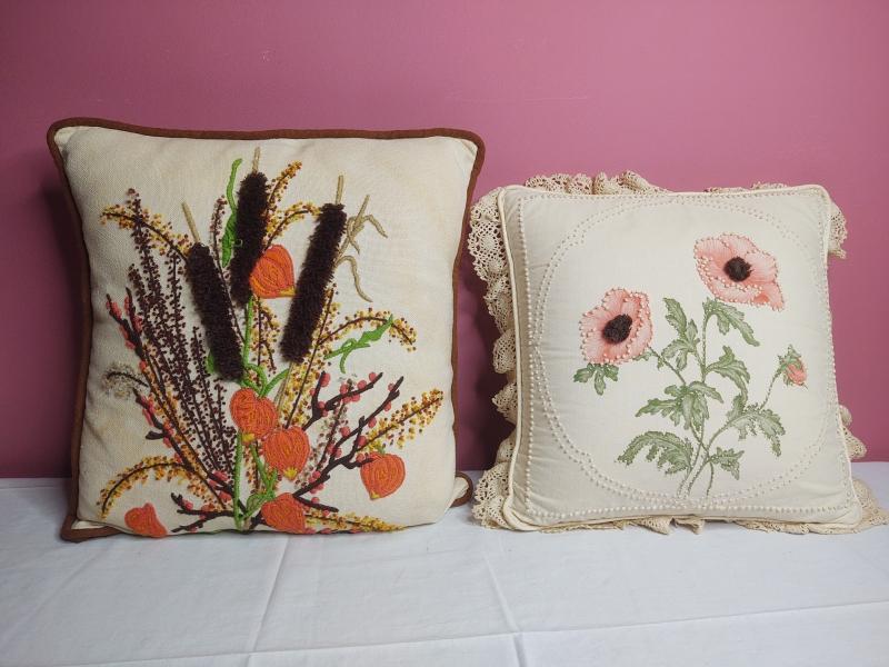Needlepoint throw pillows. One has a pattern behind it and the other is freehand stitched.