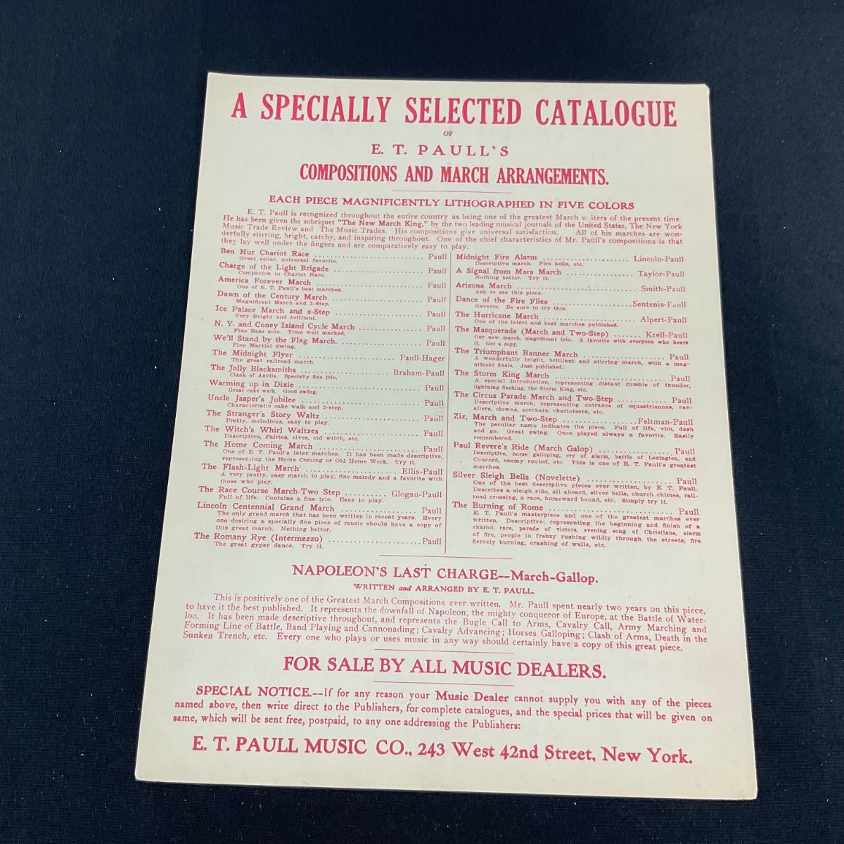 One E.T. PAULL Napoleon’s Last Charge By Edw. Ellis Arranged By E.T. Paull piece of Sheet Music. Please see photos for details and condition. Any condition statement is given as a courtesy to a client, is an opinion, and should not be treated as a statement of fact. Reference to condition written, oral or within a condition report shall not be regarded as a full account of condition and may not include all defects, alterations, or restorations. Absence of a condition report does not imply a lot is flawless or lacking imperfections or damage. Katherine’s Auction & Appraisal Service shall have no responsibility for any error or omission. Returns shall not be accepted on the basis of condition. ::: Shipping is available on this lot. If you require shipping you must let us know at the close of the auction. We will coordinate with you after the item has been won. Shipping fees will include insurance up to or exceeding the value of all items being mailed. If you have any questions regarding this lot please contact the auctioneer either via this website, by direct email or by phone. PICK UP TIMES and other important information can be found in the TERMS and DESCRIPTION of the auction. Please take a look for pertinent information. Thanks!