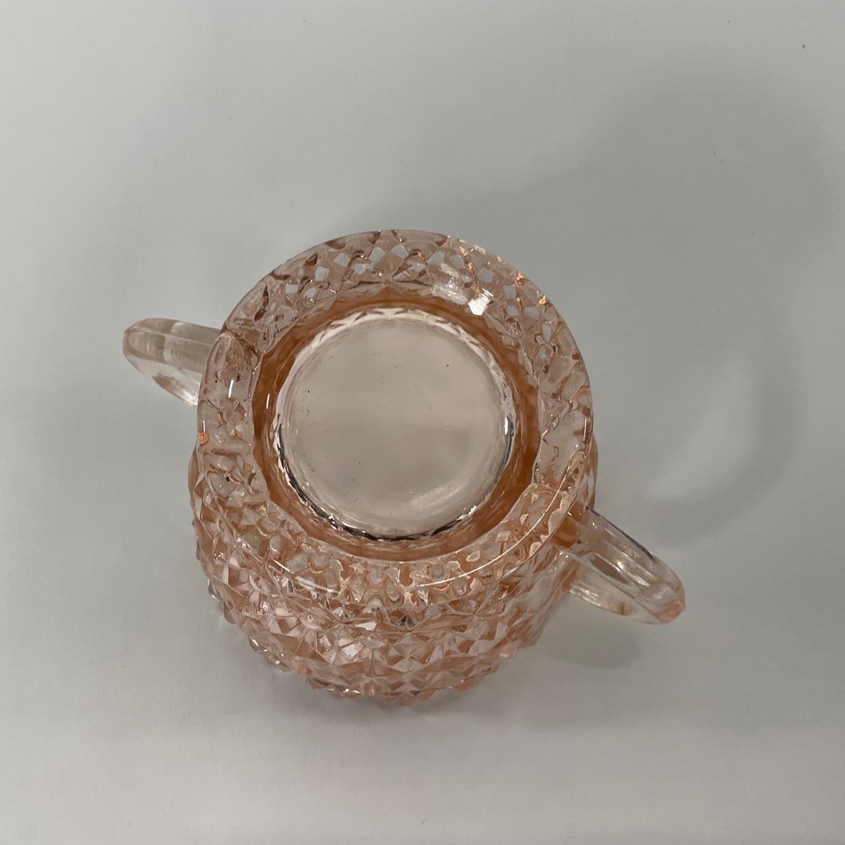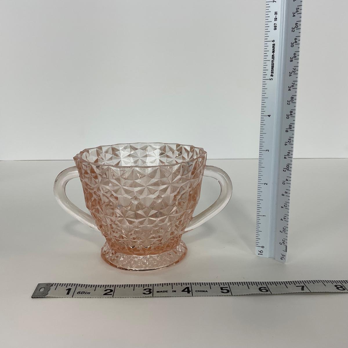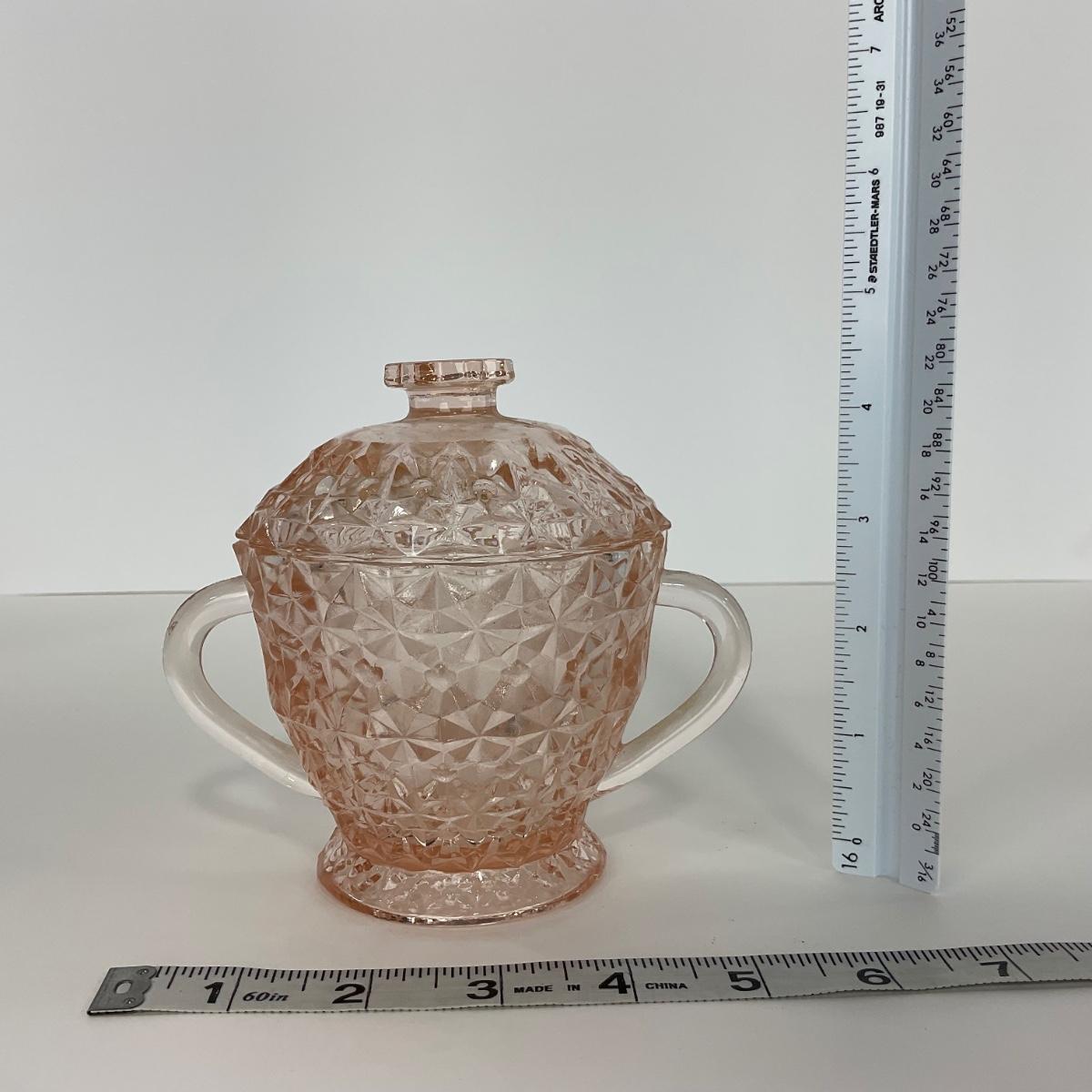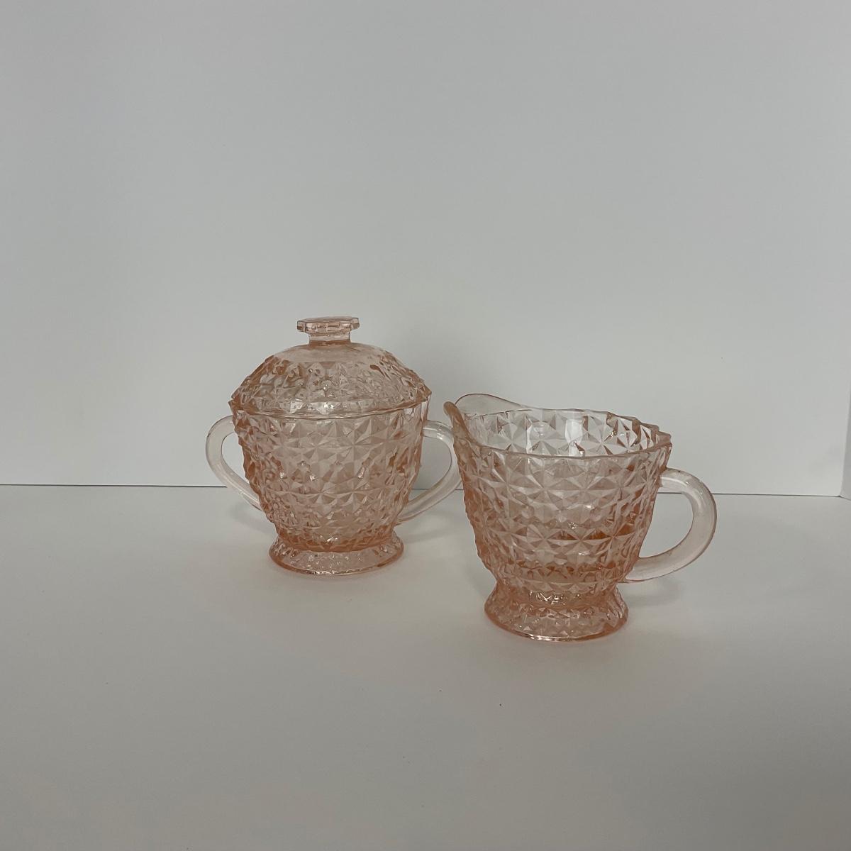 Two pieces of pink Holiday Buttons & Bows Jeanette Glass Co. (1947-1949) including one lidded sugar container and one creamer. Please see photos for details and condition. ::: Shipping is available on this lot. If you require shipping you must let us know at the close of the auction. We will coordinate with you after the item has been won. Shipping fees will include insurance up to or exceeding the value of all items being mailed. If you have any questions regarding this lot please contact the auctioneer either via this website, by direct email or by phone. PICK UP TIMES and other important information can be found in the TERMS and DESCRIPTION of the auction. Please take a look for pertinent information. Thanks!