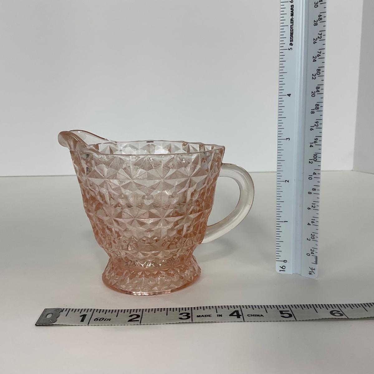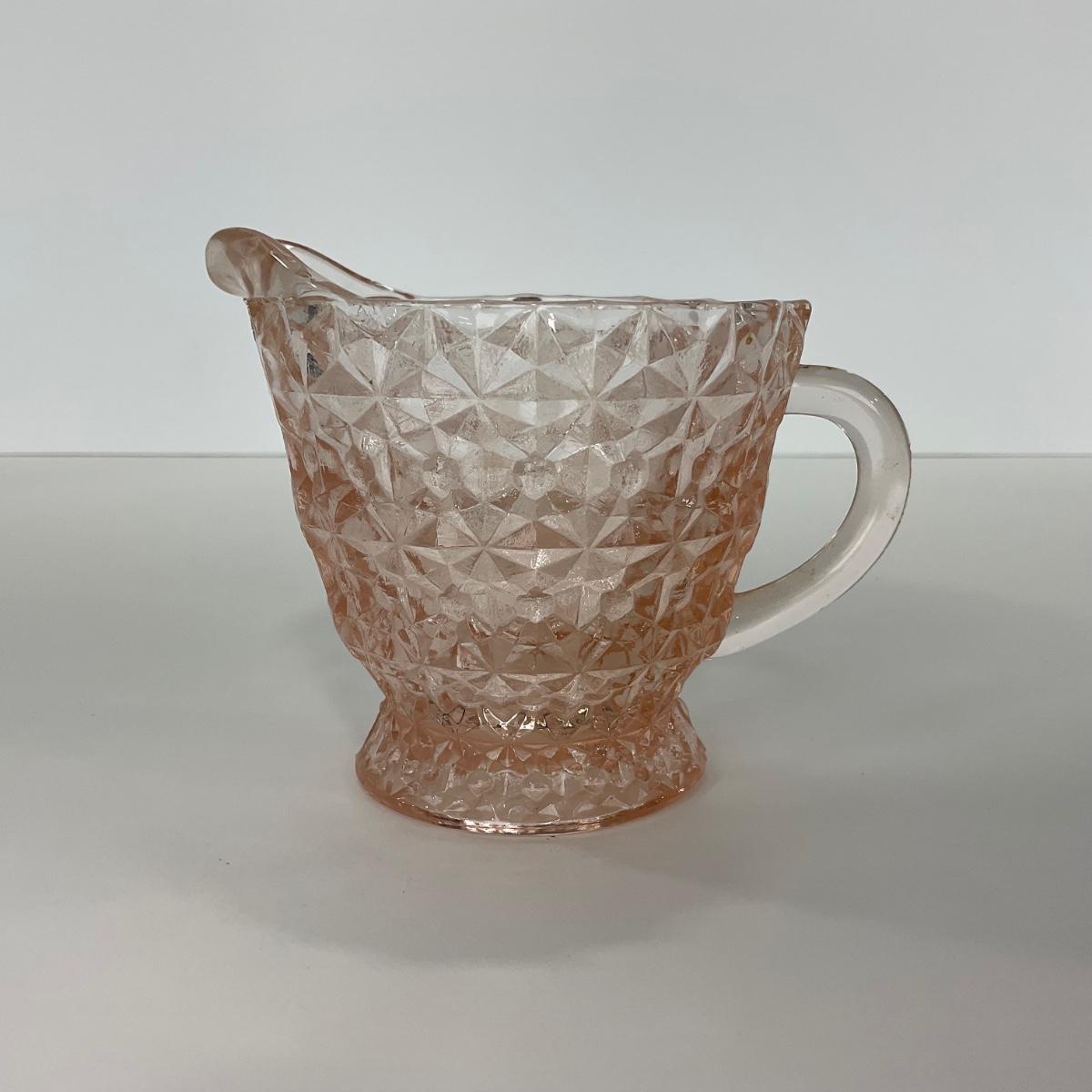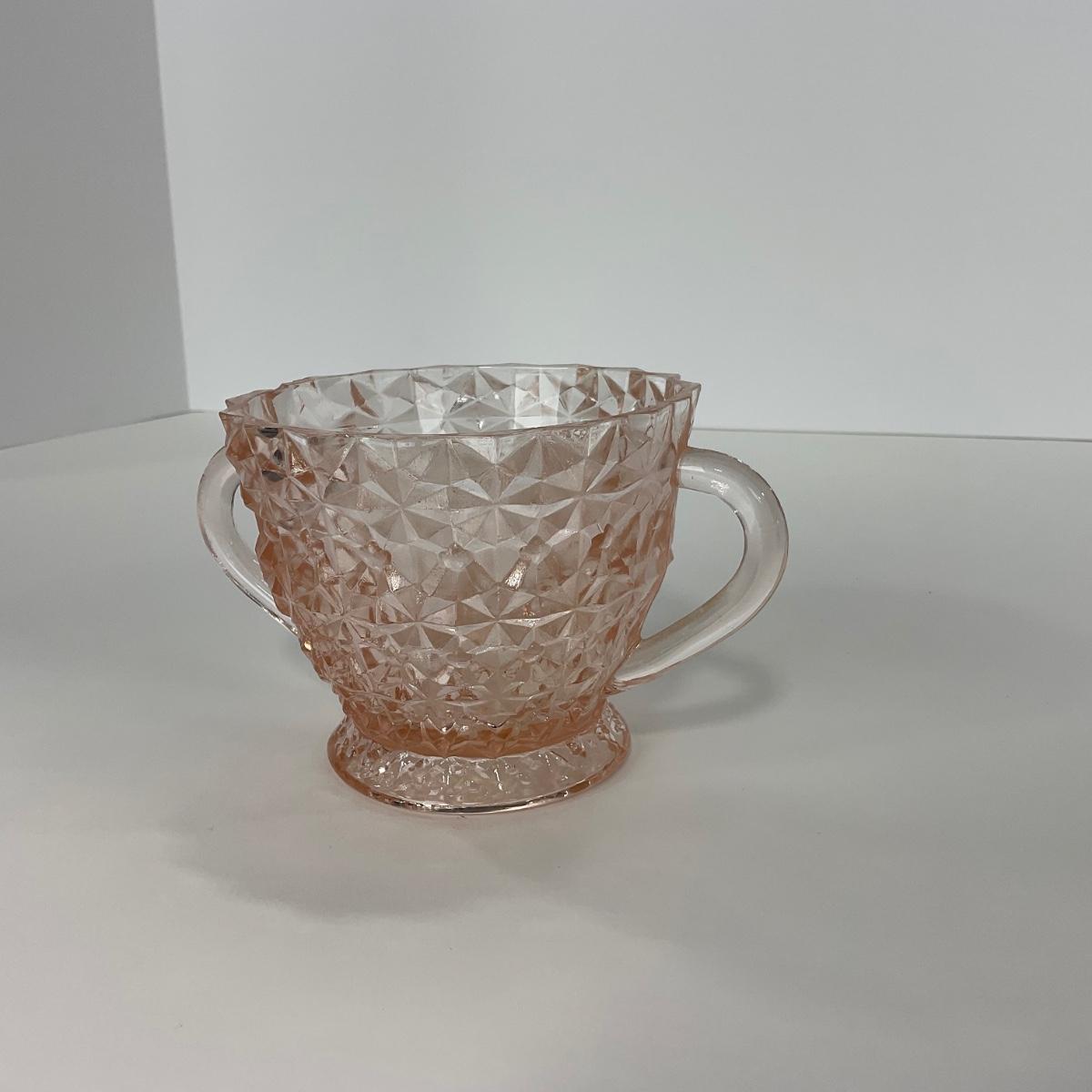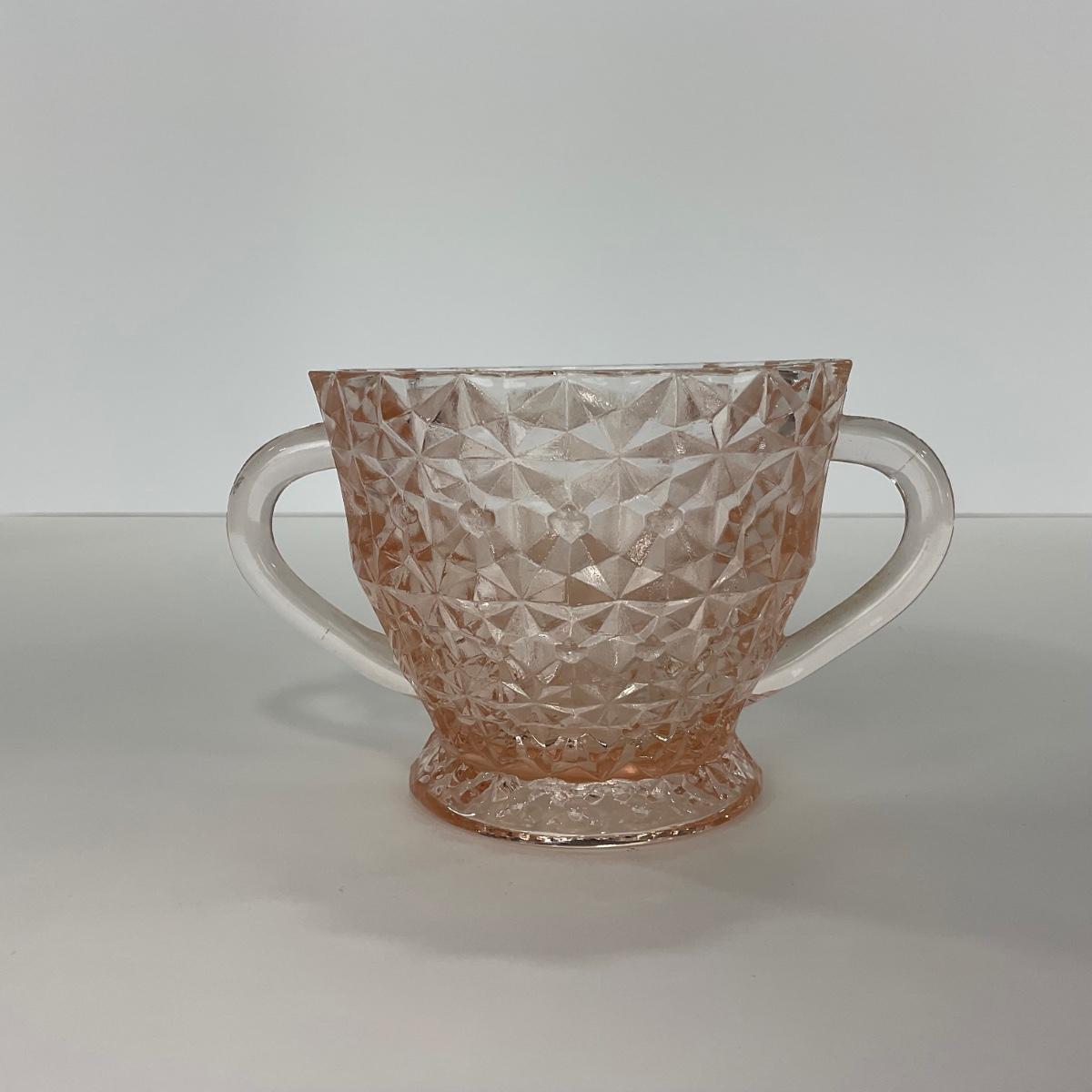 Two pieces of pink Holiday Buttons & Bows Jeanette Glass Co. (1947-1949) including one lidded sugar container and one creamer. Please see photos for details and condition. ::: Shipping is available on this lot. If you require shipping you must let us know at the close of the auction. We will coordinate with you after the item has been won. Shipping fees will include insurance up to or exceeding the value of all items being mailed. If you have any questions regarding this lot please contact the auctioneer either via this website, by direct email or by phone. PICK UP TIMES and other important information can be found in the TERMS and DESCRIPTION of the auction. Please take a look for pertinent information. Thanks!