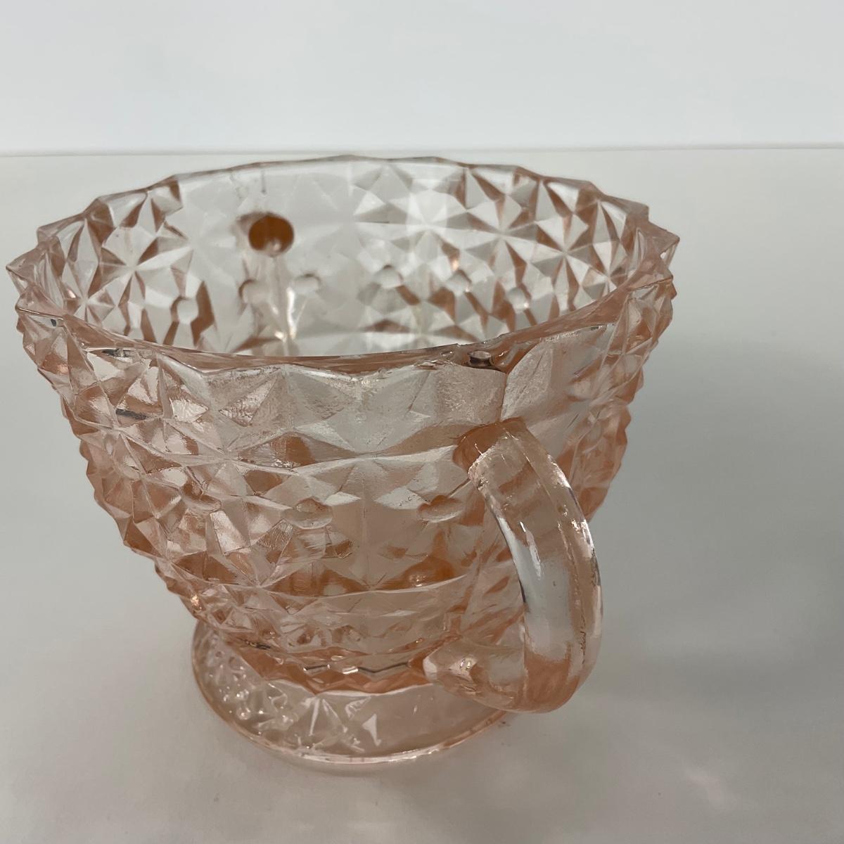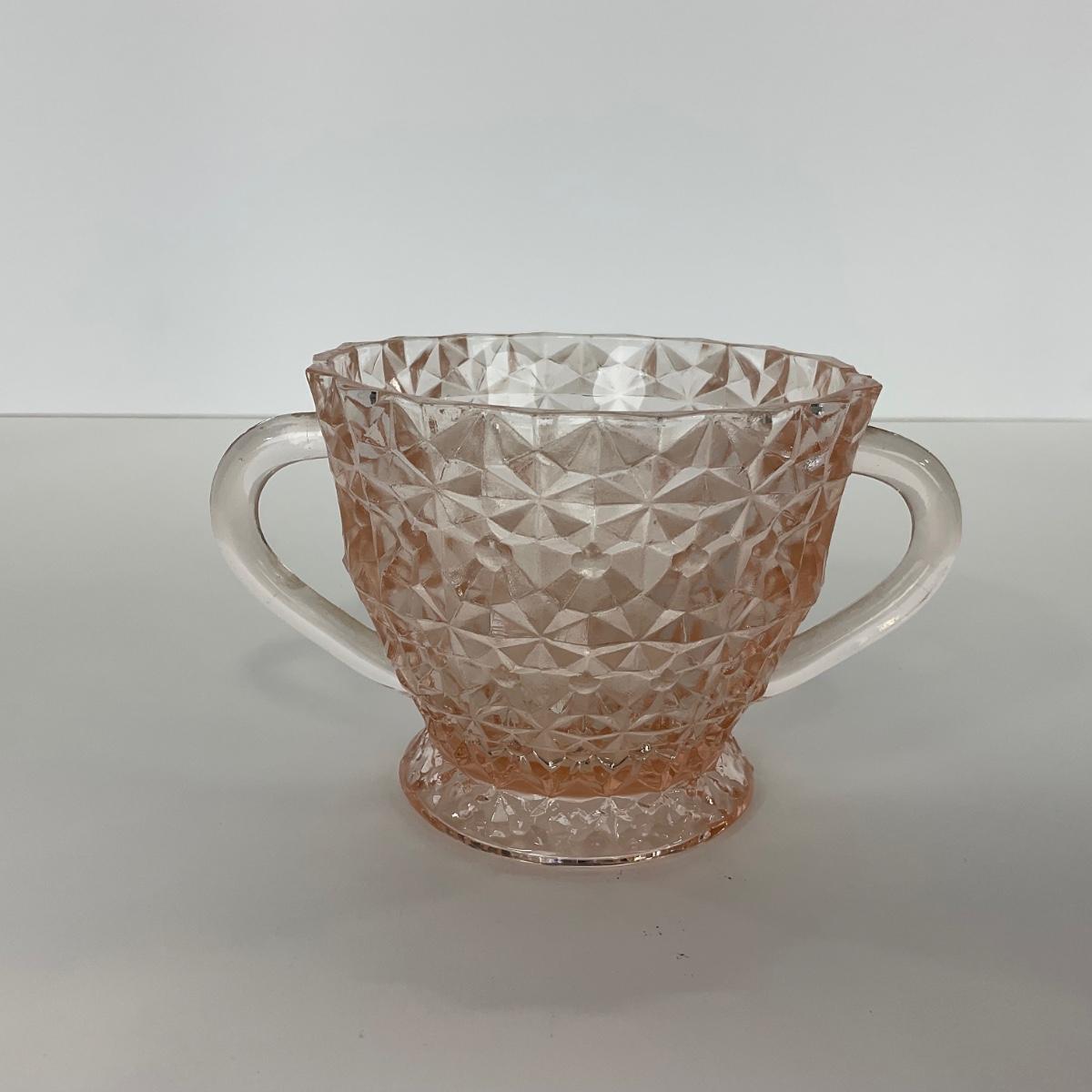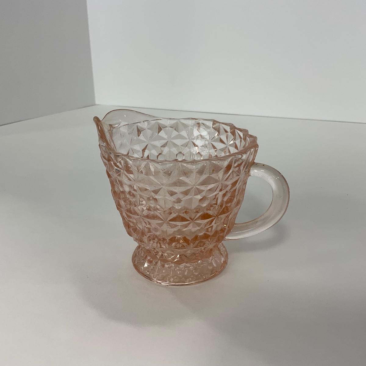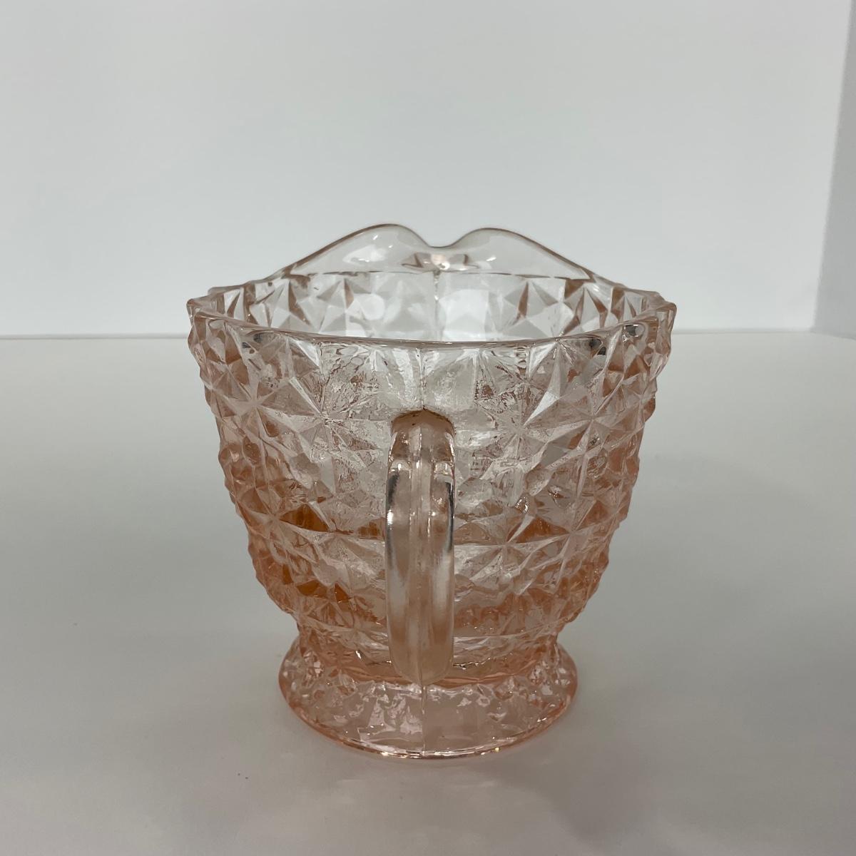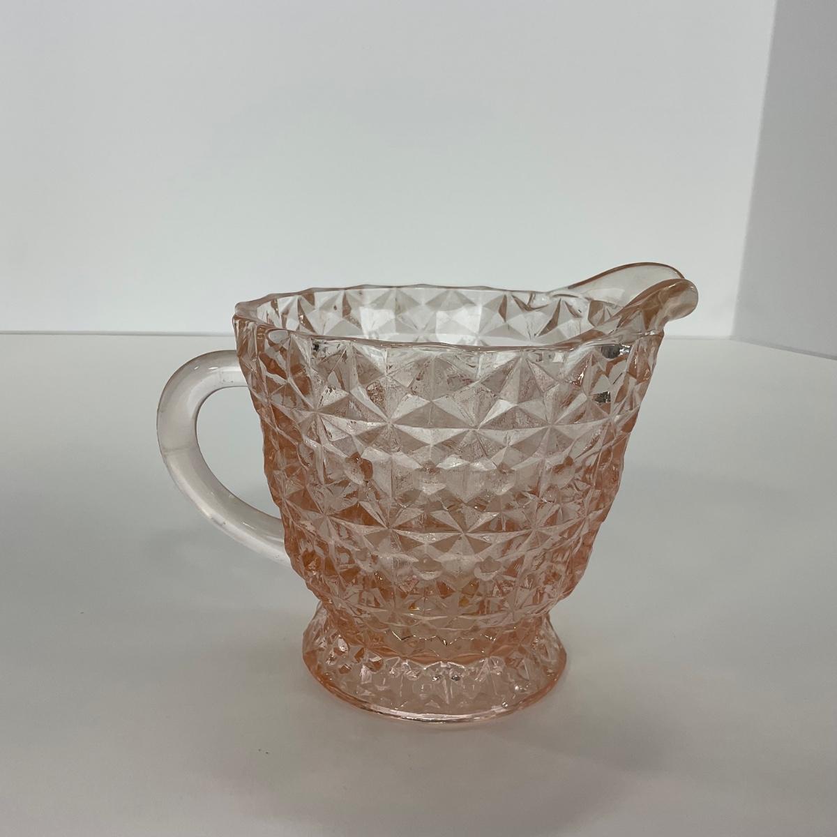 Two pieces of pink Holiday Buttons & Bows Jeanette Glass Co. (1947-1949) including one lidded sugar container and one creamer. Please see photos for details and condition. ::: Shipping is available on this lot. If you require shipping you must let us know at the close of the auction. We will coordinate with you after the item has been won. Shipping fees will include insurance up to or exceeding the value of all items being mailed. If you have any questions regarding this lot please contact the auctioneer either via this website, by direct email or by phone. PICK UP TIMES and other important information can be found in the TERMS and DESCRIPTION of the auction. Please take a look for pertinent information. Thanks!