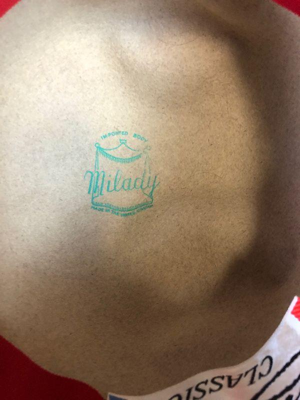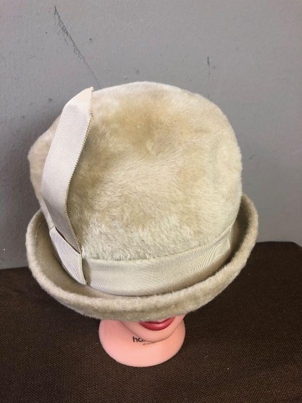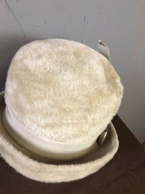 Made in the U K. Red ribbon Liner. Ladies off white Sand Color. Appears to be a soft faux felt fur.
