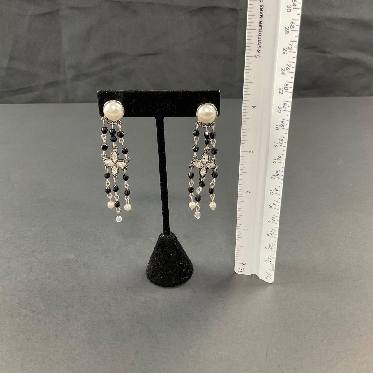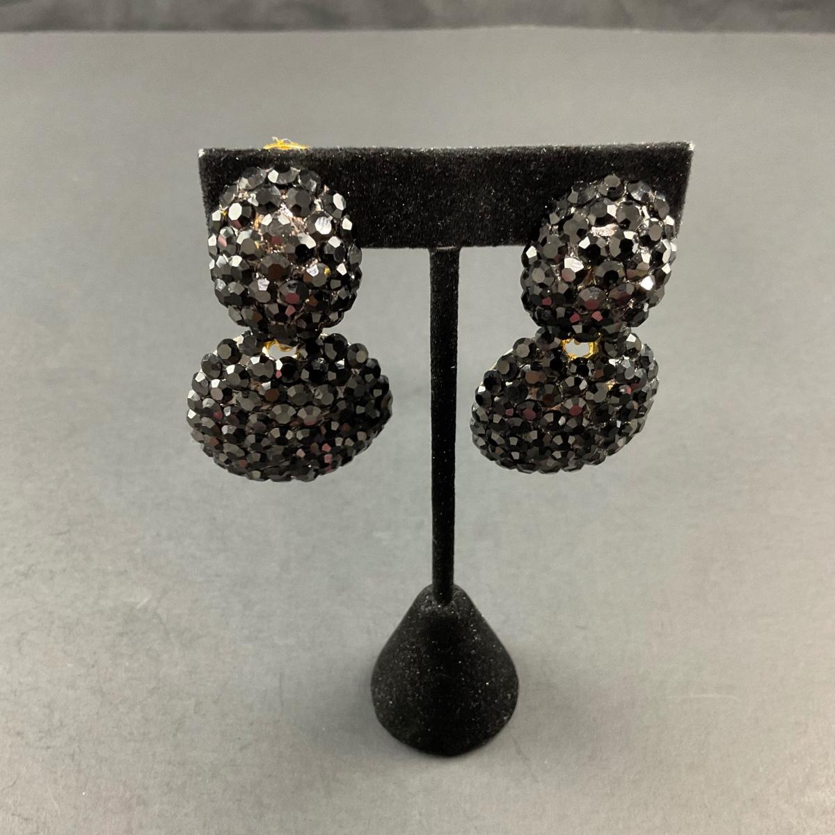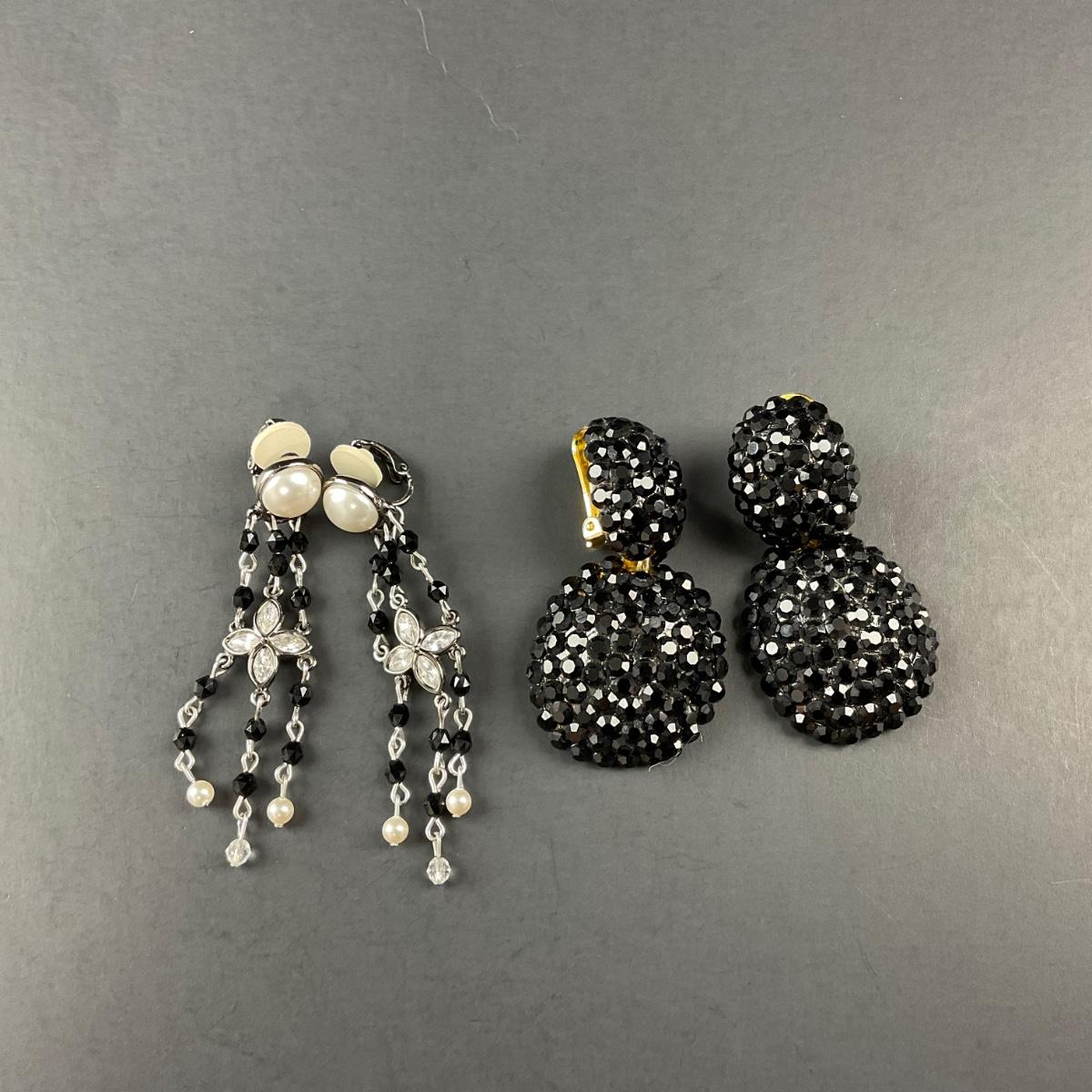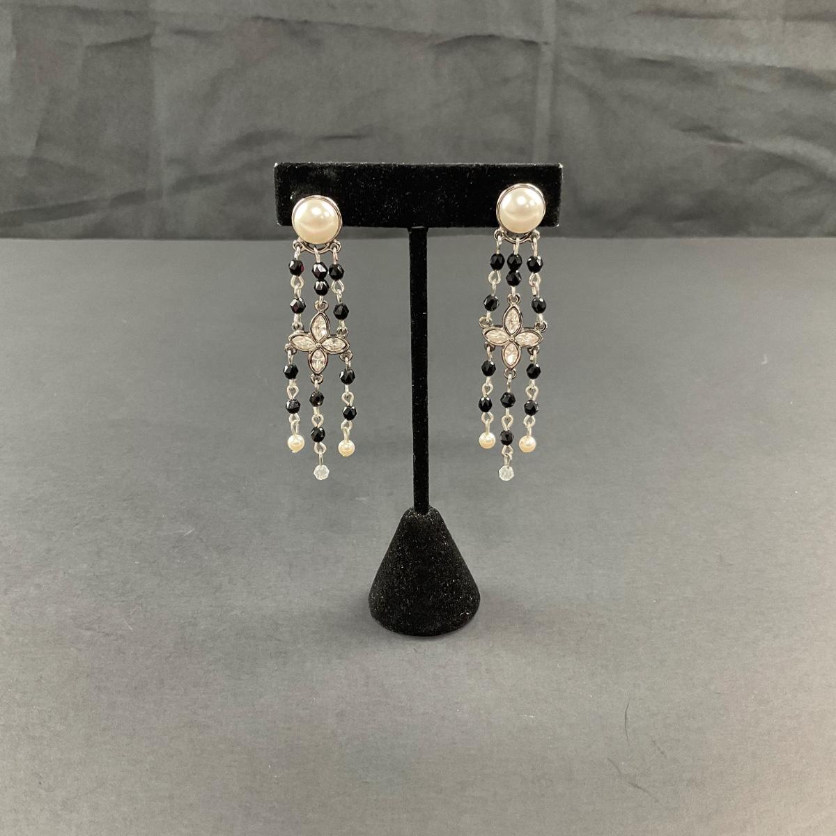 Two pairs of black and white clip costume jewelry earrings. One pair appears to be an unmarked pair of Swarovski clipped earrings. This piece has no damage, and appears to be in great shape with no visable chips, cracks, or broken pieces. Please see photos for details and condition. Any condition statement is given as a courtesy to a client, is an opinion, and should not be treated as a statement of fact. Reference to condition written, oral or within a condition report shall not be regarded as a full account of condition and may not include all defects, alterations, or restorations. Absence of a condition report does not imply a lot is flawless or lacking imperfections or damage. Katherine’s Auction & Appraisal Service shall have no responsibility for any error or omission. Returns shall not be accepted on the basis of condition. ::: Shipping is available on this lot. If you require shipping you must let us know at the close of the auction. We will coordinate with you after the item has been won. Shipping fees will include insurance up to or exceeding the value of all items being mailed. If you have any questions regarding this lot please contact the auctioneer either via this website, by direct email or by phone. PICK UP TIMES and other important information can be found in the TERMS and DESCRIPTION of the auction. Please take a look for pertinent information. Thanks!