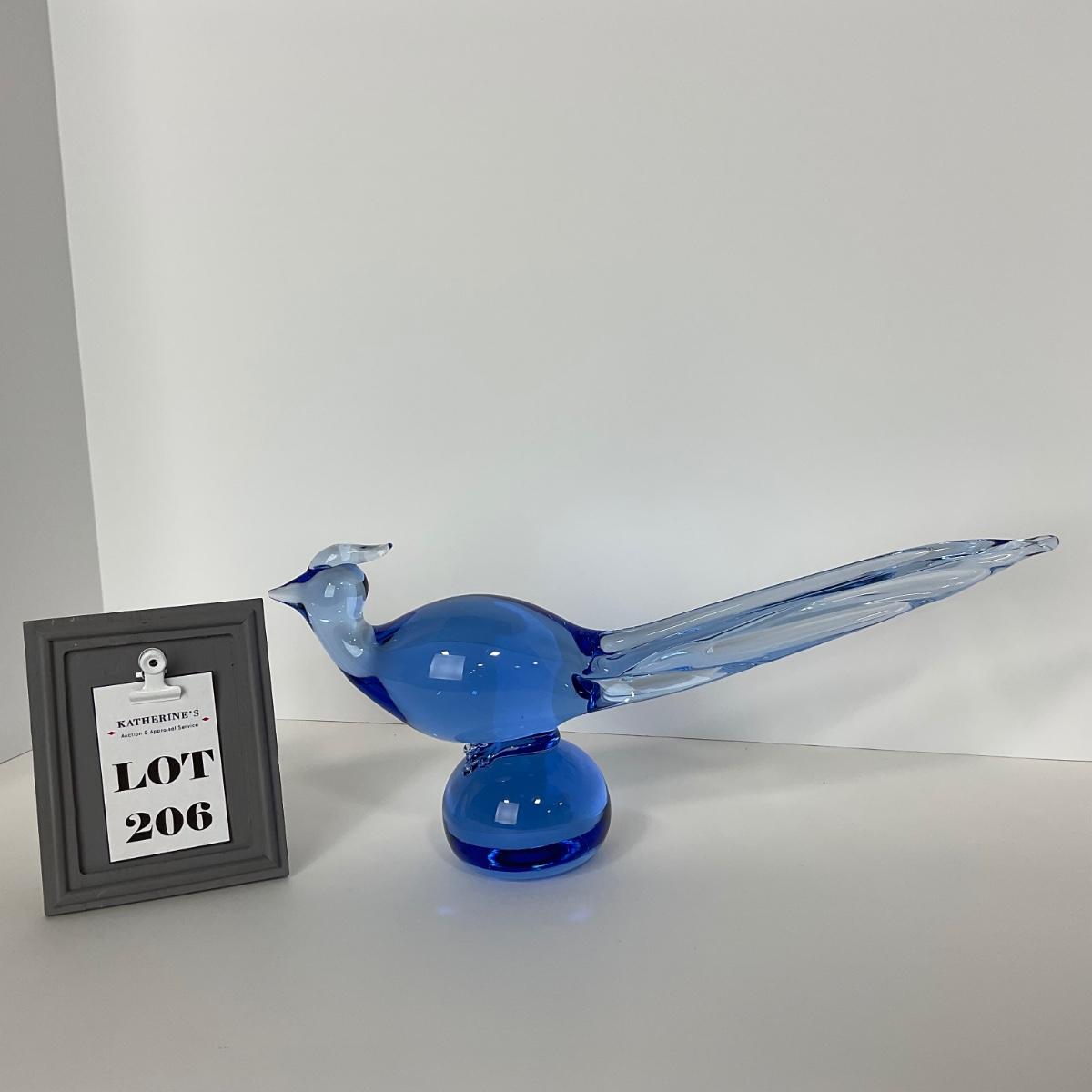 One Tiffin blue glass pheasant figure. This piece does have some scratches and scuffs but is in otherwise good shape. 6 inches tall by 14 1/4 inches wide. Please see photos for details and condition. Any condition statement is given as a courtesy to a client, is an opinion, and should not be treated as a statement of fact. Reference to condition written, oral or within a condition report shall not be regarded as a full account of condition and may not include all defects, alterations, or restorations. Absence of a condition report does not imply a lot is flawless or lacking imperfections or damage. Katherine’s Auction & Appraisal Service shall have no responsibility for any error or omission. Returns shall not be accepted on the basis of condition. ::: Shipping is available on this lot. If you require shipping you must let us know at the close of the auction. We will coordinate with you after the item has been won. Shipping fees will include insurance up to or exceeding the value of all items being mailed. If you have any questions regarding this lot please contact the auctioneer either via this website, by direct email or by phone. PICK UP TIMES and other important information can be found in the TERMS and DESCRIPTION of the auction. Please take a look for pertinent information. Thanks!
