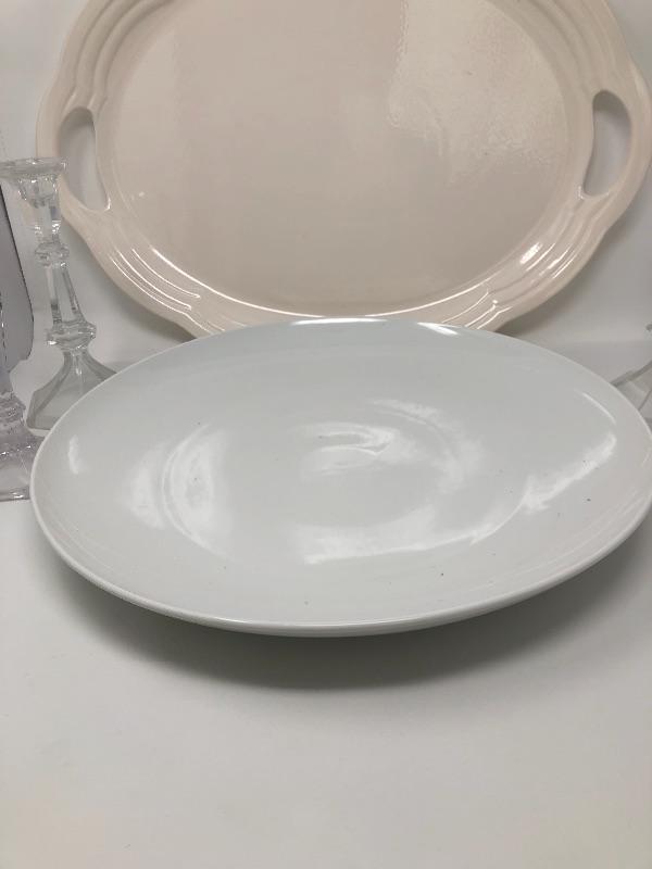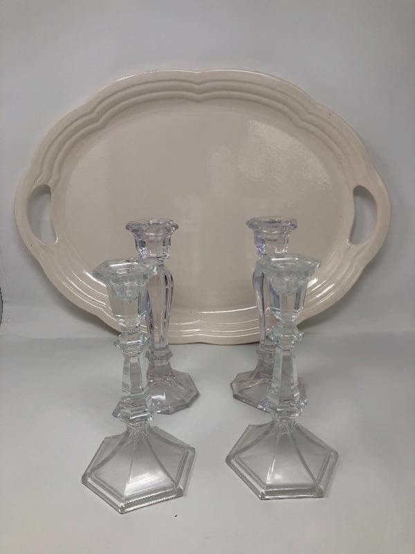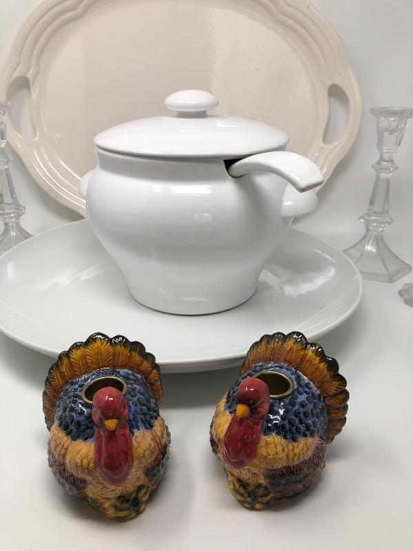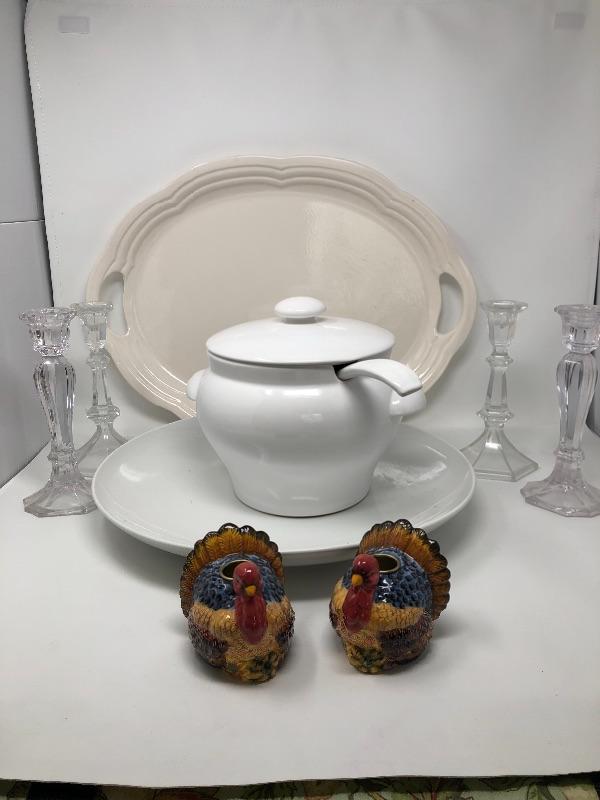 Soup Bowl With Ladle, Candlesticks, Serving Tray and More. 21 inch platter, 16 inch plate. Turkey Candlestick holders.