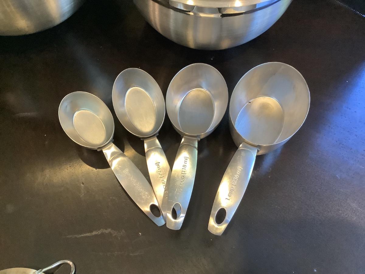 Bowls are 1.5qt., 3qt, 5qt, 8qt, Measuring spoons and cups are by oneida,