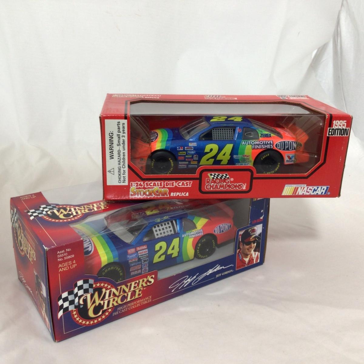 Two 1:24 scale Jeff Gordon NASCAR cars. Please see photos for details and condition. ::: Shipping is available on this lot. If you require shipping you must let us know at the close of the auction. We will coordinate with you after the item has been won. Shipping fees will include insurance up to or exceeding the value of all items being mailed. If you have any questions regarding this lot please contact the auctioneer either via this website, by direct email or by phone. PICK UP TIMES and other important information can be found in the TERMS and DESCRIPTION of the auction. Please take a look for pertinent information. Thanks!