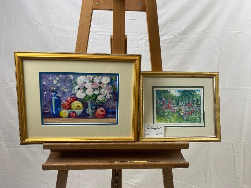1) signed Monotype Hollyhocks in gold frame 13.25” x 11.25”