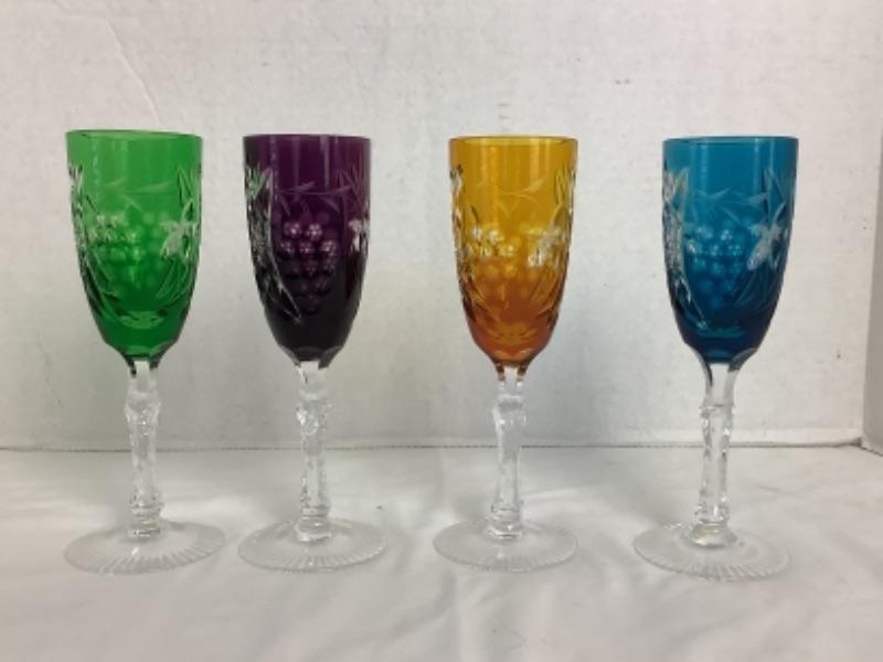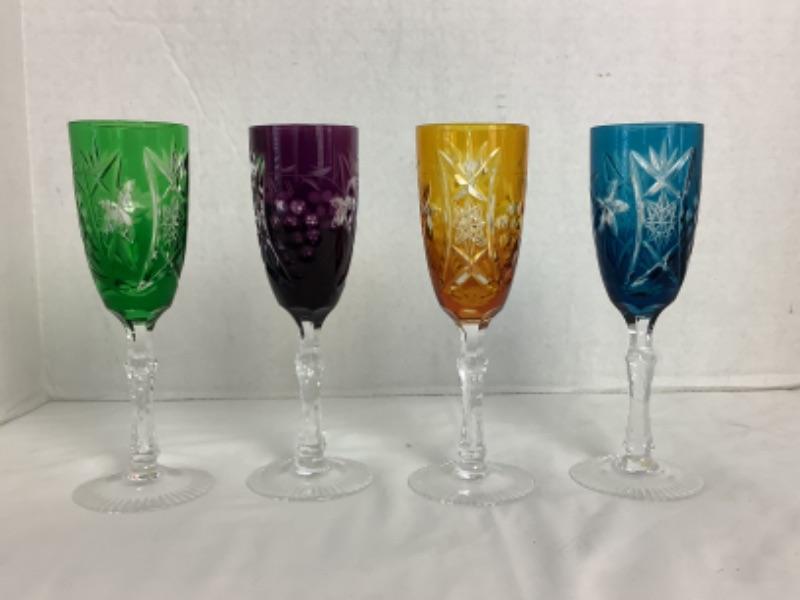 Four vintage colored cut crystal champagne glasses measuring 8” tall. All glasses are in excellent condition