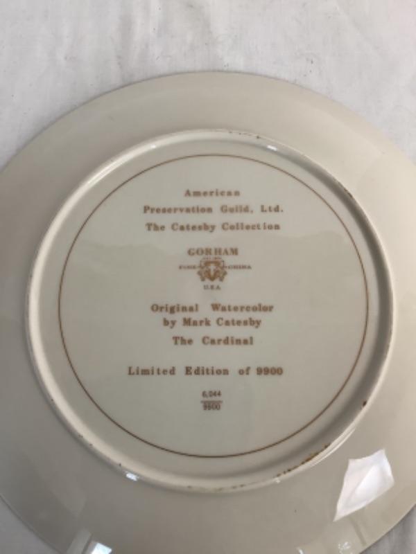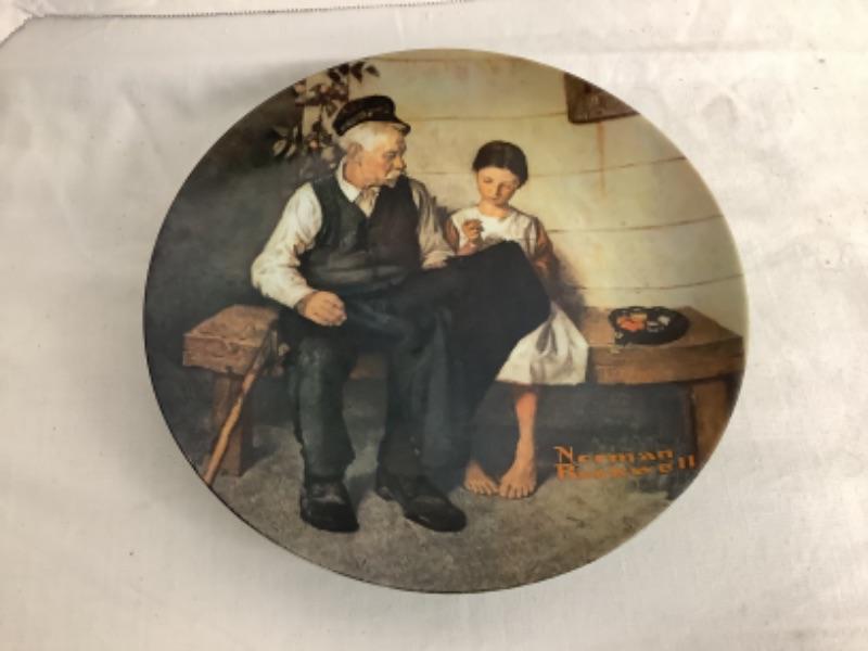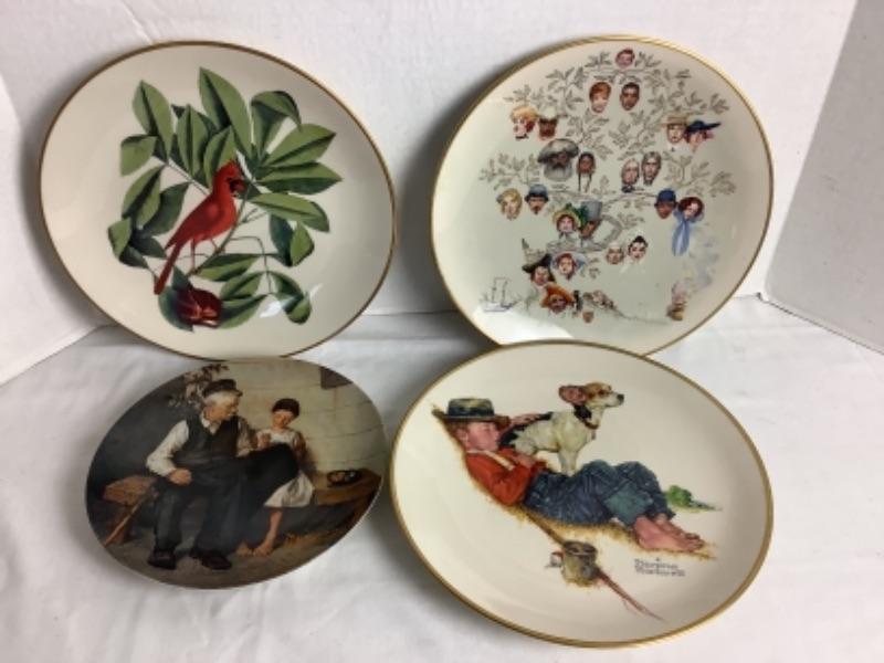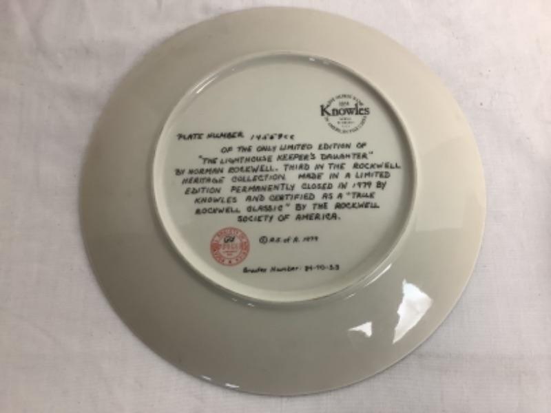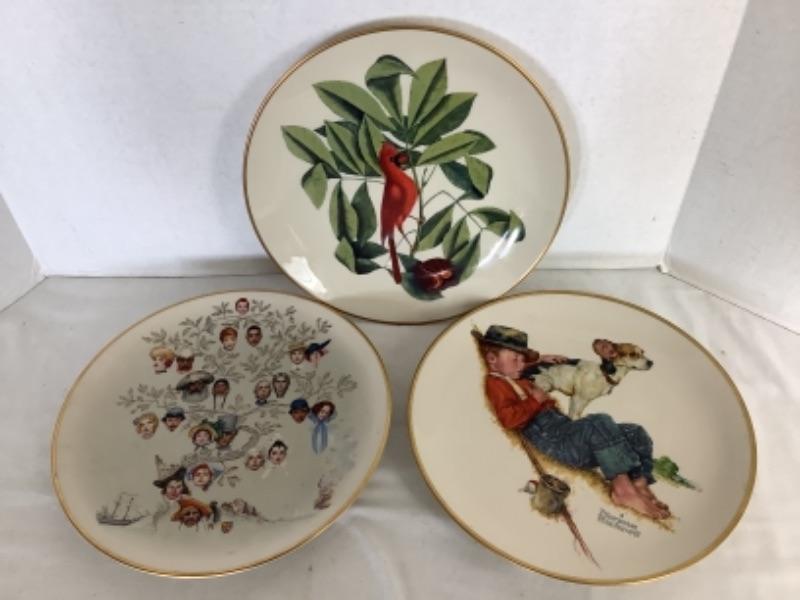 American Preservation Guild Ltd. The Catesby Collection “The Cardinal”, Norman Rockwell American Heritage Plate “A Family Tree” and Norman Rockwell “”Adventures Between Adventures” plate, all three measure 10-3/4” and a Knowles Norman Rockwell limited edition collectors plate number 14559CC “The Lighthouse Keeper’s Daughter”