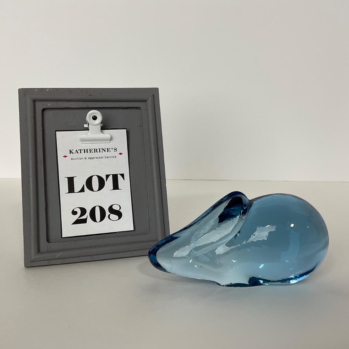 One Fostoria marked ice blue glass rabbit. This piece does have some minor flea bite marks on the bottom rim but appears to otherwise be in goof shape. 2 1/4 inches tall and 4 1/2 inches wide. Please see photos for details and condition. Any condition statement is given as a courtesy to a client, is an opinion, and should not be treated as a statement of fact. Reference to condition written, oral or within a condition report shall not be regarded as a full account of condition and may not include all defects, alterations, or restorations. Absence of a condition report does not imply a lot is flawless or lacking imperfections or damage. Katherine’s Auction & Appraisal Service shall have no responsibility for any error or omission. Returns shall not be accepted on the basis of condition. ::: Shipping is available on this lot. If you require shipping you must let us know at the close of the auction. We will coordinate with you after the item has been won. Shipping fees will include insurance up to or exceeding the value of all items being mailed. If you have any questions regarding this lot please contact the auctioneer either via this website, by direct email or by phone. PICK UP TIMES and other important information can be found in the TERMS and DESCRIPTION of the auction. Please take a look for pertinent information. Thanks!