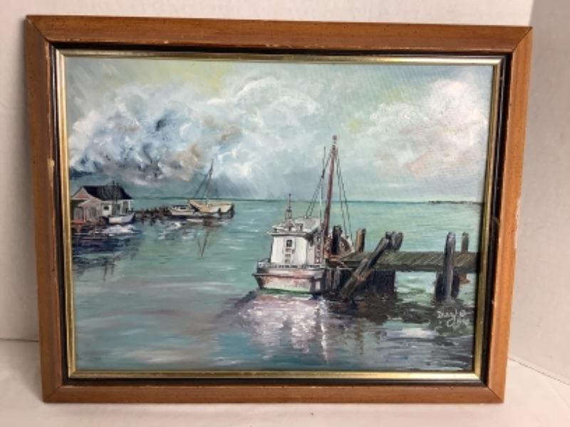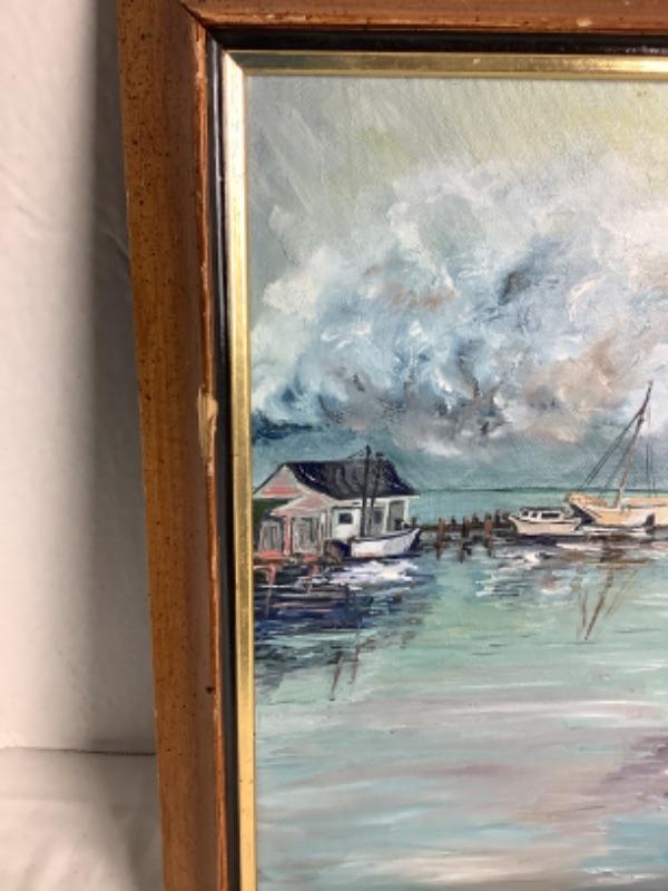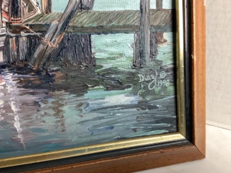 Beautiful oil painting on board of Boats in a marina, signed Diaz 1998 and framed, Measures 20”x16”, frame has a chip (see photos)