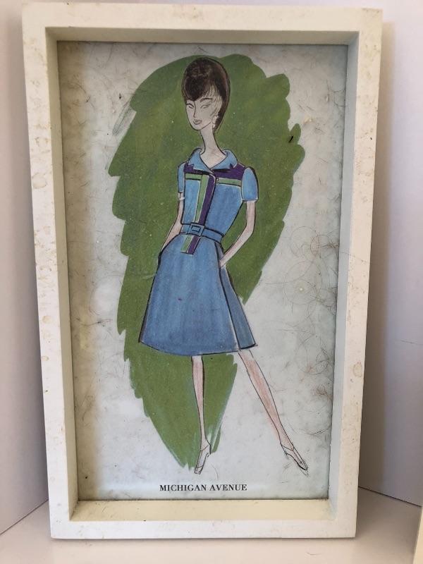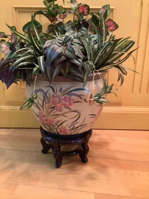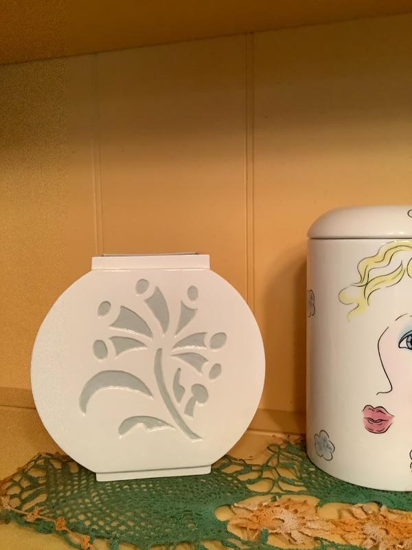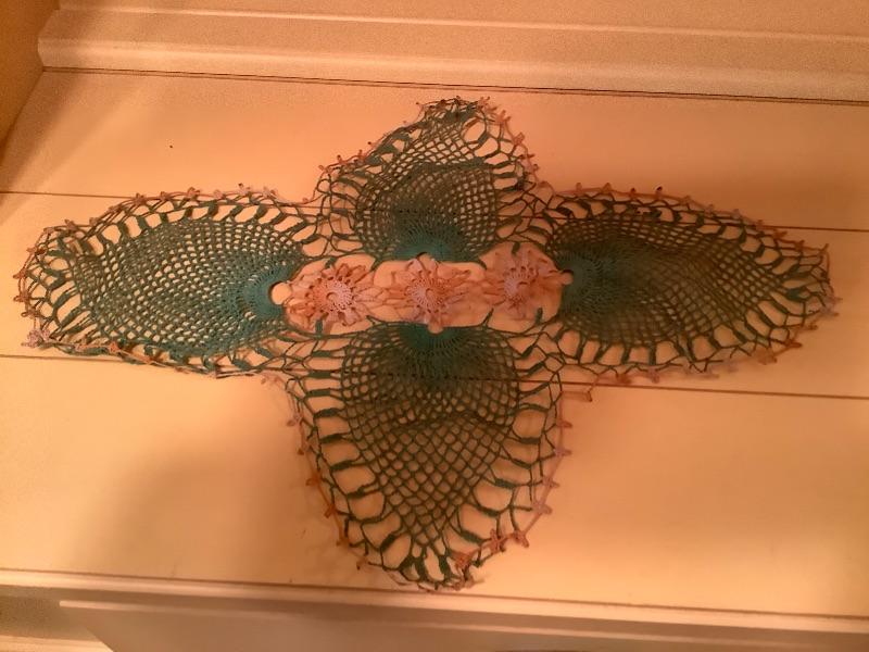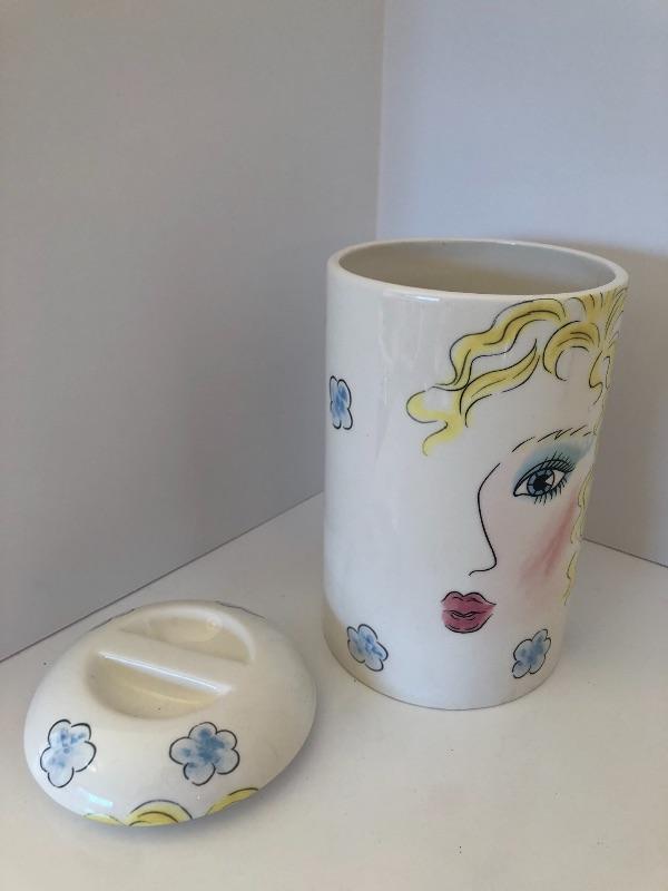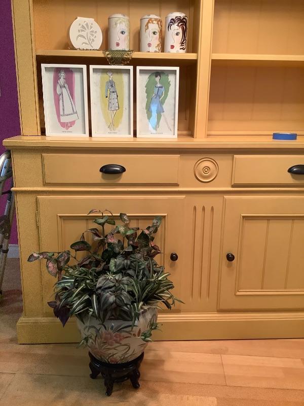 Adorable lady canister set with complementary framed pictures, A beautiful potted artificial plant, and hand crochet doily.