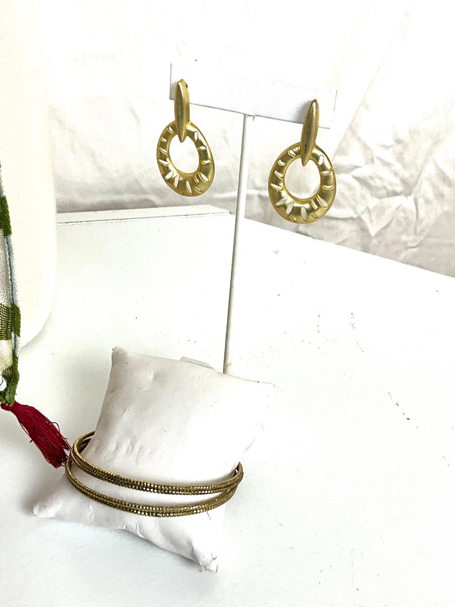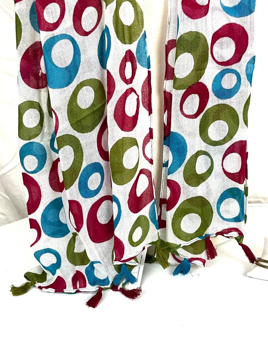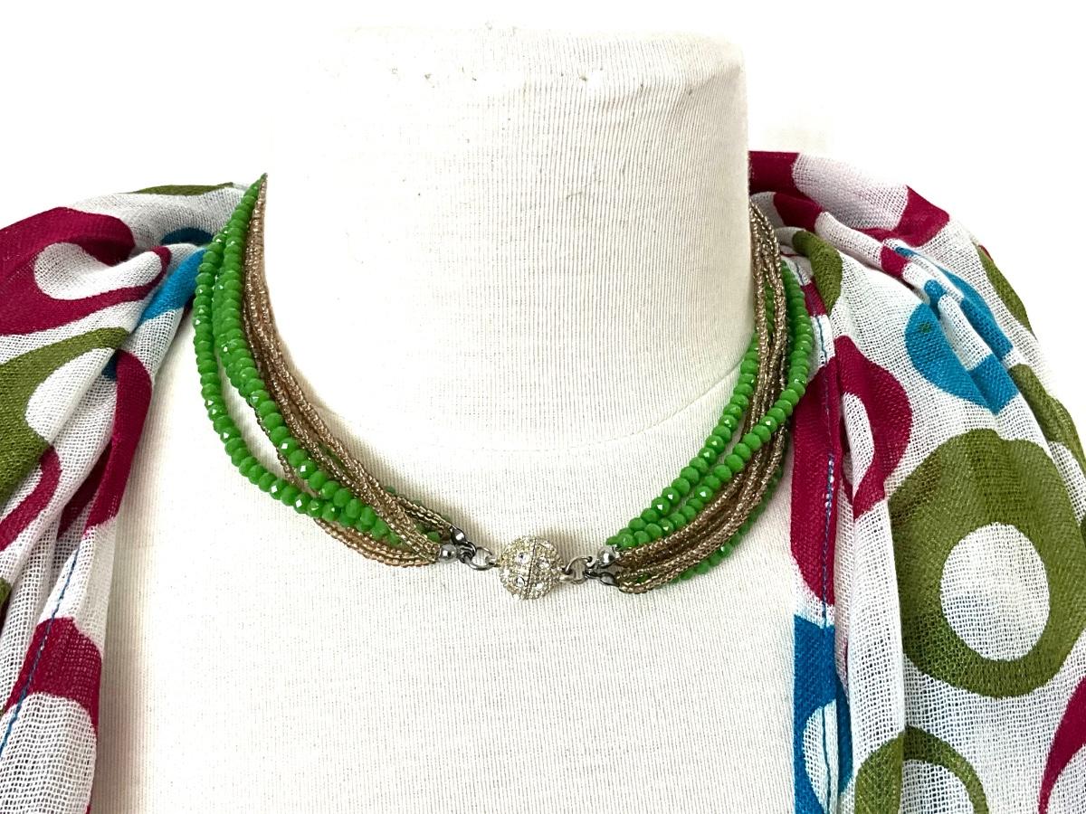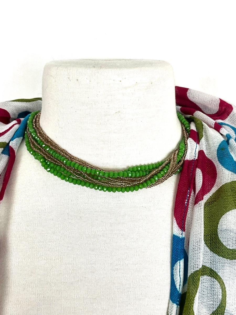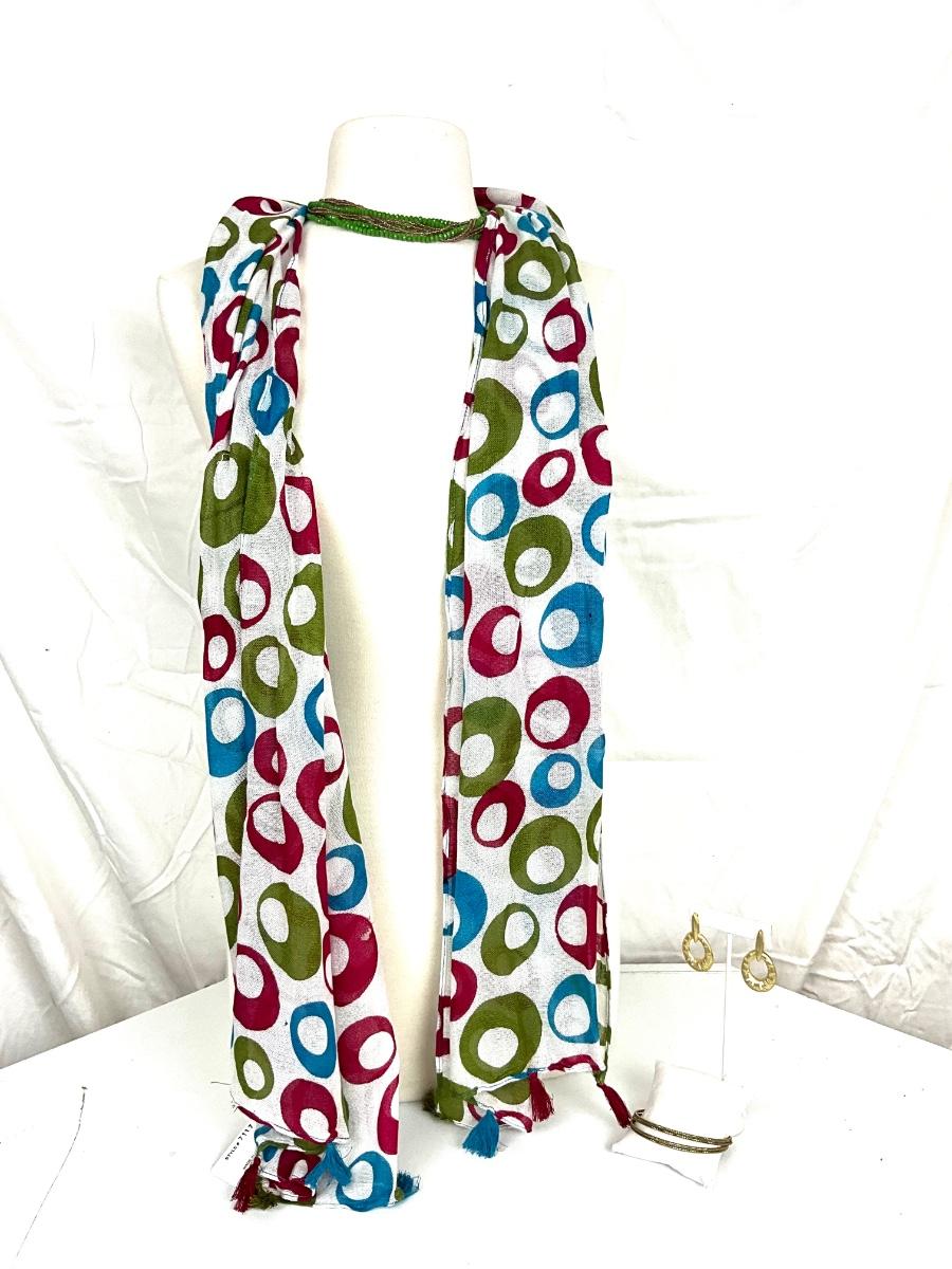 209 Green, Blue, Burgundy Circle Scarf with Gold tone Earrings and Bracelet, with Beaded Green Necklace