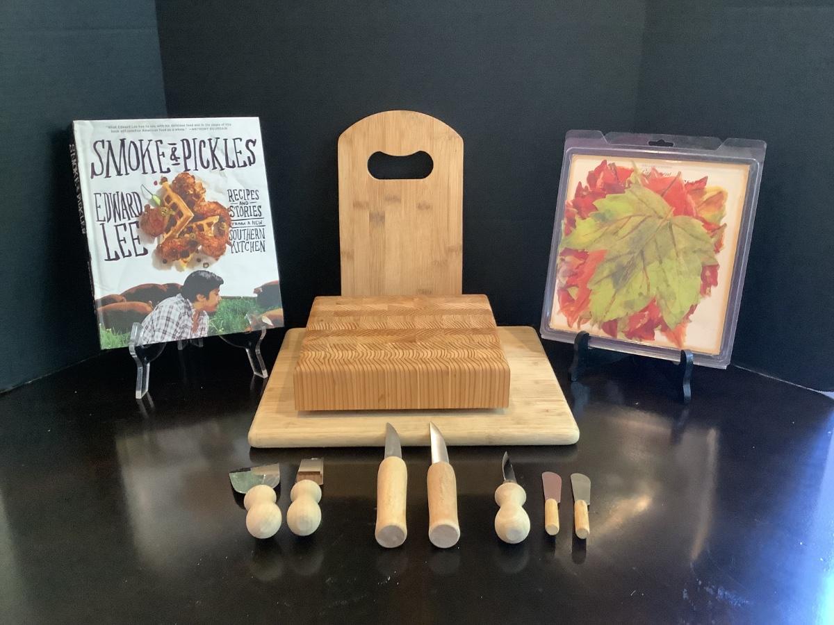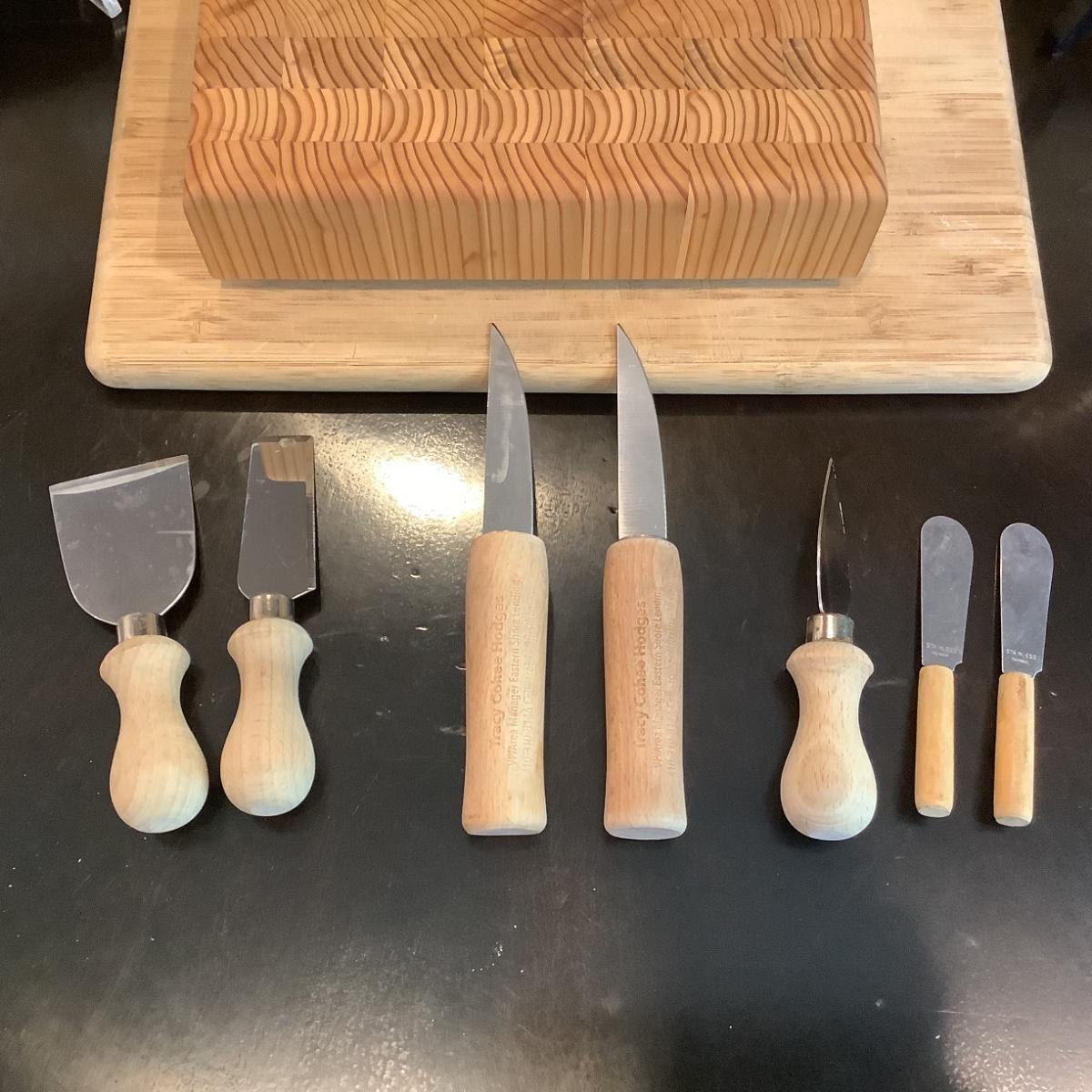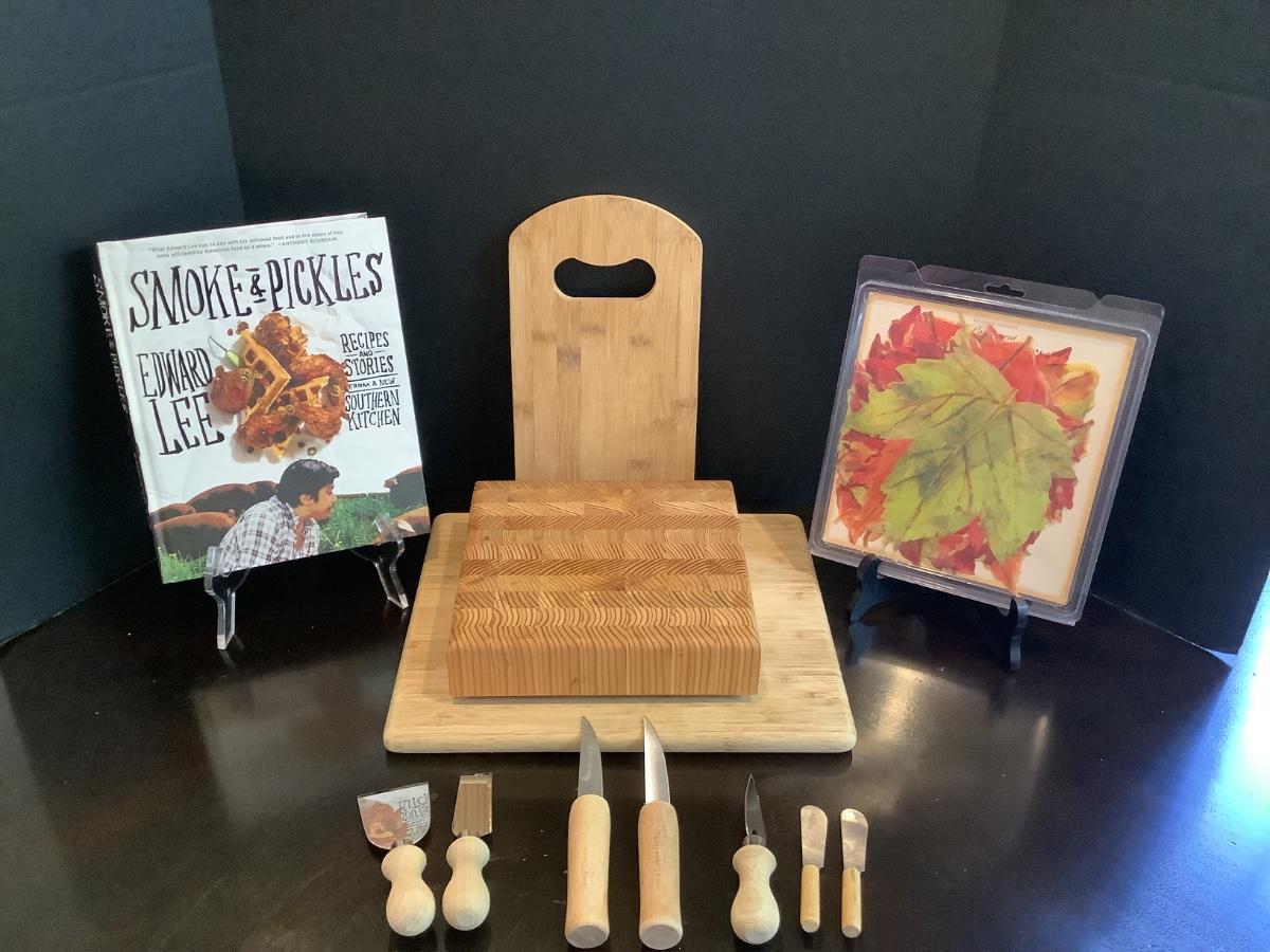 209 William Sonoma Leaf Cheese Board with Wooden Cutting Boards and 7 Cheese Knives