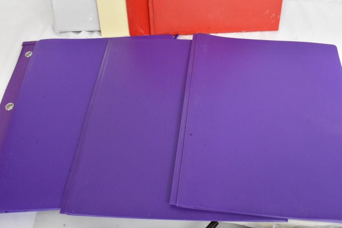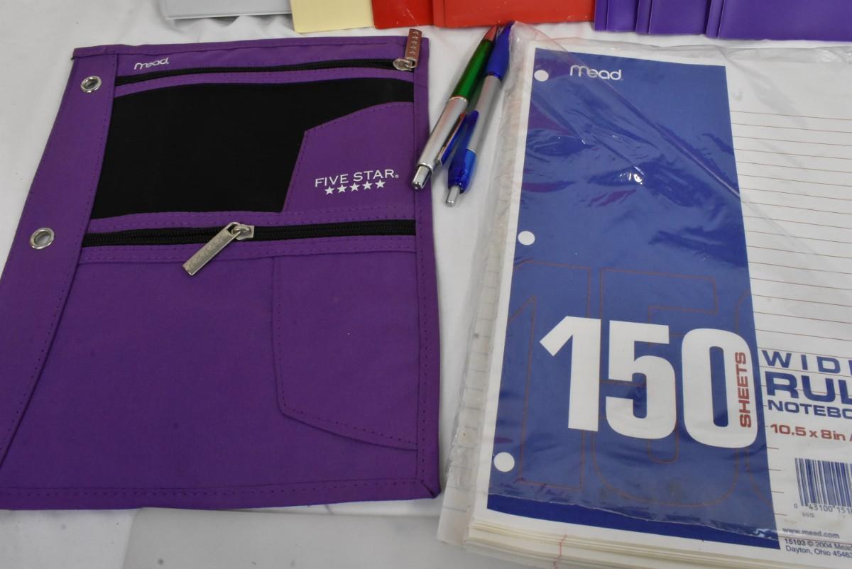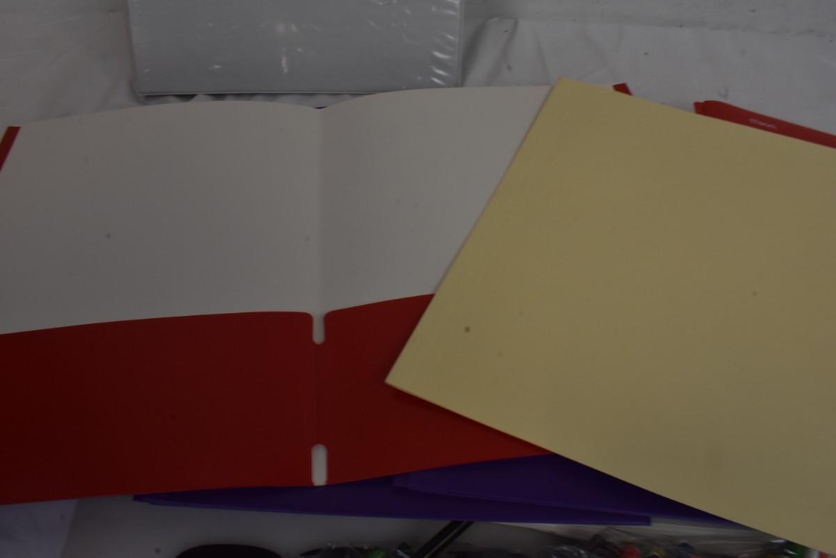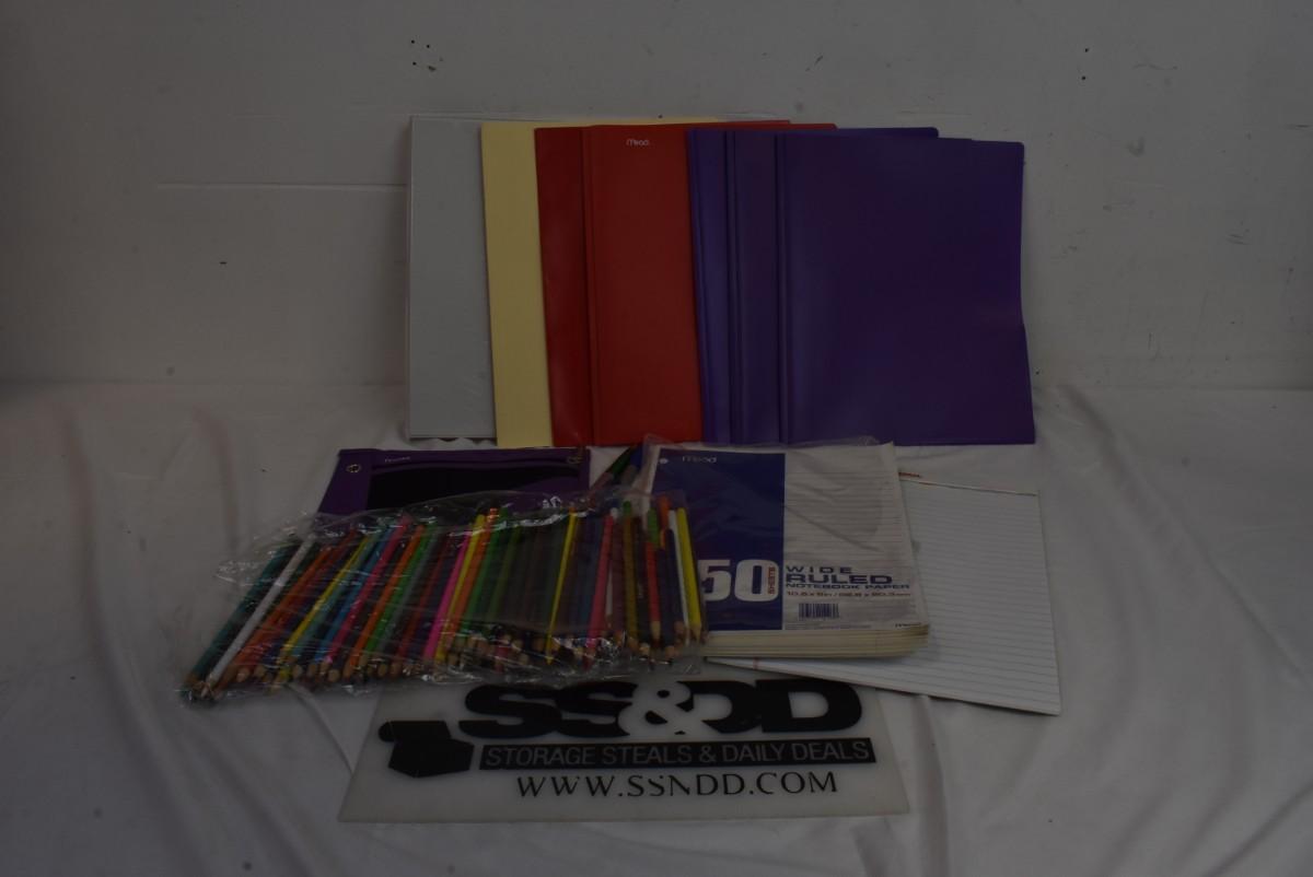 20+assorted school/office supplies, notebook paper, colored pencils, folders, Mead pouch,