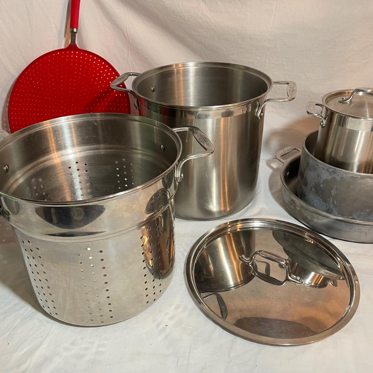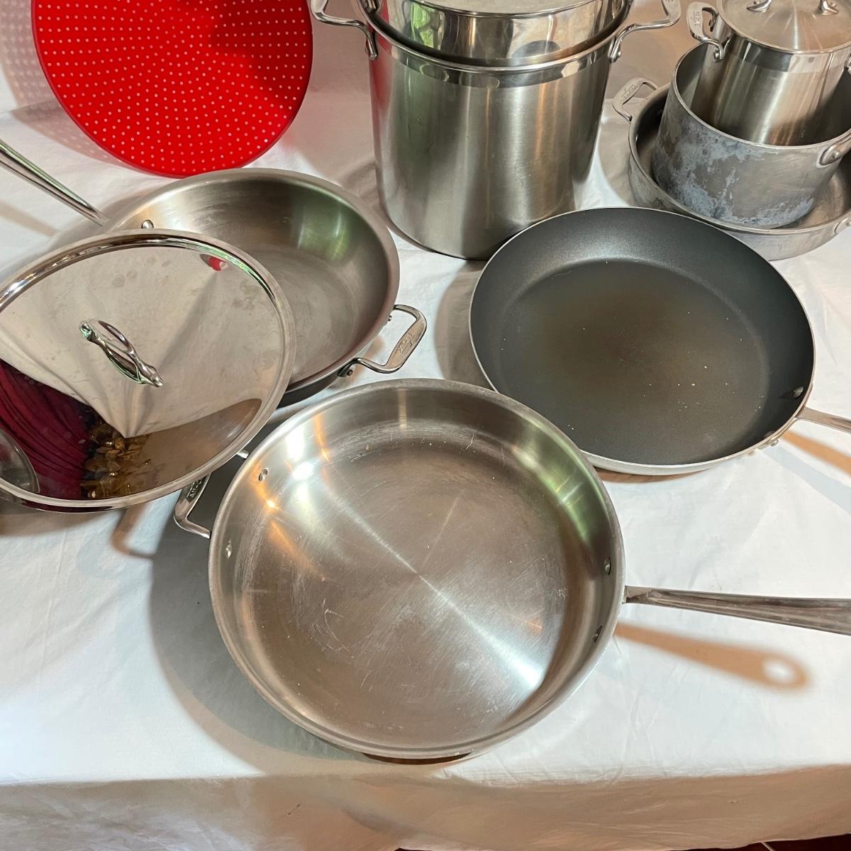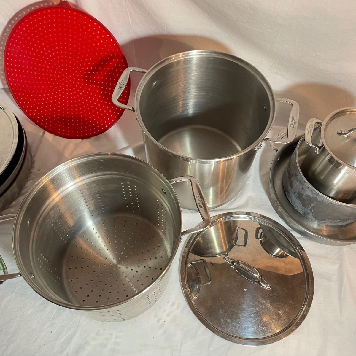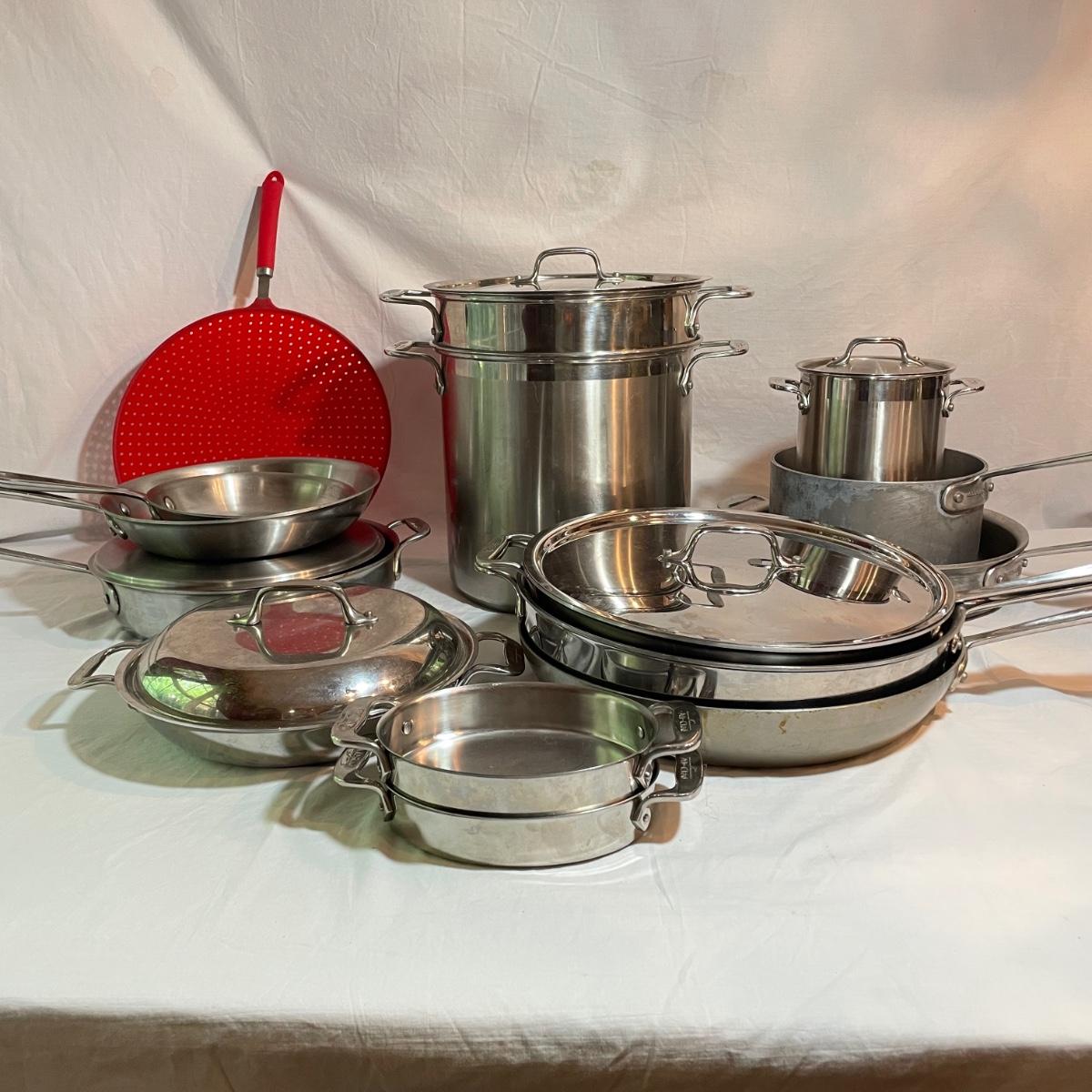 Lot appears to be about 20 pieces of All-Clad stainless steel pots and pans. Lot also includes a 13.5”D nonstick All-Clad skillet and a red rubber splatter shield. The small, thin stock pot has a removable basket, the largest stock pot has a strainer/steamer and it measures 11”D x 10”H without the handles. The smallest pans are 7” x 5.5” x 1.25”- these are the matching oval pans. Lot includes five lids, see images. Two pans appear a bit older than the rest, they are marked All-Clad LTD. Local pick up only.