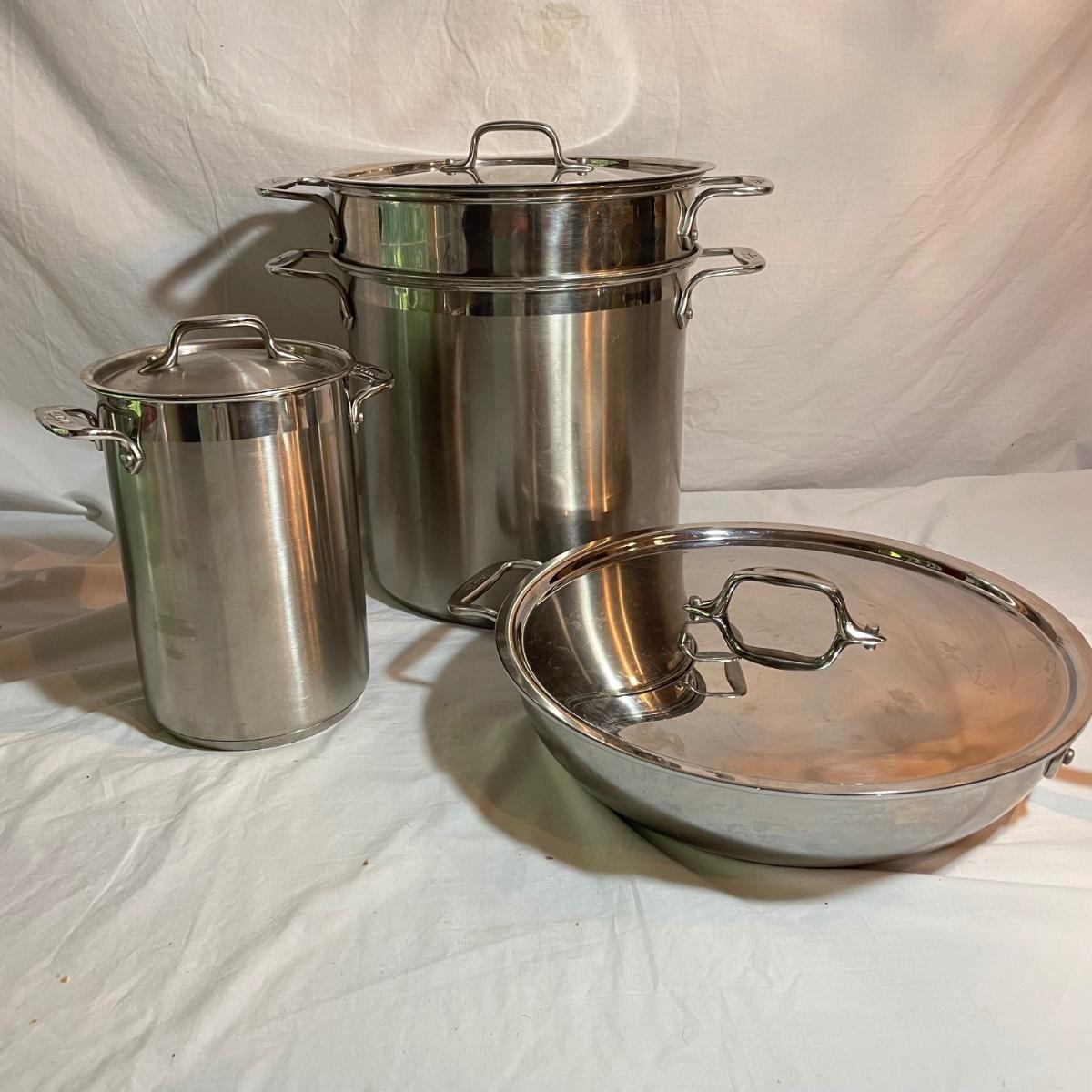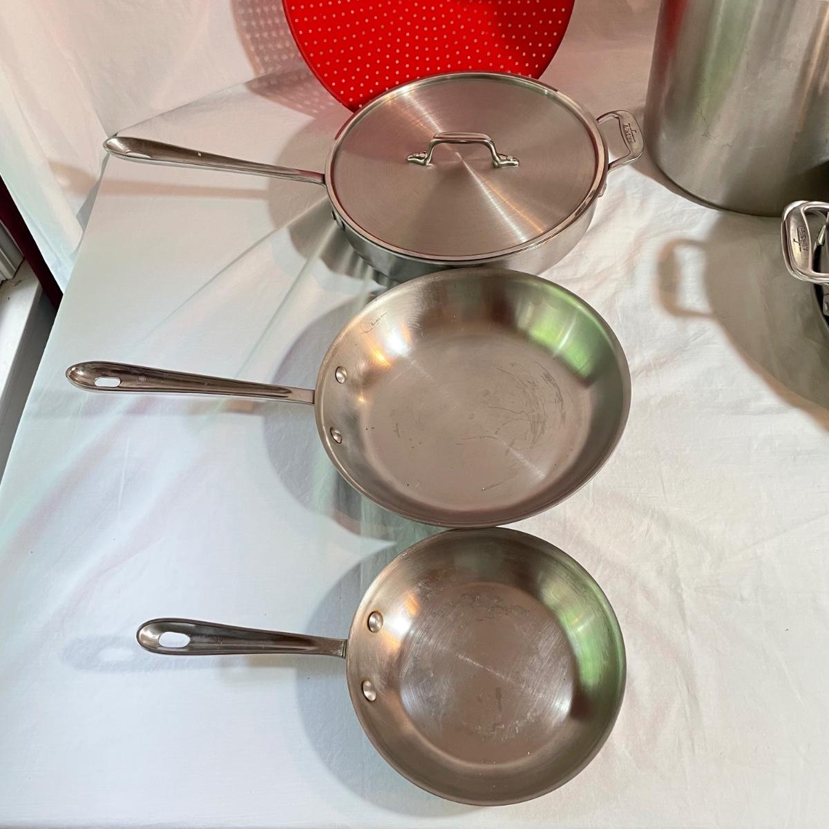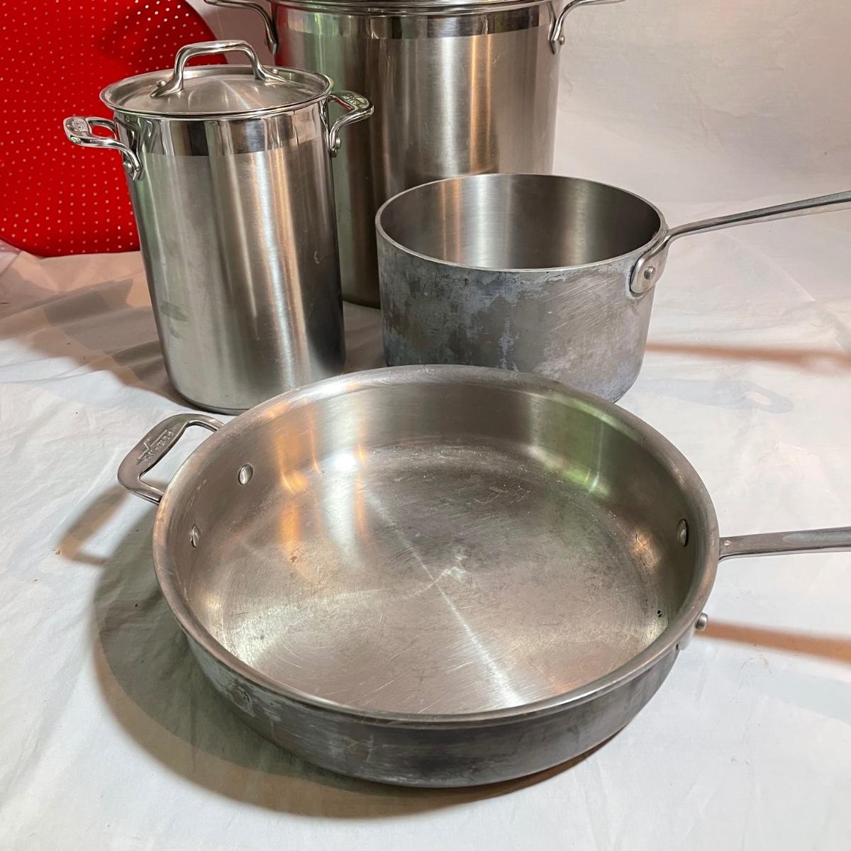 Lot appears to be about 20 pieces of All-Clad stainless steel pots and pans. Lot also includes a 13.5”D nonstick All-Clad skillet and a red rubber splatter shield. The small, thin stock pot has a removable basket, the largest stock pot has a strainer/steamer and it measures 11”D x 10”H without the handles. The smallest pans are 7” x 5.5” x 1.25”- these are the matching oval pans. Lot includes five lids, see images. Two pans appear a bit older than the rest, they are marked All-Clad LTD. Local pick up only.