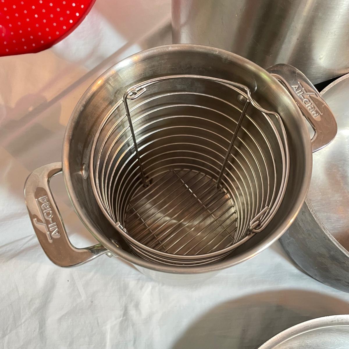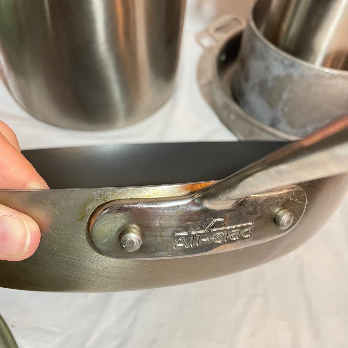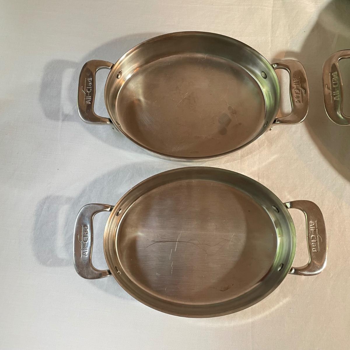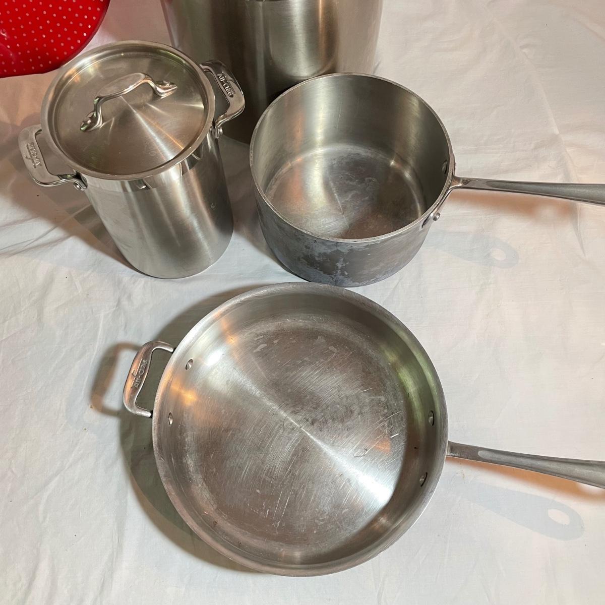 Lot appears to be about 20 pieces of All-Clad stainless steel pots and pans. Lot also includes a 13.5”D nonstick All-Clad skillet and a red rubber splatter shield. The small, thin stock pot has a removable basket, the largest stock pot has a strainer/steamer and it measures 11”D x 10”H without the handles. The smallest pans are 7” x 5.5” x 1.25”- these are the matching oval pans. Lot includes five lids, see images. Two pans appear a bit older than the rest, they are marked All-Clad LTD. Local pick up only.