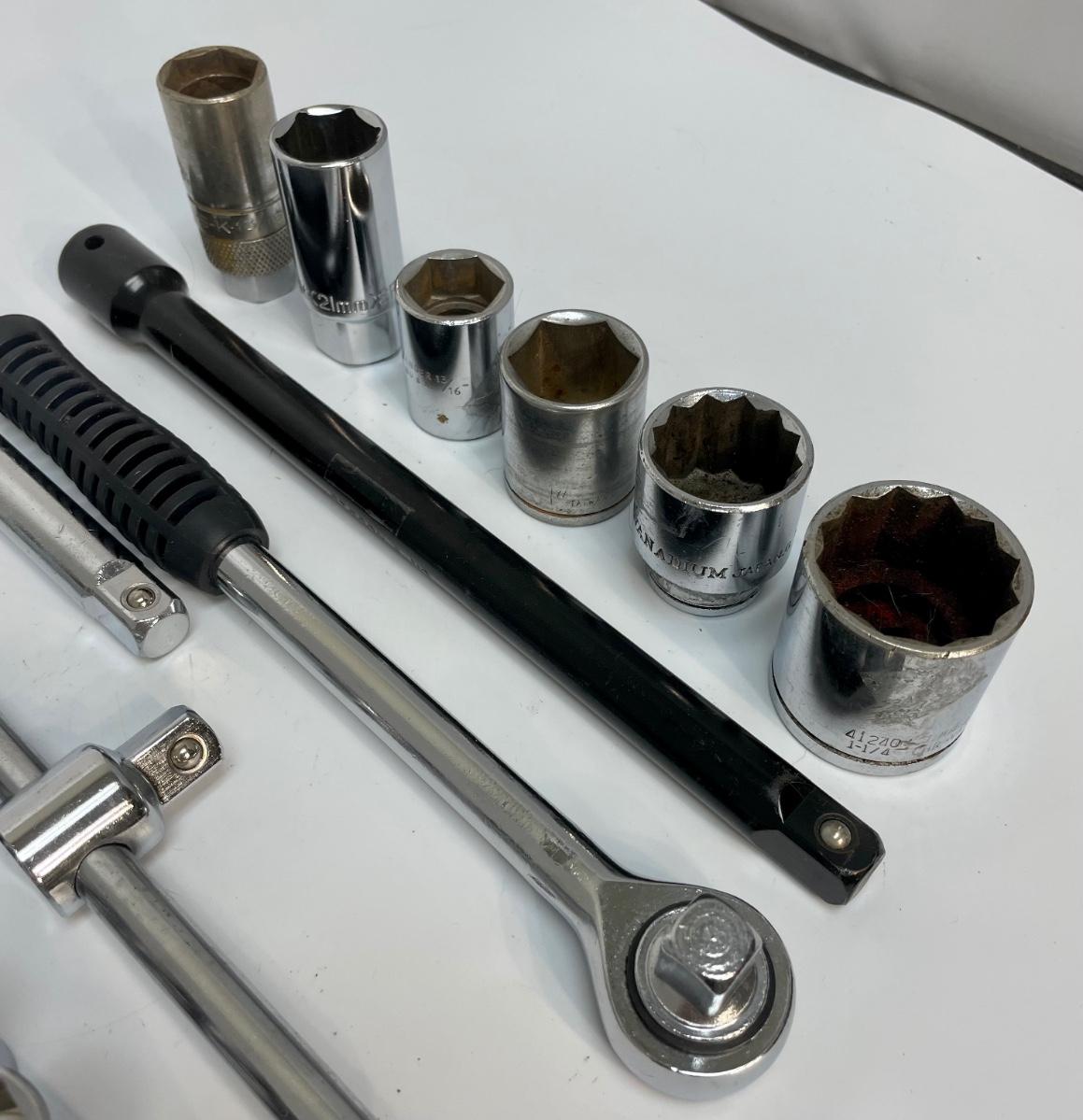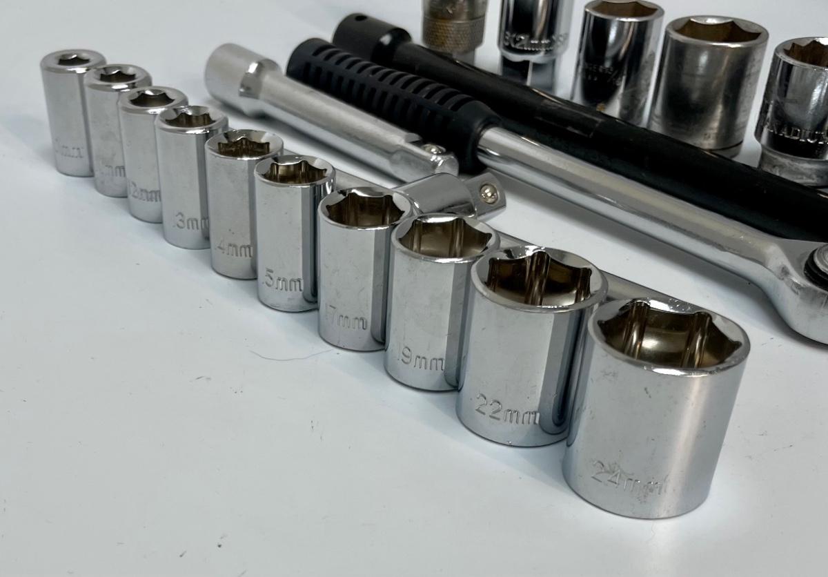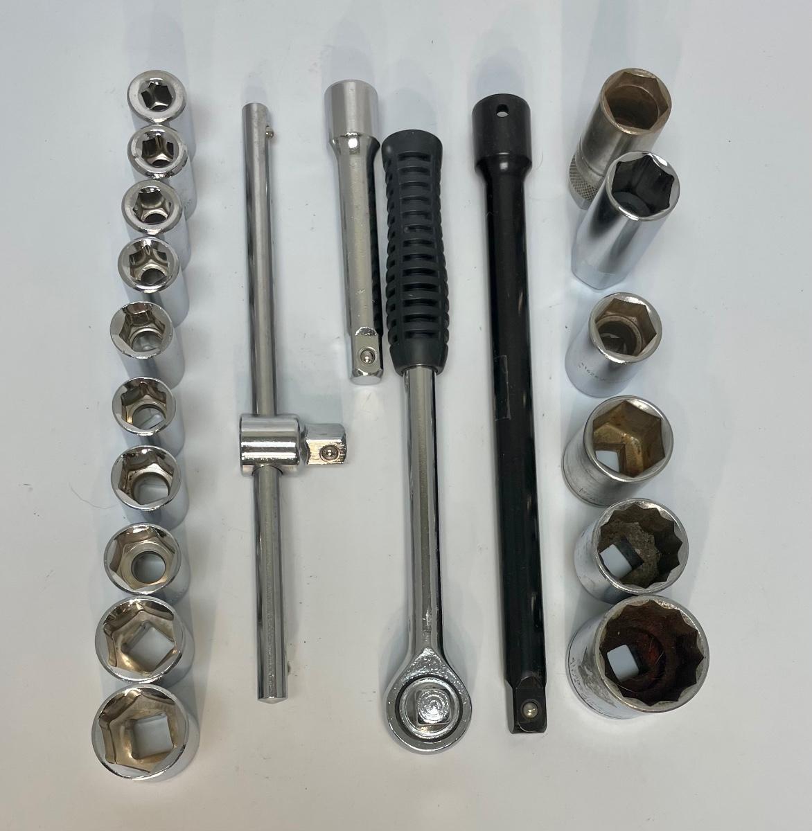 Socket set includes 10” ratchet, 10” T-handle sliding breaker bar, 10 metric sockets: 10mm through 15mm, 17mm, 19mm, 22mm, 24mm. 2 spark plug sockets (13/16”), 1 1/4”, 1 1/16”, 1”, and regular 13/16”, and 2 extensions.