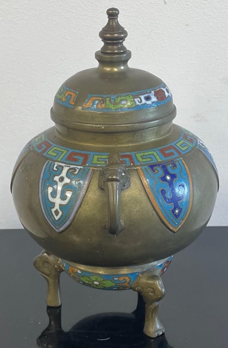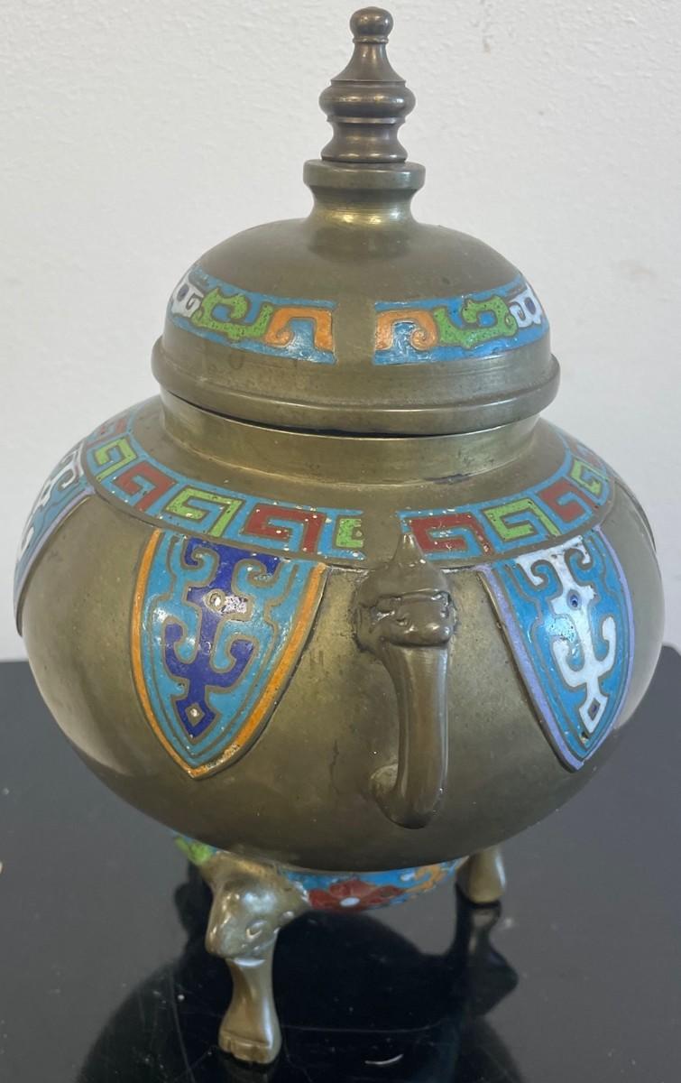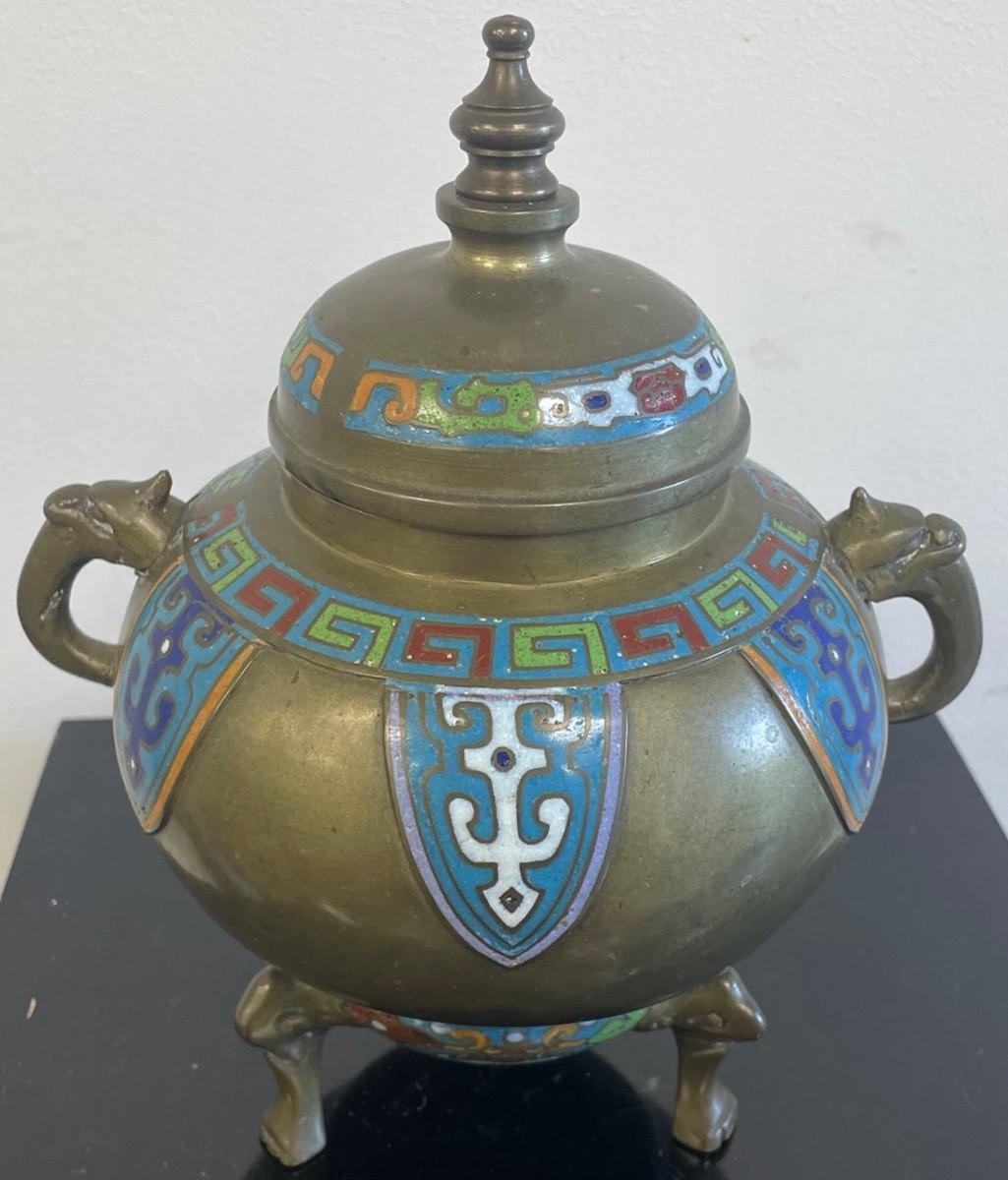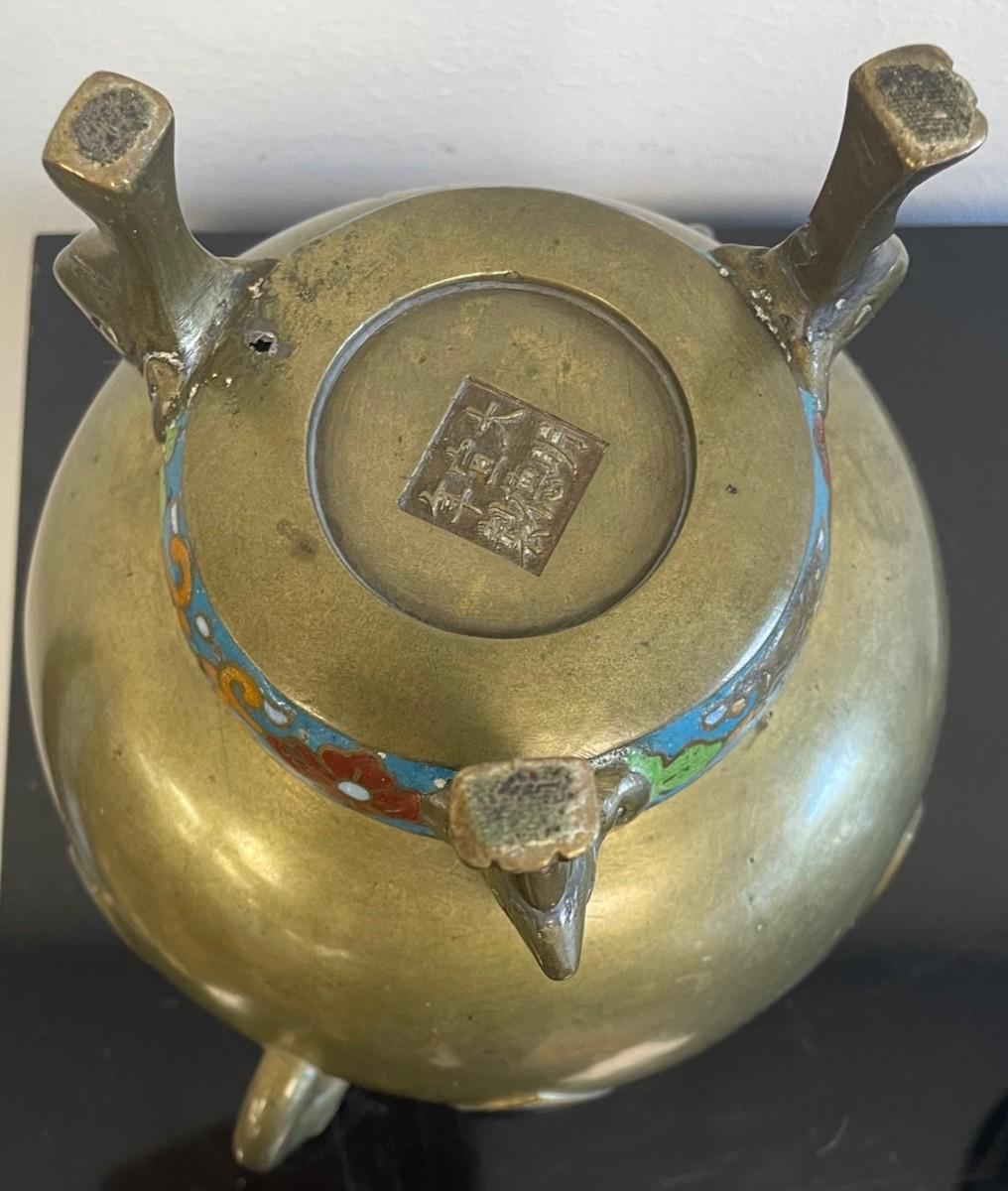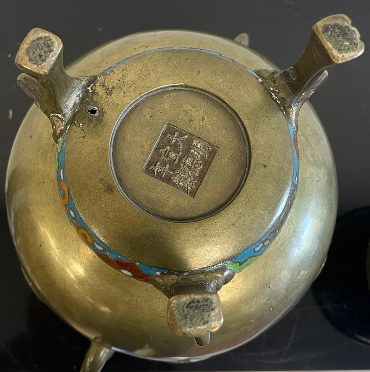 Description: 20th Century Chinese Burnt Tripod incense burner censer / cloisonné, Brass; Measurement approximate: 8"h; Material: