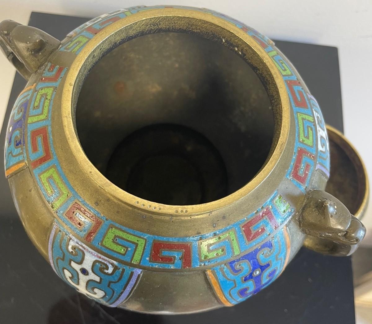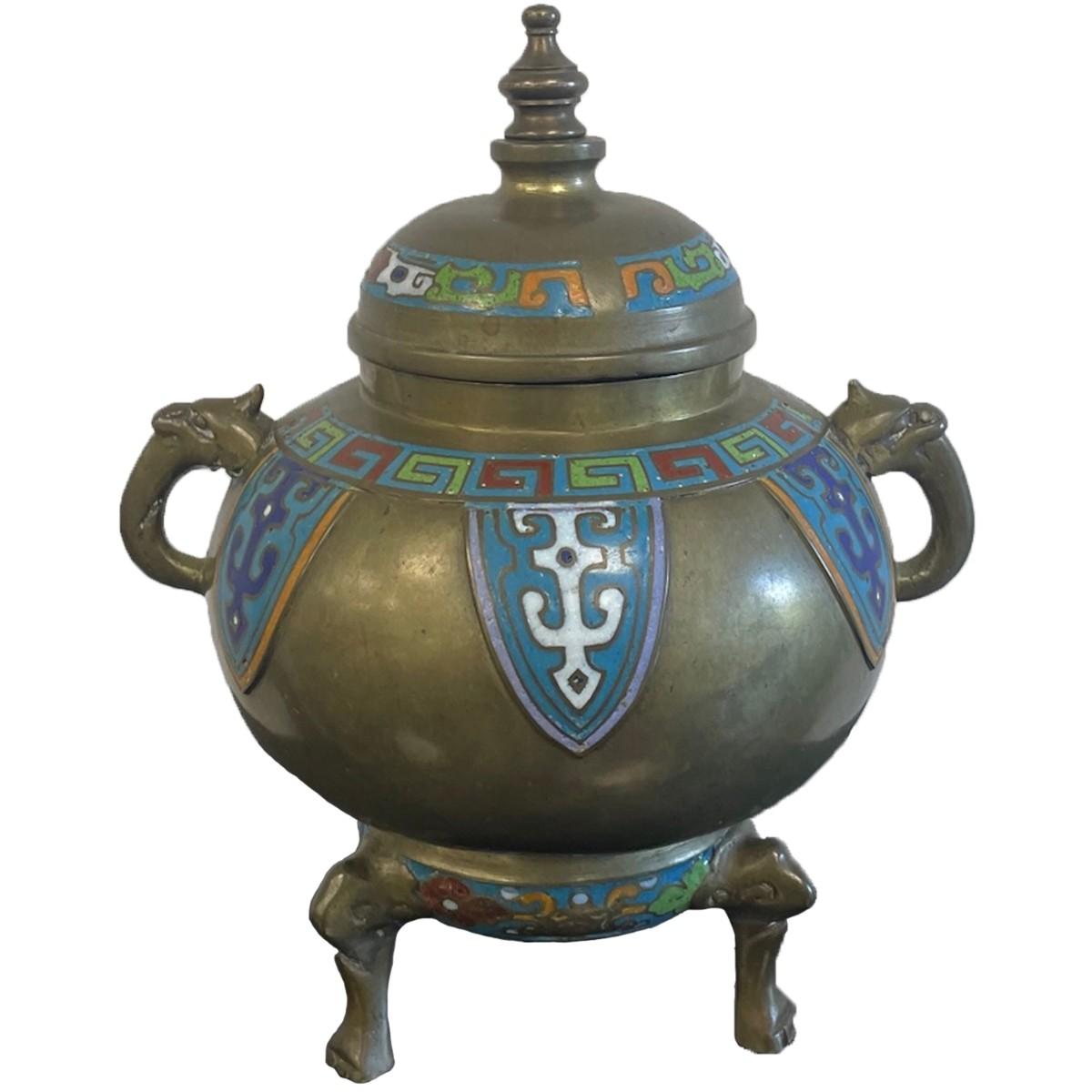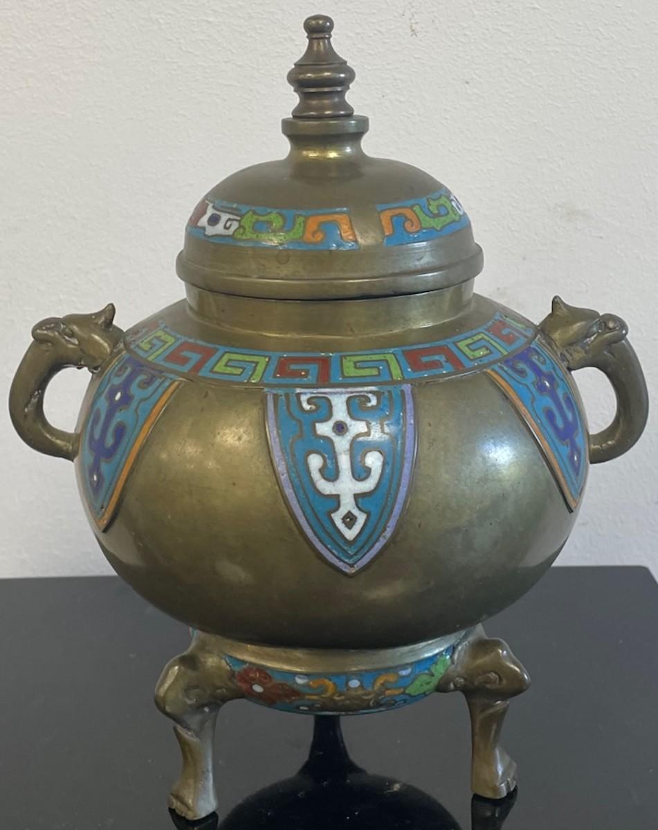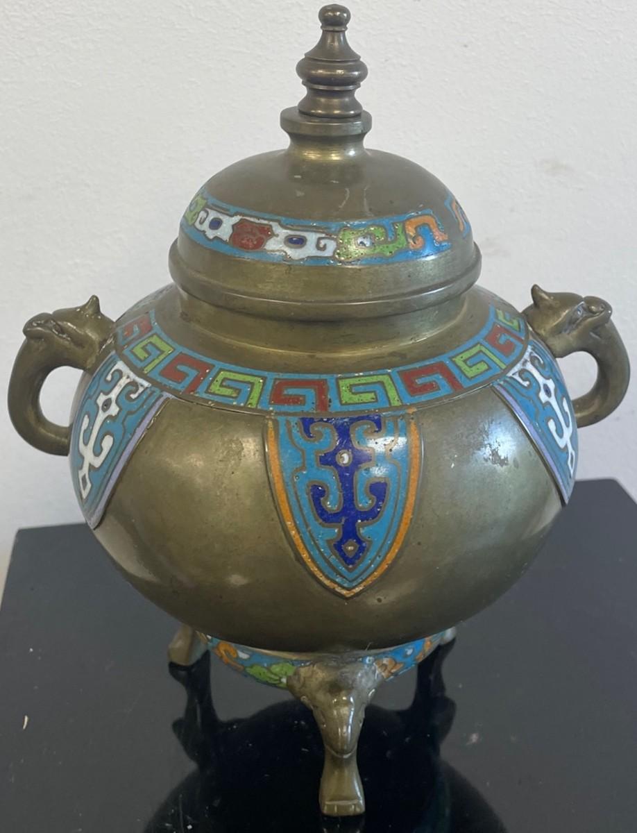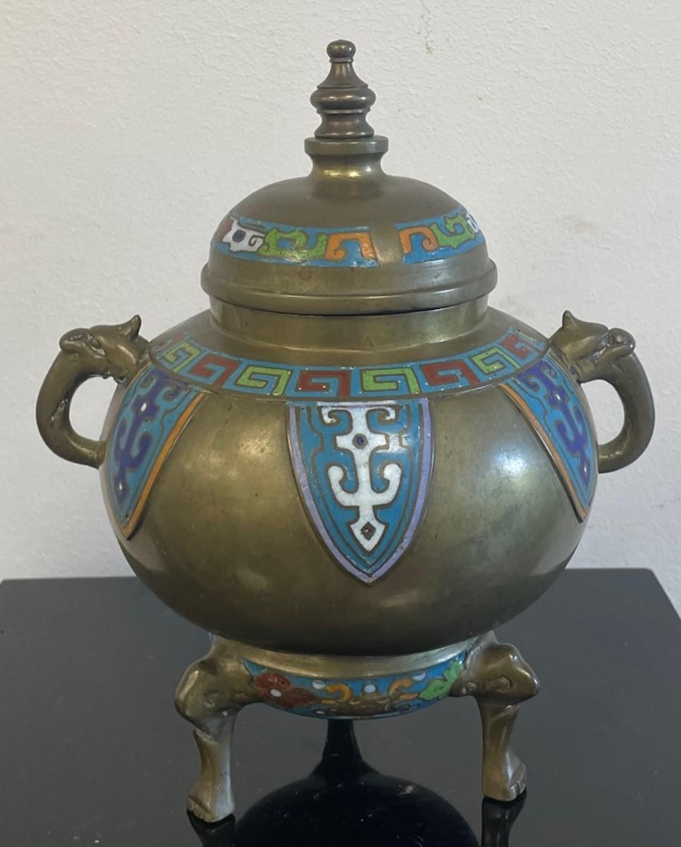 Description: 20th Century Chinese Burnt Tripod incense burner censer / cloisonné, Brass; Measurement approximate: 8"h; Material: