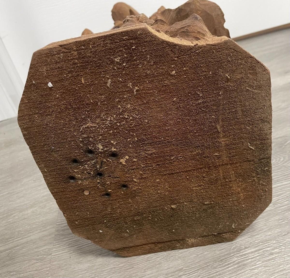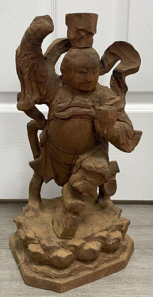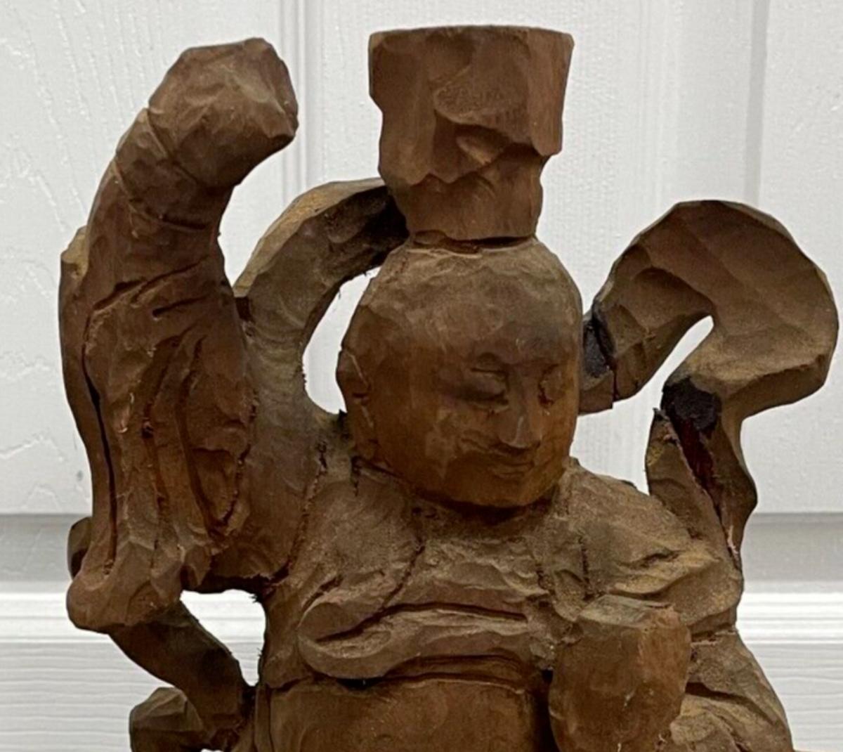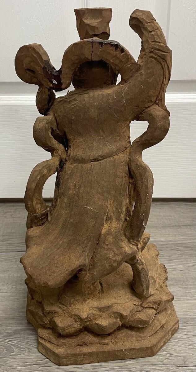 Description: This stunning hand-carved wooden statue from China is a true masterpiece. Crafted in the 20th century it features intricate details and a rich, warm brown color. Standing at 17 inches tall, this vintage original piece is a must-have for collectors of Asian antiques. The statue's primary material is wood and it is adorned with delicate carvings that showcase the region of origin. Despite its age, it is in excellent condition and will make an impressive addition to any collection. This statue is perfect for those who appreciate the beauty and craftsmanship of authentic Chinese art; Material: Wood; Measurement approximate: 17 “ H Inches; Condition: Good