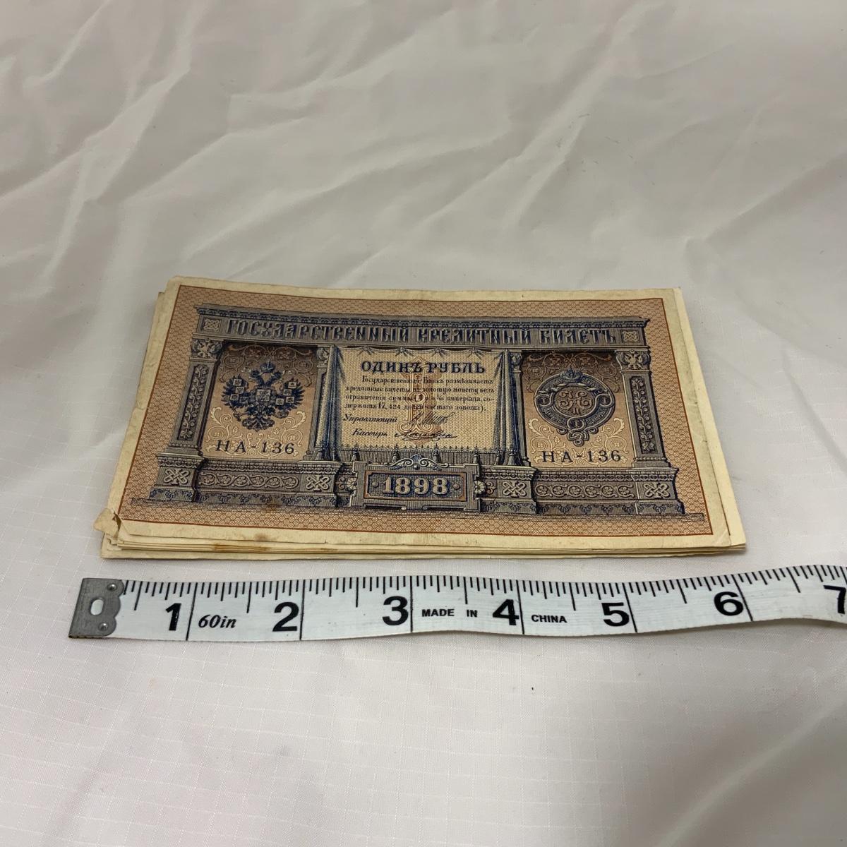 From the Estate of Peter Radovanovich: Nineteen Notes of Russian Currency dated 1898, all 1 Ruble, backed by gold. In various states of condition and circulation. Eleven of the notes have the same series number as is common with notes issued in 1915. Comes with Copy of Certificate of Authenticity. Please see photos for details and condition. ::: Shipping is available on this lot. If you require shipping you must let us know at the close of the auction. We will coordinate with you after the item has been won. Shipping fees will include insurance up to or exceeding the value of all items being mailed. If you have any questions regarding this lot please contact the auctioneer either via this website, by direct email or by phone. PICK UP TIMES and other important information can be found in the TERMS and DESCRIPTION of the auction. Please take a look for pertinent information. Thanks!
