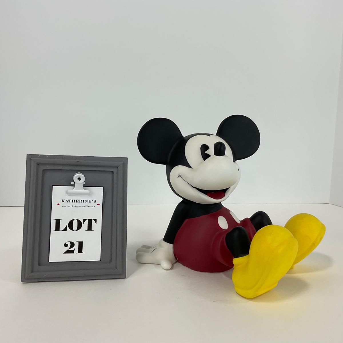 One Enesco Disney’s Mickey Mouse ceramic coin bank, appears to be in overall good shape. Please see photos for details and condition. Any condition statement is given as a courtesy to a client, is an opinion, and should not be treated as a statement of fact. Reference to condition written, oral or within a condition report shall not be regarded as a full account of condition and may not include all defects, alterations, or restorations. Absence of a condition report does not imply a lot is flawless or lacking imperfections or damage. Katherine’s Auction & Appraisal Service shall have no responsibility for any error or omission. Returns shall not be accepted on the basis of condition. ::: Shipping is available on this lot. If you require shipping you must let us know at the close of the auction. We will coordinate with you after the item has been won. Shipping fees will include insurance up to or exceeding the value of all items being mailed. If you have any questions regarding this lot please contact the auctioneer either via this website, by direct email or by phone. PICK UP TIMES and other important information can be found in the TERMS and DESCRIPTION of the auction. Please take a look for pertinent information. Thanks!