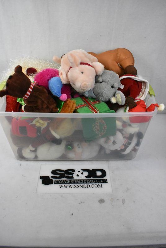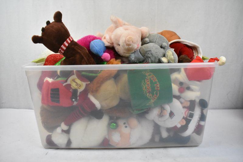 21 Holiday Stuffed Animals in CLear Bin with no lid