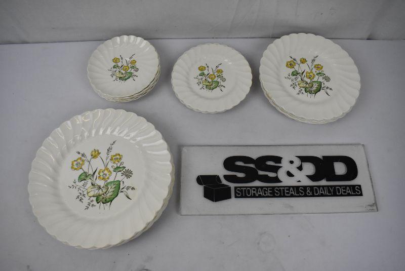 21 pc China: Myott Chatsworth, Hand Decorated, Staffordshire England: Six 9.75" plates, Six 8" plates, Four 6.25" plates, Five Saucers 5.75"