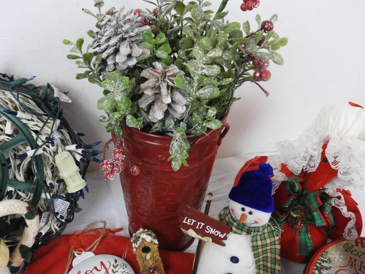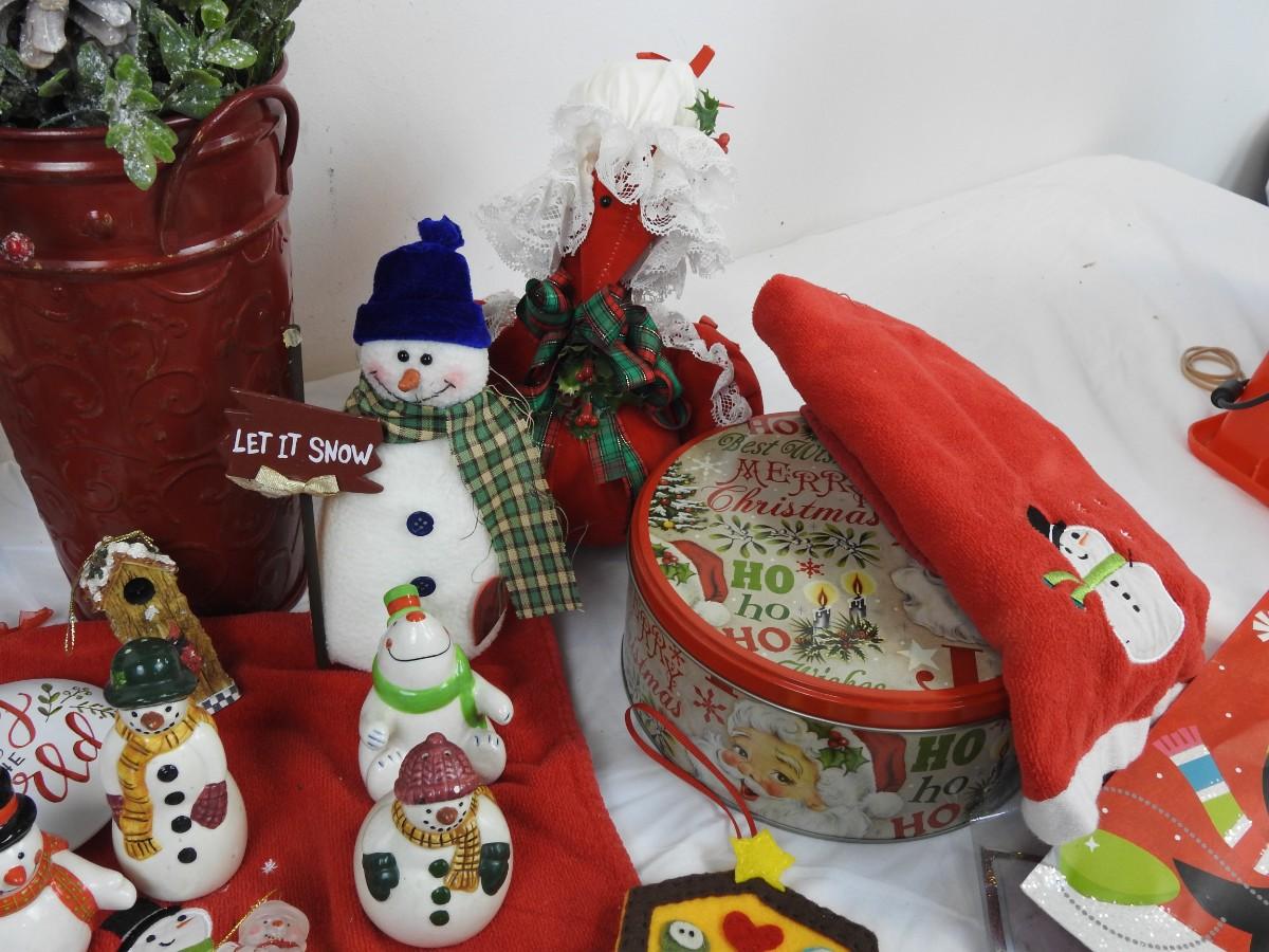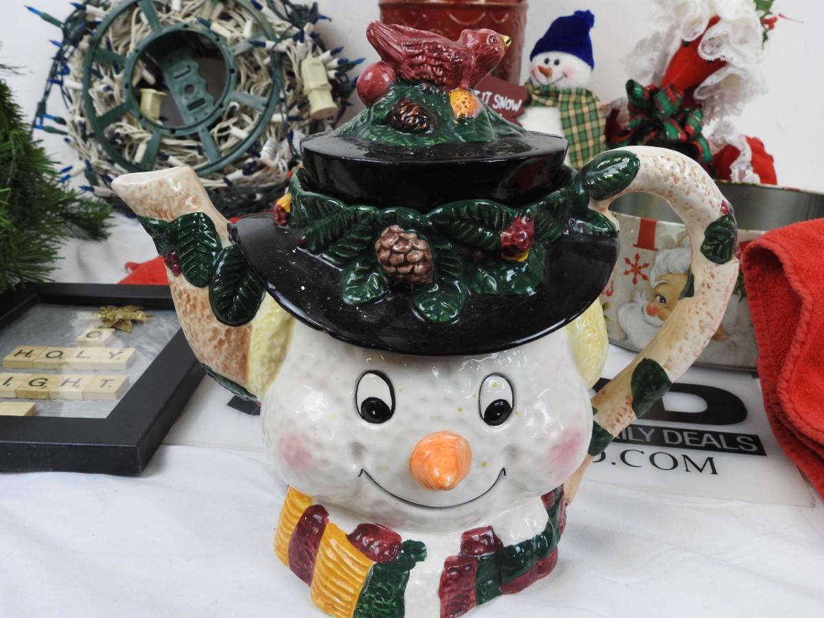 21 pc Christmas decorations: Ceramic teapot, snowmen, lights, etc