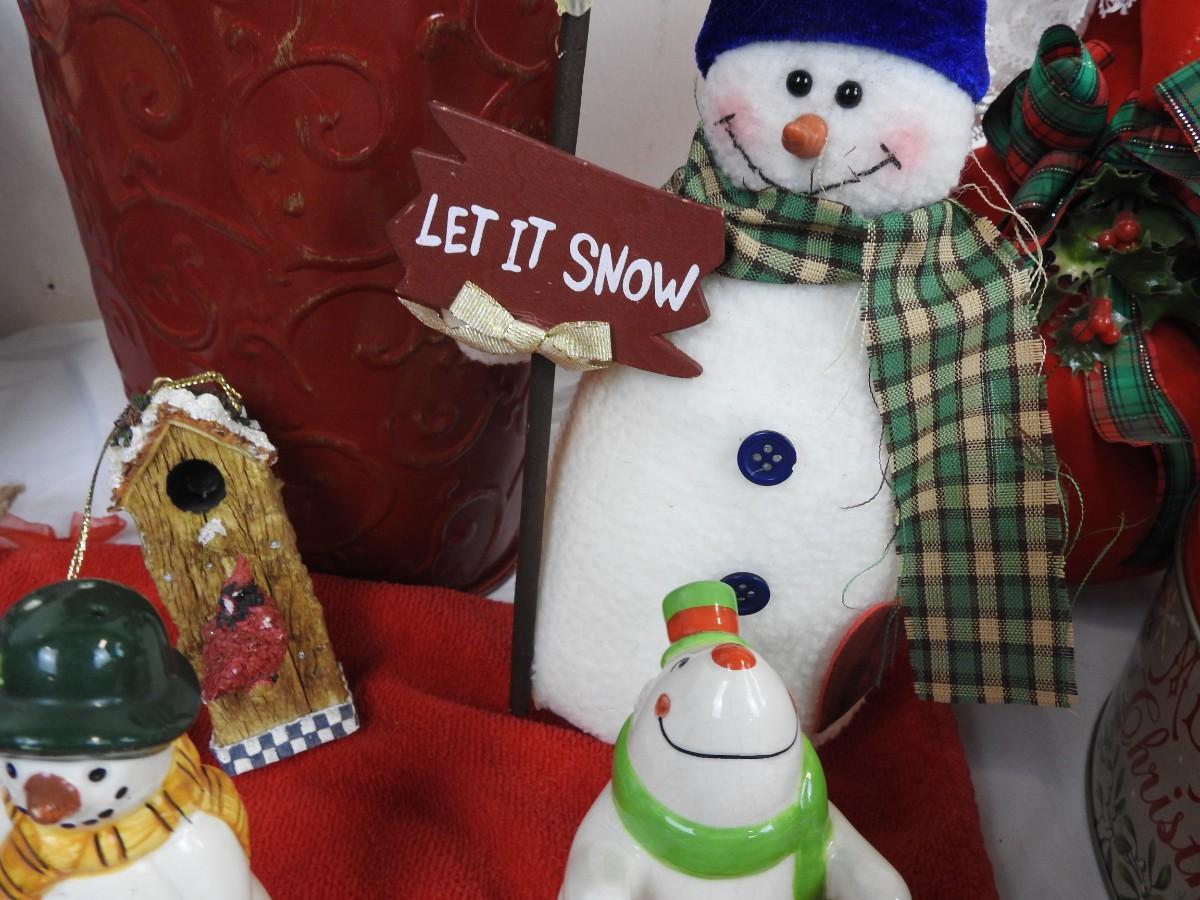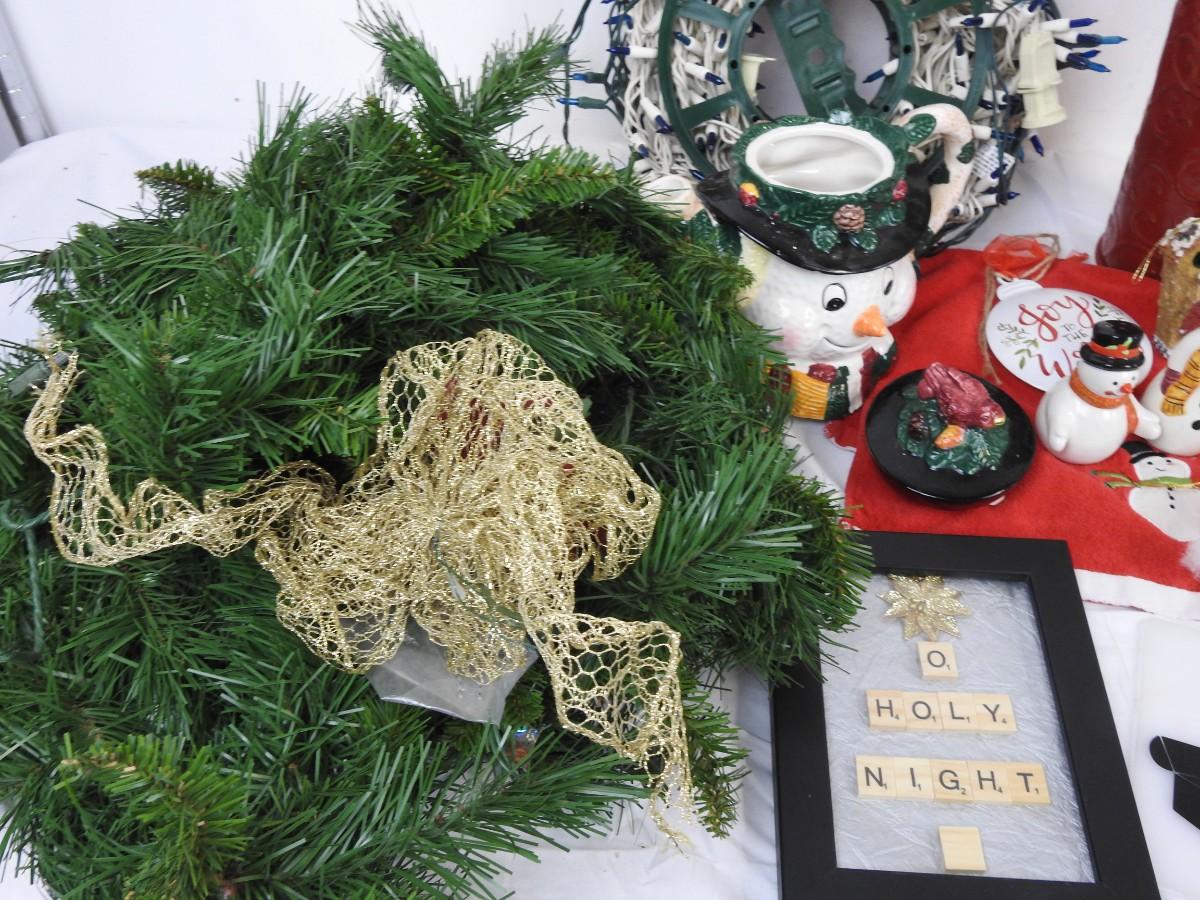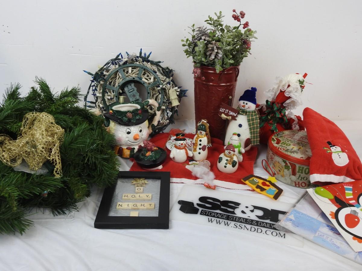 21 pc Christmas decorations: Ceramic teapot, snowmen, lights, etc