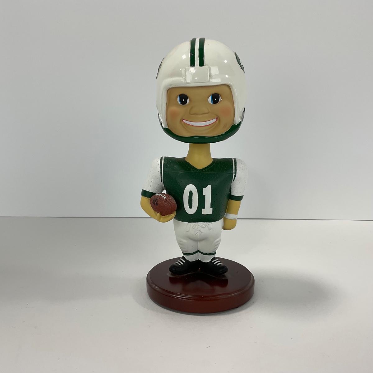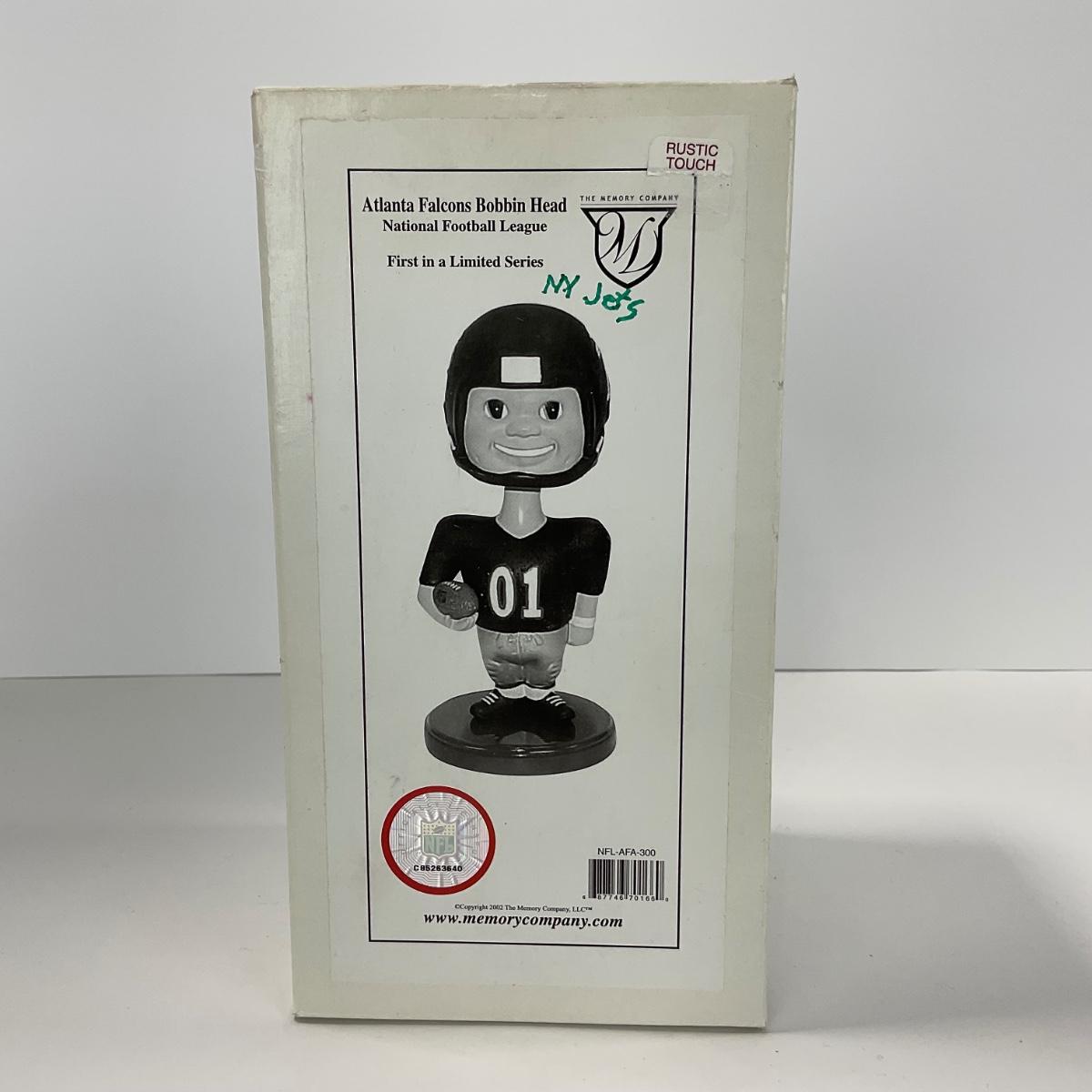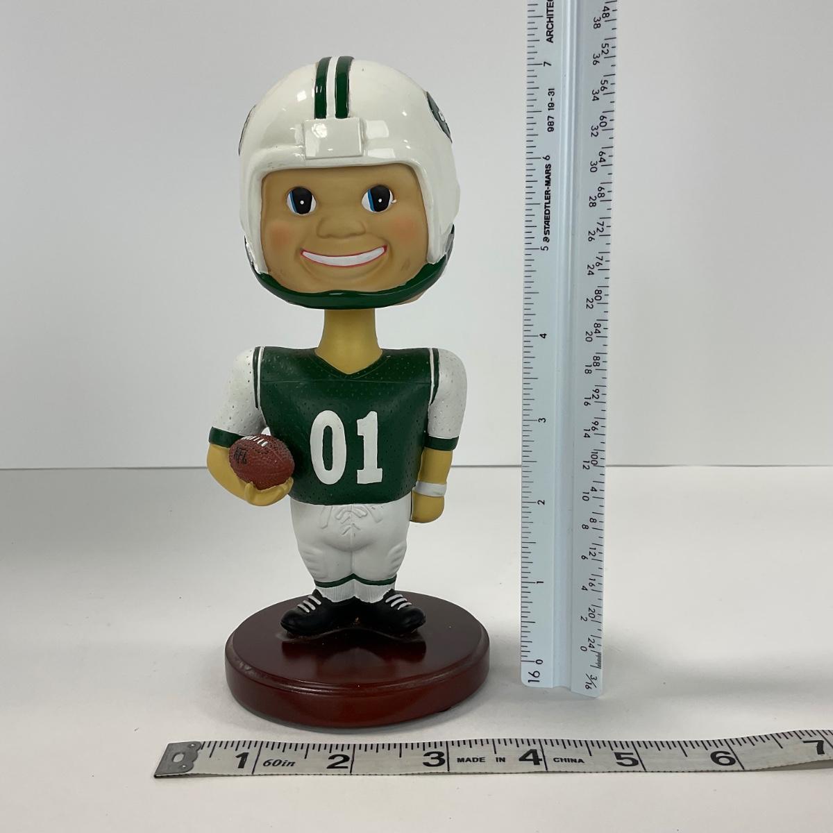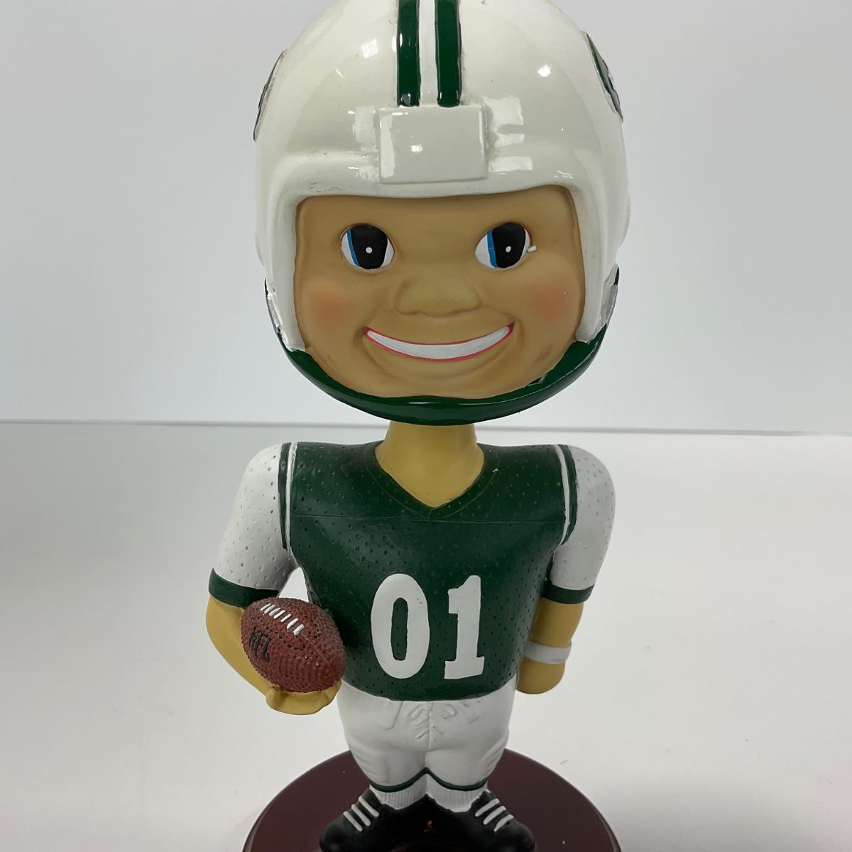 One vintage New York Jetts bobblehead, comes with a box however the box is not the correct team bobble. Box fits the Jetts bobble but is for the Atlanta Falcons not the Jetts. Please see photos for details and condition. ::: Shipping is available on this lot. If you require shipping you must let us know at the close of the auction. We will coordinate with you after the item has been won. Shipping fees will include insurance up to or exceeding the value of all items being mailed. If you have any questions regarding this lot please contact the auctioneer either via this website, by direct email or by phone. PICK UP TIMES and other important information can be found in the TERMS and DESCRIPTION of the auction. Please take a look for pertinent information. Thanks!