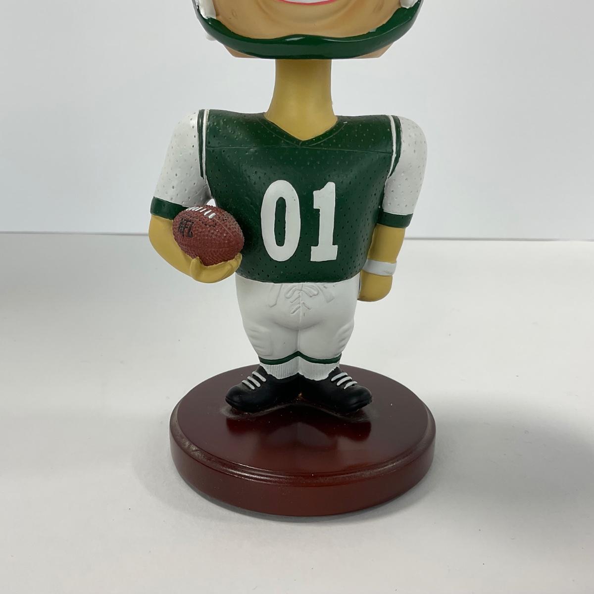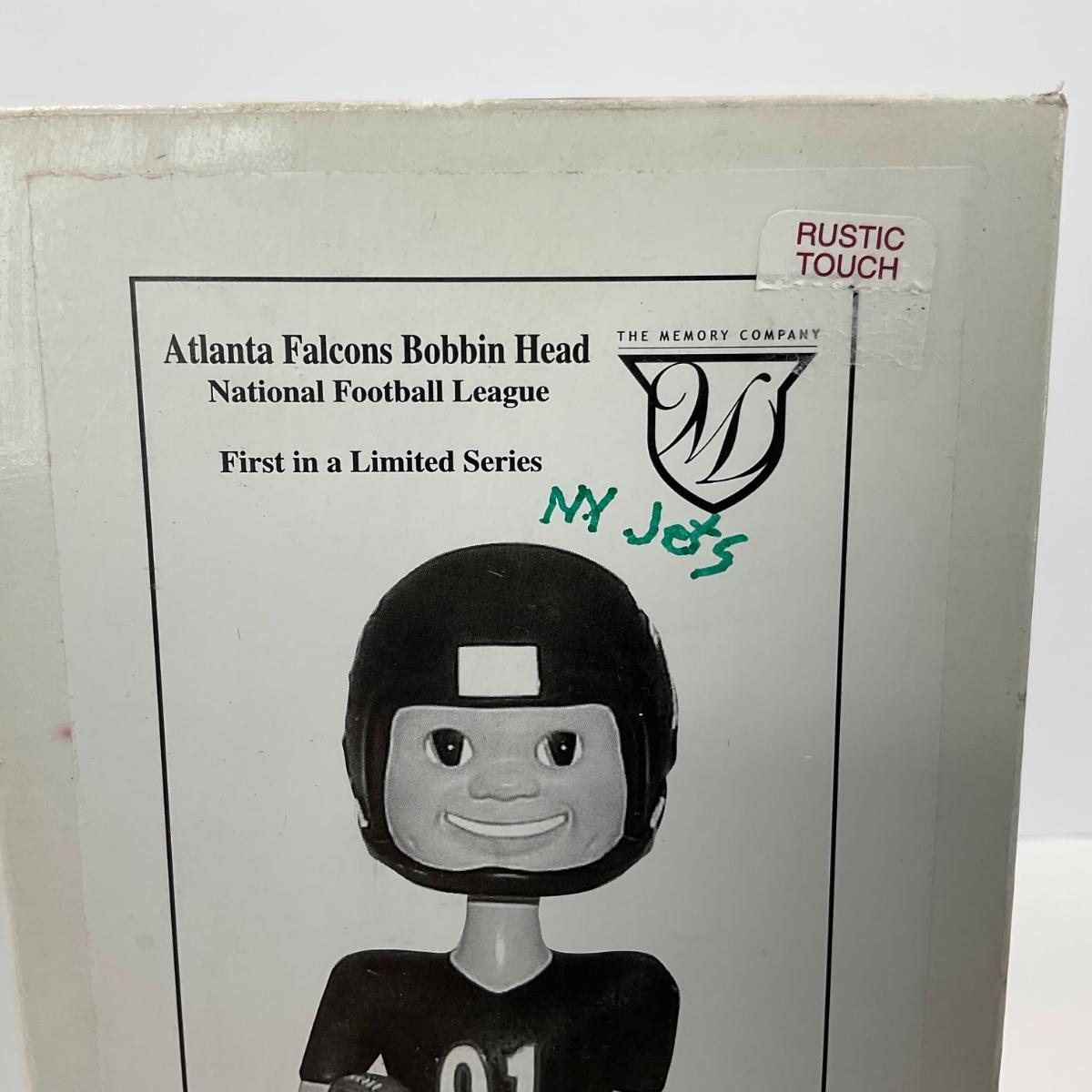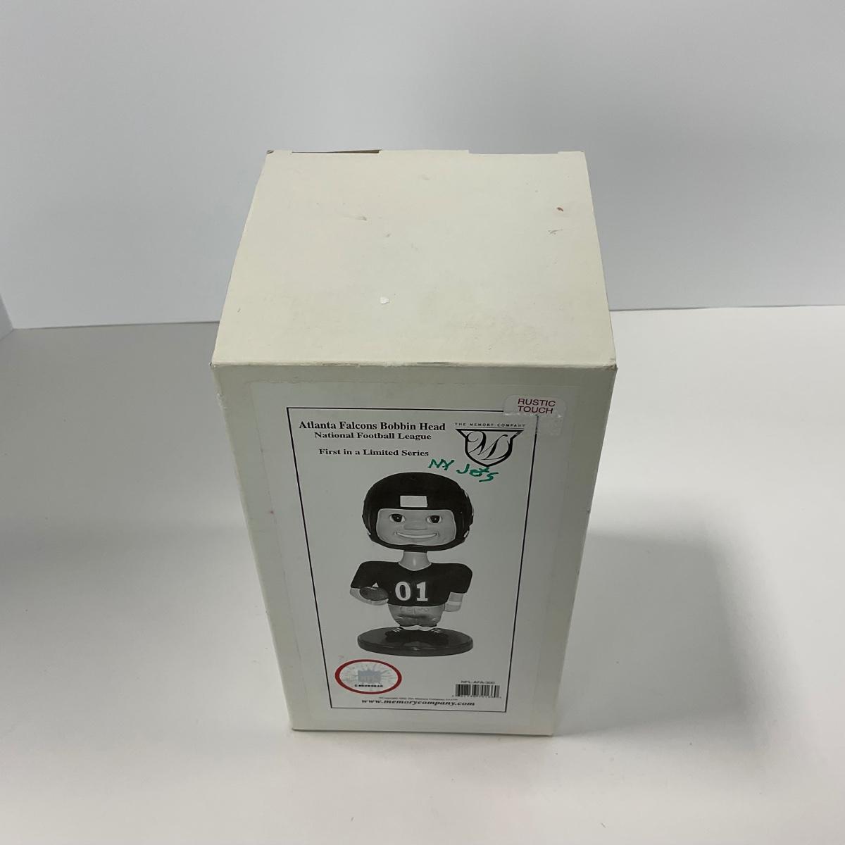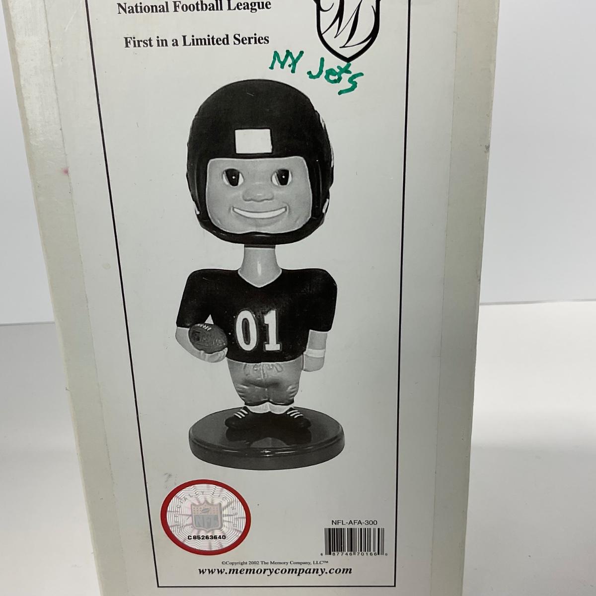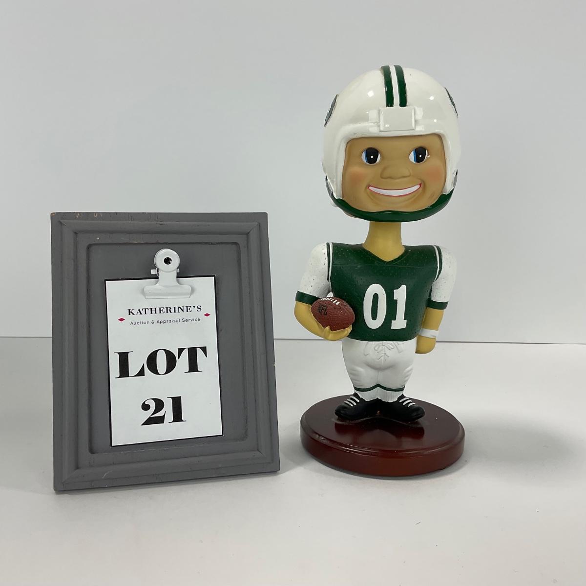 One vintage New York Jetts bobblehead, comes with a box however the box is not the correct team bobble. Box fits the Jetts bobble but is for the Atlanta Falcons not the Jetts. Please see photos for details and condition. ::: Shipping is available on this lot. If you require shipping you must let us know at the close of the auction. We will coordinate with you after the item has been won. Shipping fees will include insurance up to or exceeding the value of all items being mailed. If you have any questions regarding this lot please contact the auctioneer either via this website, by direct email or by phone. PICK UP TIMES and other important information can be found in the TERMS and DESCRIPTION of the auction. Please take a look for pertinent information. Thanks!