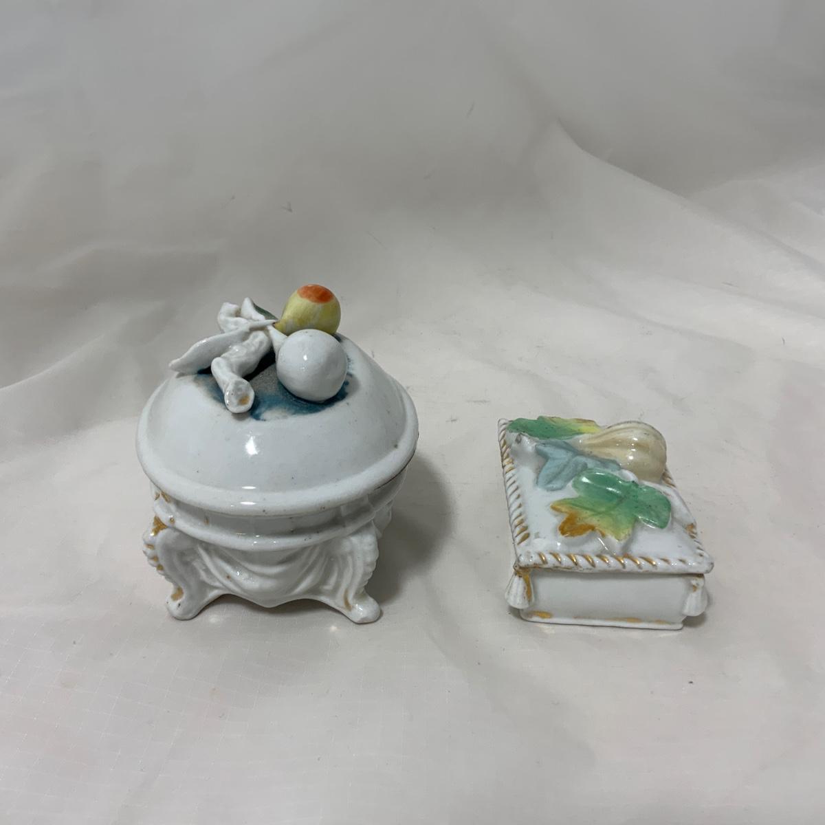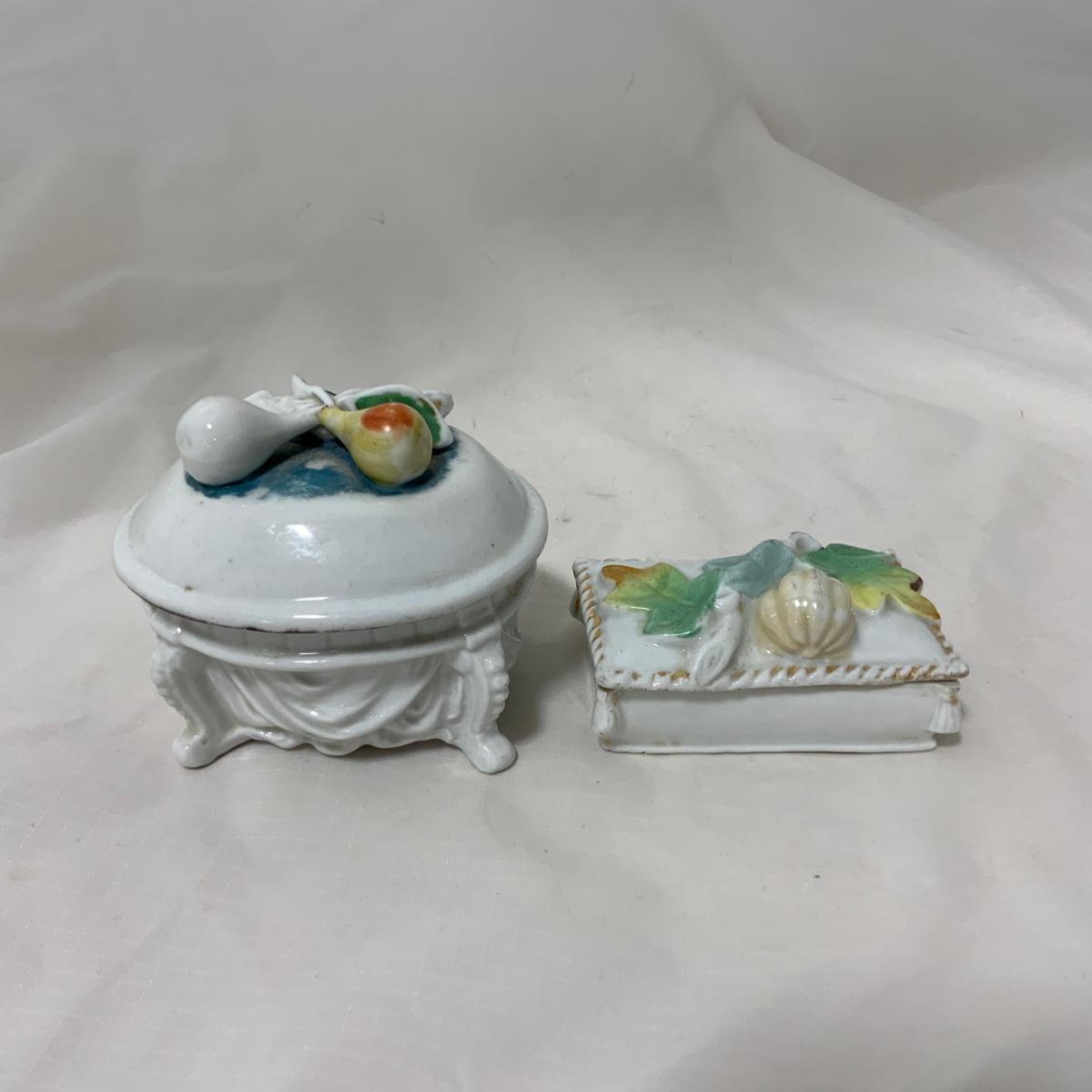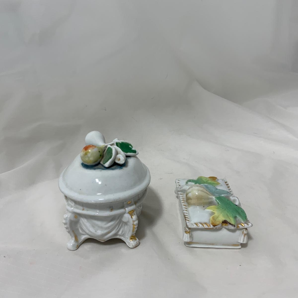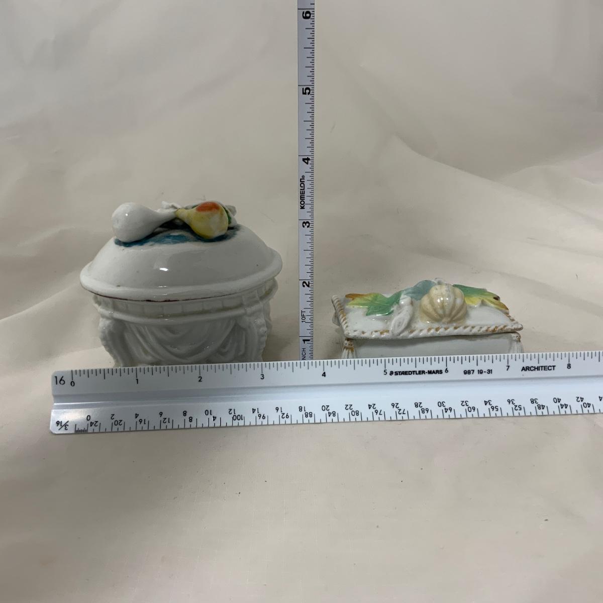 Two adorable Porcelain Fruit-Themed Trinket Boxes. Excellent for collecting or gift giving. Each of them hand painted with nice details. There is some wear on each of them, as to be expected being over 150 years old. Please see photos for details and condition. ::: Shipping is available on this lot. If you require shipping you must let us know at the close of the auction. We will coordinate with you after the item has been won. Shipping fees will include insurance up to or exceeding the value of all items being mailed. If you have any questions regarding this lot please contact the auctioneer either via this website, by direct email or by phone. PICK UP TIMES and other important information can be found in the TERMS and DESCRIPTION of the auction. Please take a look for pertinent information. Thanks!