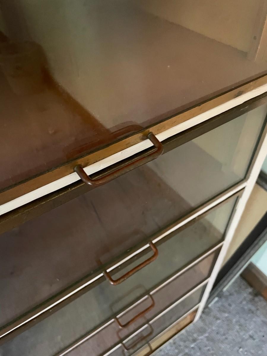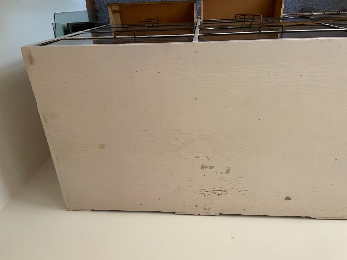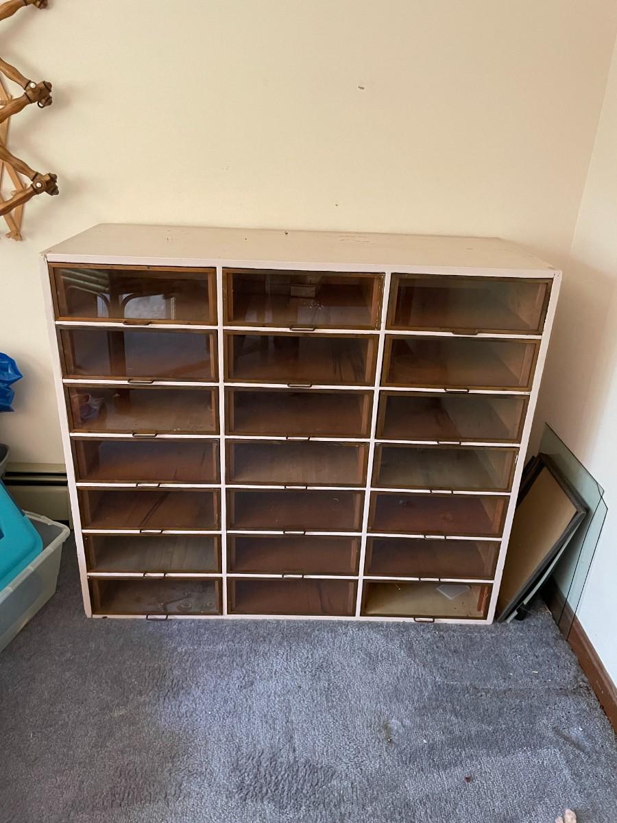 Solid wood. Perfect for storing / displaying expensive shoes / handbags or for sewing and art and crafts storage. 46L x 19W x 40 1/2H.
