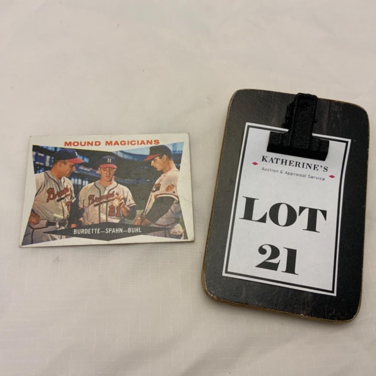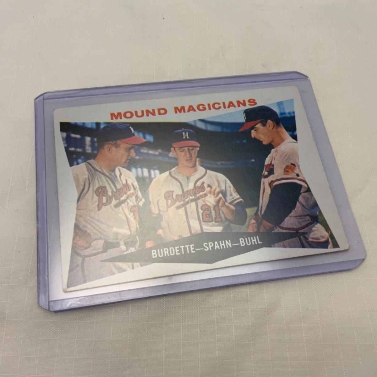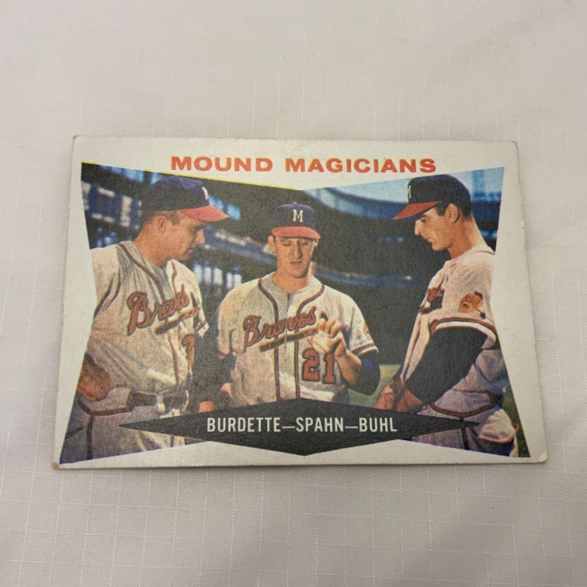 Mound Magicians! Warren Spahn, Lou Burdette and Bob Buhl - Winning Pitchers for the Milwaukee Braves. TOPPS Card #230 from the 1960 Series. Card is in Very Good/Excellent condition. Card comes from the original owners. Please see photos for details and condition. ::: Shipping is available on this lot. If you require shipping you must let us know at the close of the auction. We will coordinate with you after the item has been won. Shipping fees will include insurance up to or exceeding the value of all items being mailed. If you have any questions regarding this lot please contact the auctioneer either via this website, by direct email or by phone. PICK UP TIMES and other important information can be found in the TERMS and DESCRIPTION of the auction. Please take a look for pertinent information. Thanks!