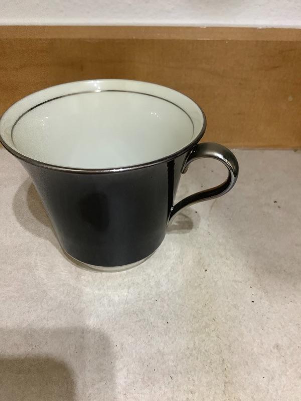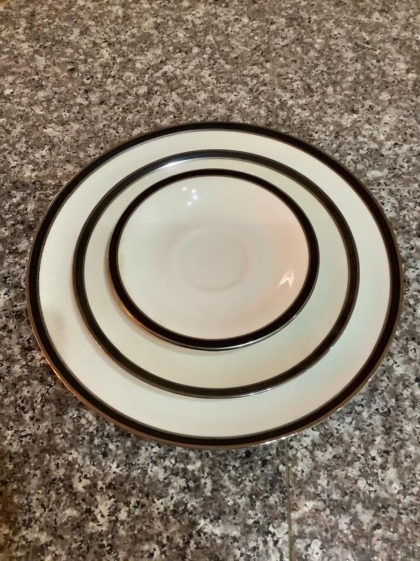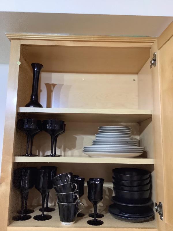 American Manor 16 Porcelain Plates/Saucers with a black Rim and matching black cups . Vintage Black glass goblets. Ceramic Bowls (4 total). Simple yet elegant and would make nice table setting.