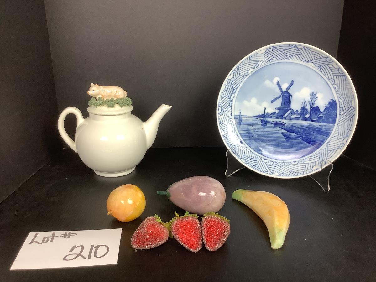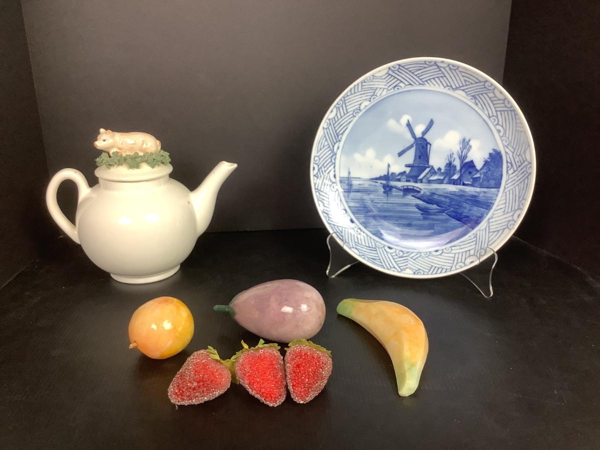 210 Delft Porcelain Plate, 1982 “ Pig “ Teapot, Marble Fruit