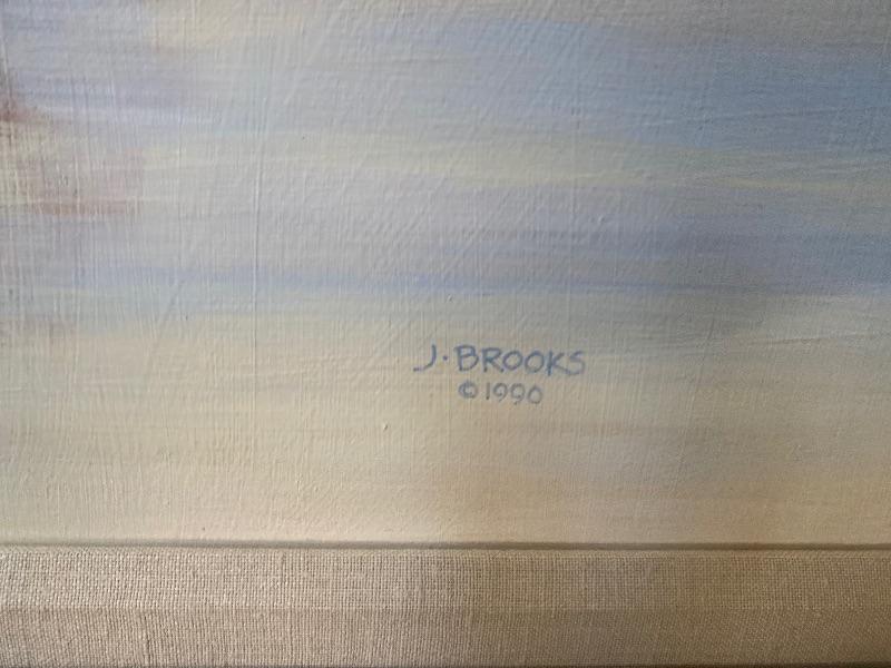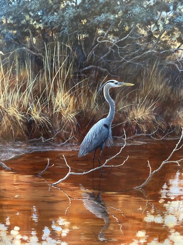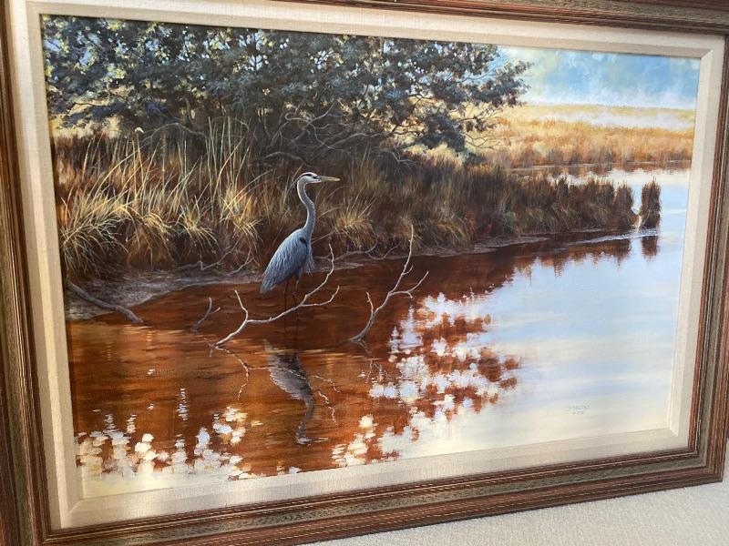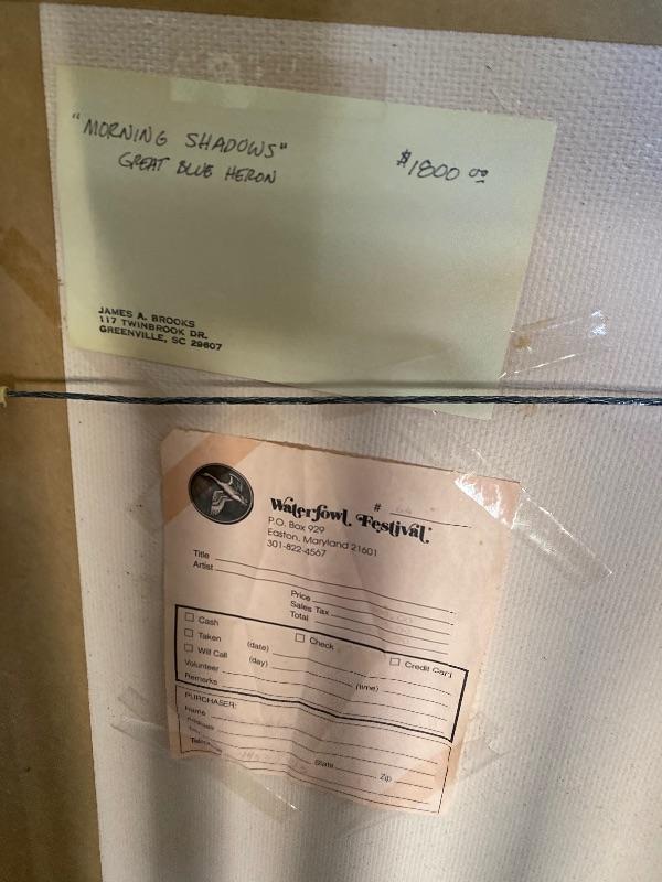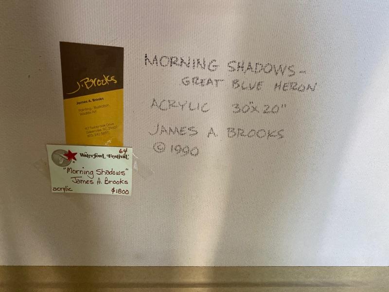 Original waterfowl acrylic painting by James A. Brooks Copyright 1990 titled “Morning Shadows”of a great blue heron wonderful condition , great detail frame measures 25.5” x 35.5”