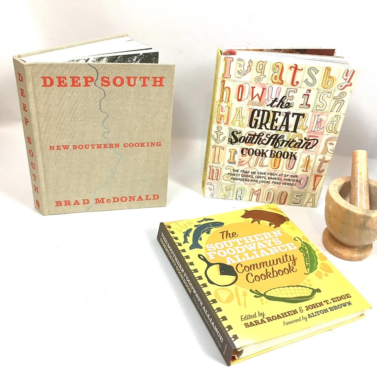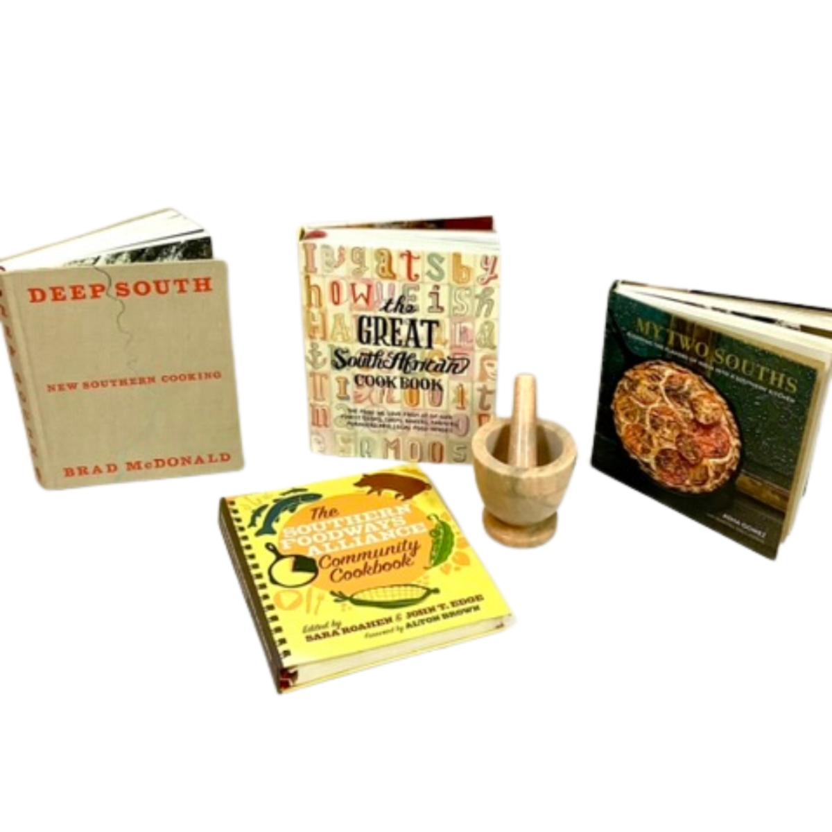 Celebrate Southern cuisine with this collection of four cookbooks and a wooden mortar and pestle. This set provides recipes and stories that capture the essence of Southern hospitality and culinary tradition. From classic recipes to innovative takes on Southern fare, these books are a must-have for any home cook or collector.
