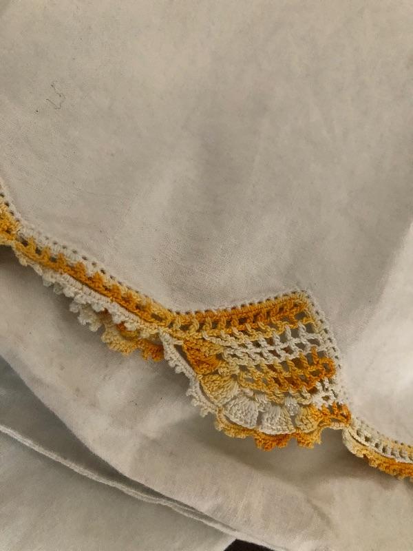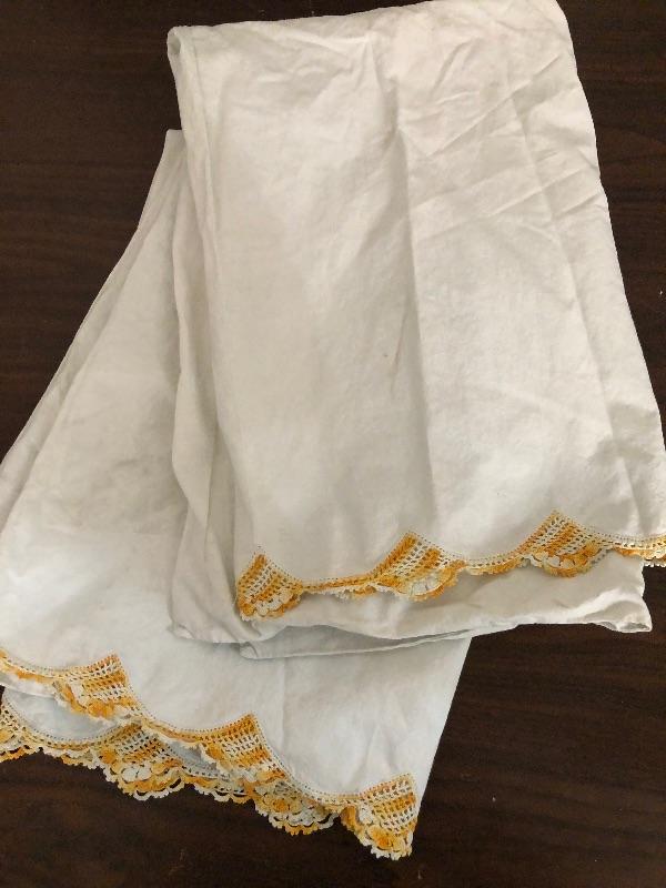 Two vintage standard size shams with orange crochet trim used condition. This is an ONSITE Auction all items will need to be picked up on location. Please see auction description for pick up procedures.