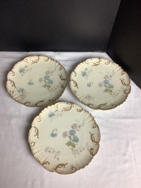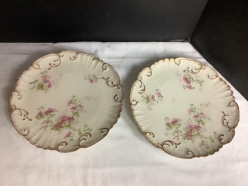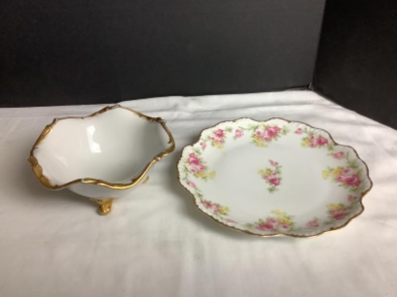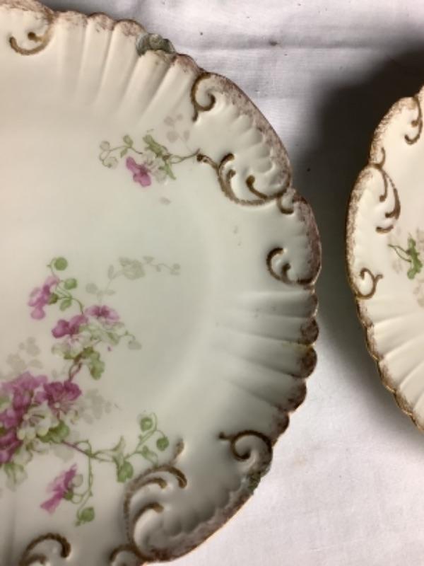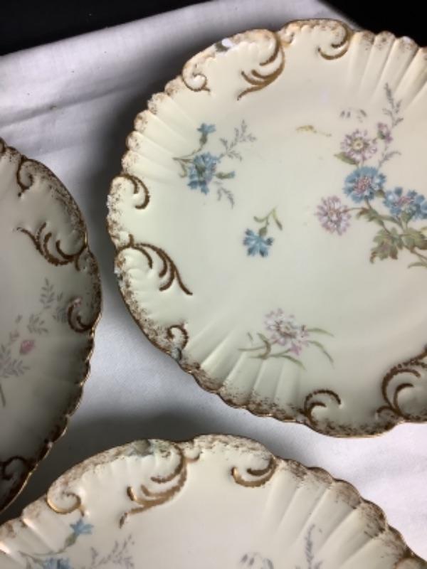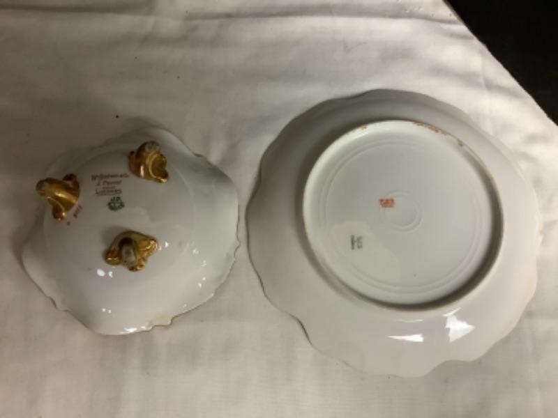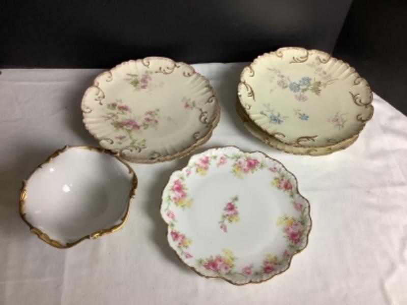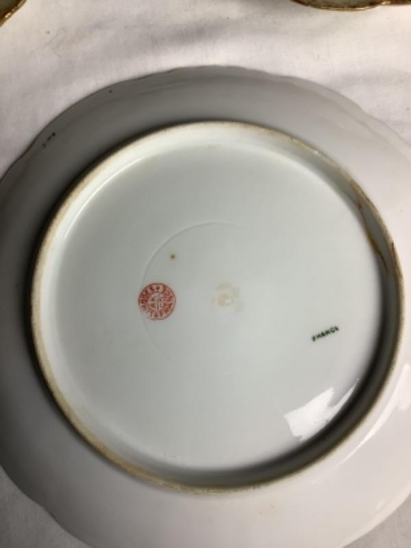Five 8” Limoges hand painted decorative plates, some have small chips (see photos) and one Limoges hand painted footed bowl