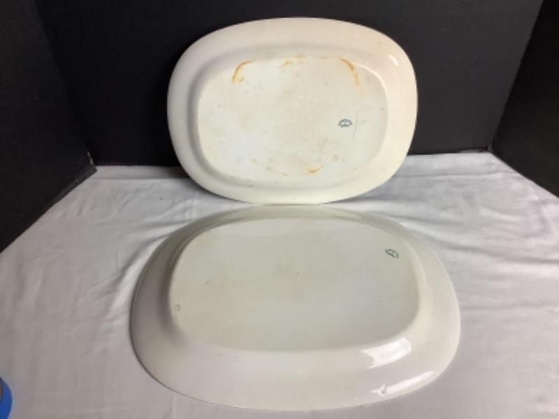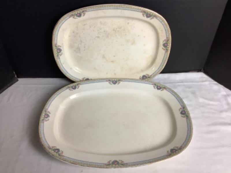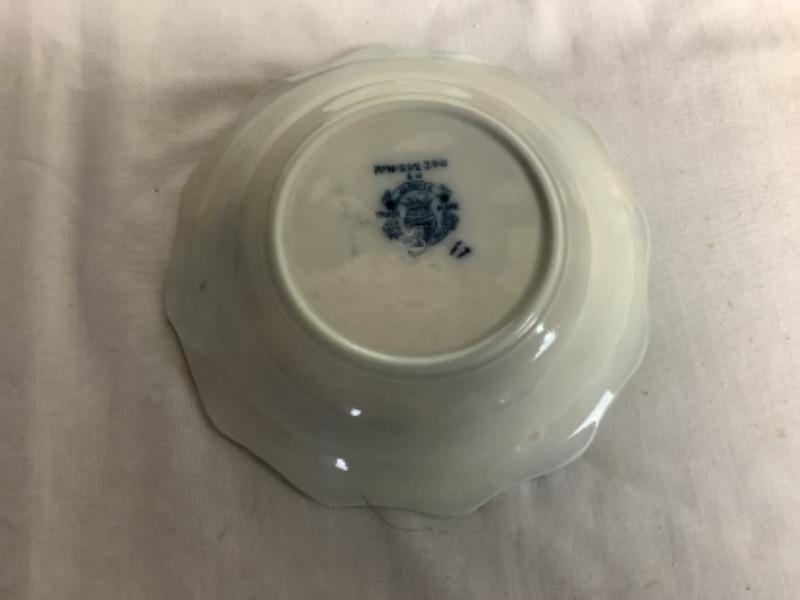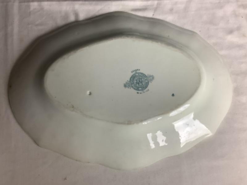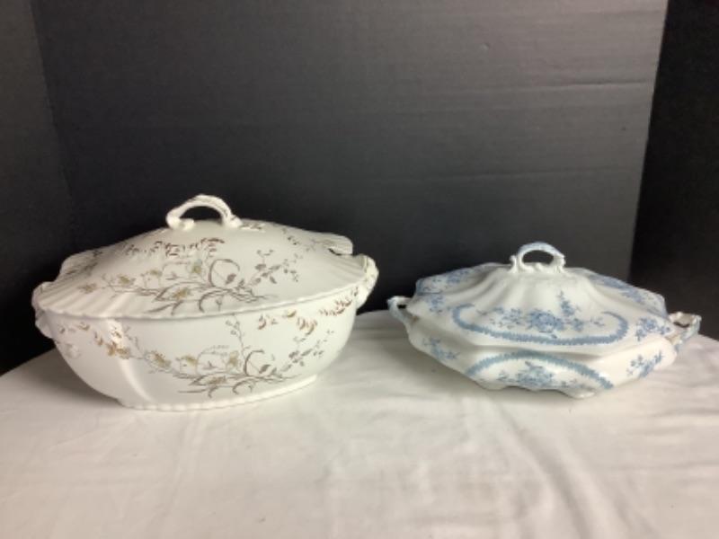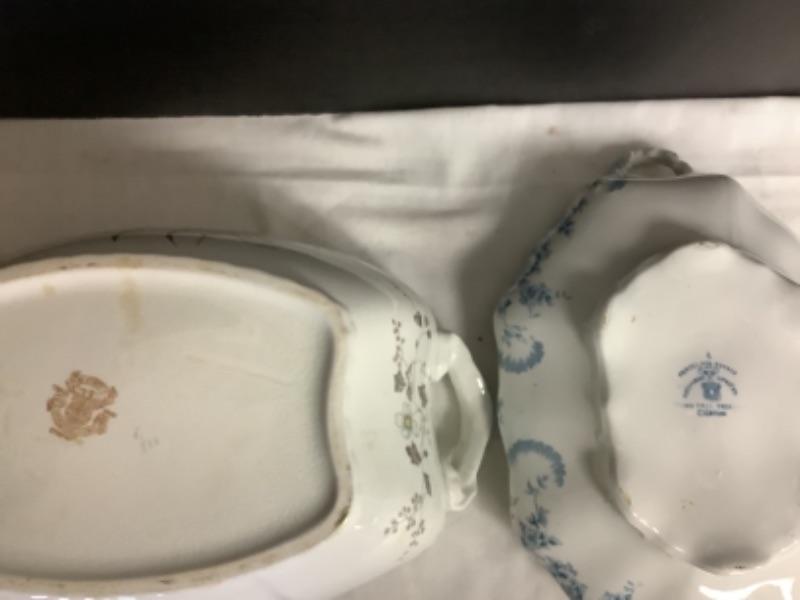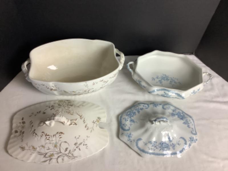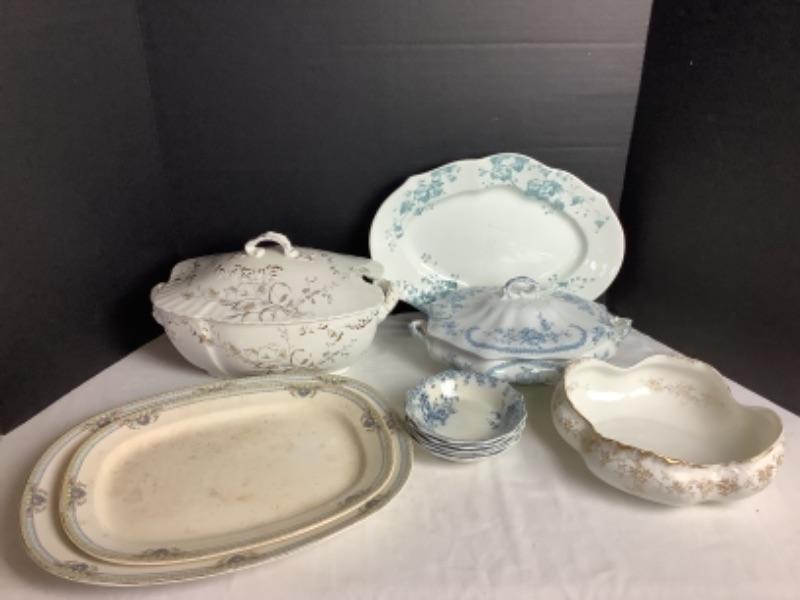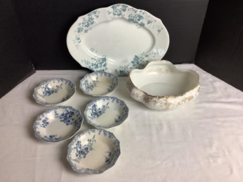 Clifton Tunstall England Tureen with lid (no ladle) measures 13”x7-1/2”x 4-1/2” deep, 5 -W.H. Grindley Janette Flow Blue Berry Bowls 5” round x 3/4” deep some crazing and discoloration due to age, Syracuse China serving dish measuring 8-1/2” x 7-1/2” x 3-1/2” deep, Colonial Pottery platter 13-1/2” x 10” and 2- Carrollton China floral rim platters measuring 15” x 11-1/2” and 13” x 10”, smaller platter has some crazing and discoloration