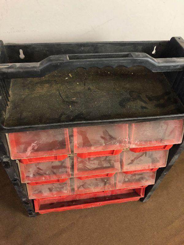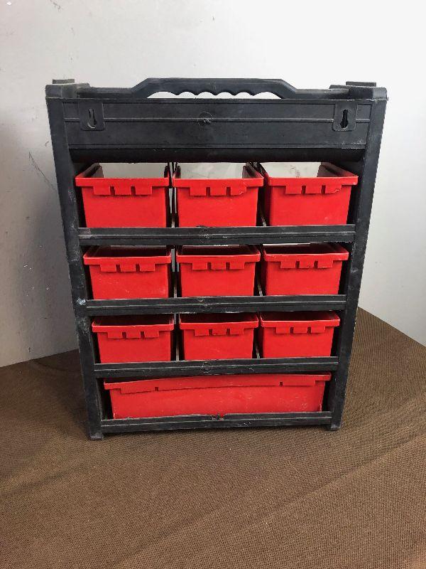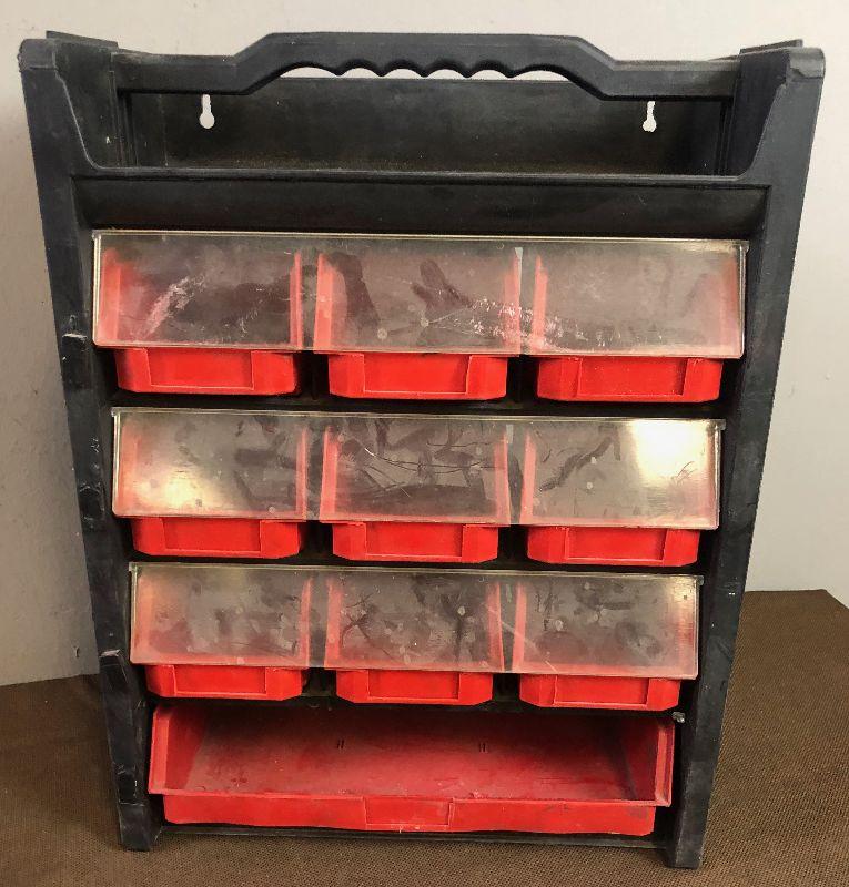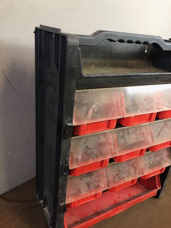 Used - a bit dirty, but super useful for garage, crafts, crafting, Parts. Hangs on the wall or free stands 14 x 8 x 19